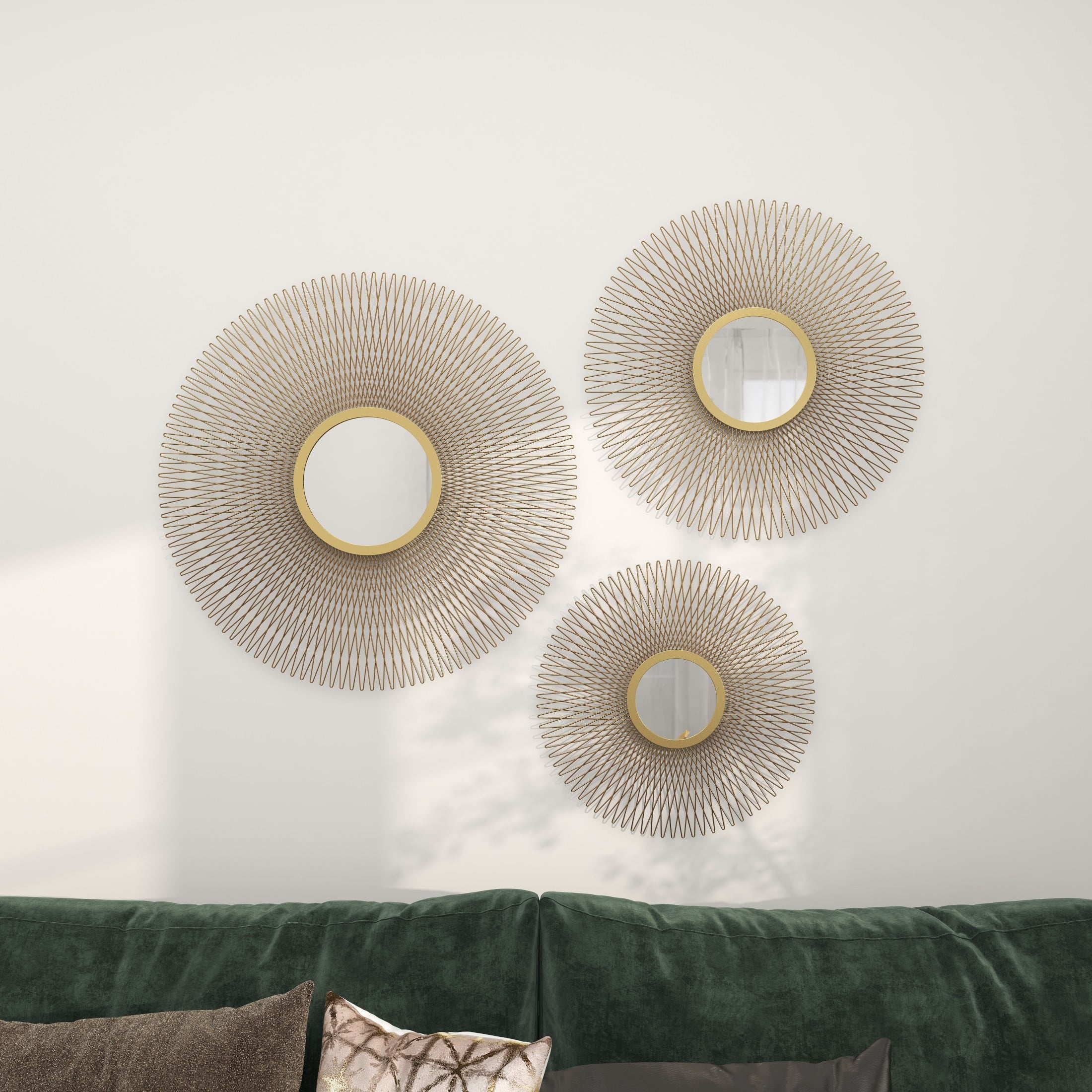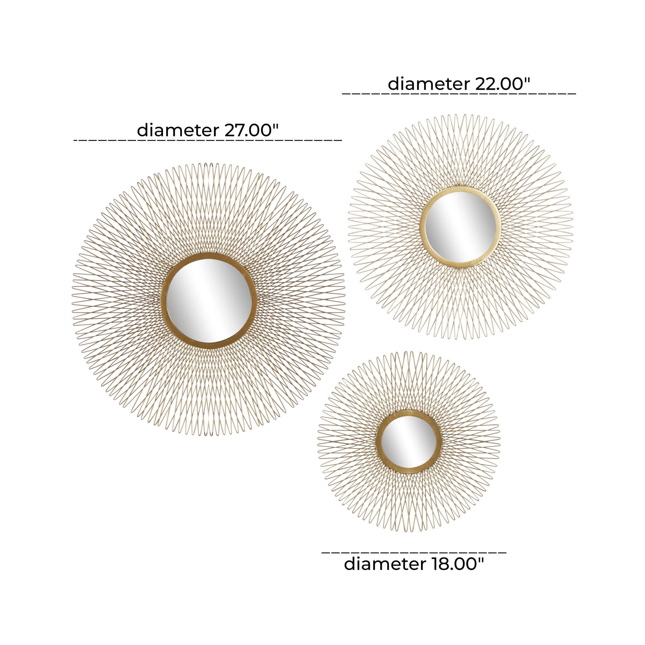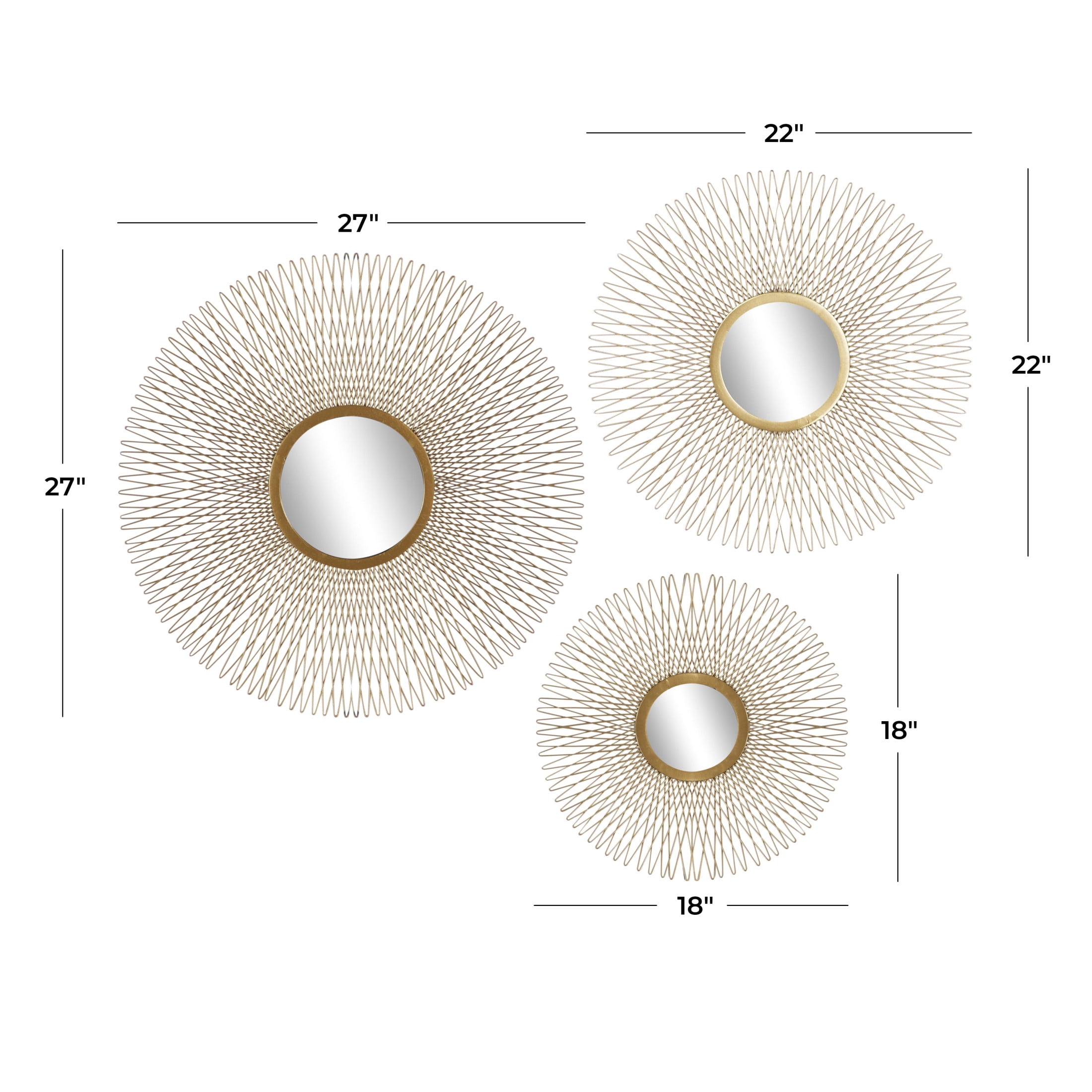 Indulge in the glamorous luxury of plush textures, dazzling details, and sleek finishes to elevate your home and add a sophisticated flair Constructed from solid tin and reflective mirror with an MDF backing, this gold home wall decor set is both sturdy and stylish Round decor set for wall features a polished gold metal finish, brilliantly reflecting light off the mirrored surface This tin set of 3 wall decors includes a sunburst effect, creating a unique and mesmerizing focal point in any space Each gold metal wall mirror measures 18L x 1W x 18H , 22L x 1W x 22H , 27L x 1W x 27H inches, and collectively weighs 12.63 lbs Polished gold wall art set for living room showcases a round shape with a bursting effect that creates an intriguing textural design Wipe clean with a dry cloth Each piece of this glam set of 3 room wall decors is meticulously crafted from welded metal attached to the mirror, showcasing its high-quality construction Glam style DecMode 18″, 22″, 27″D Gold Sunburst Wall Mirror with Mirrored Accent, Set of 3 makes a perfect addition to any home