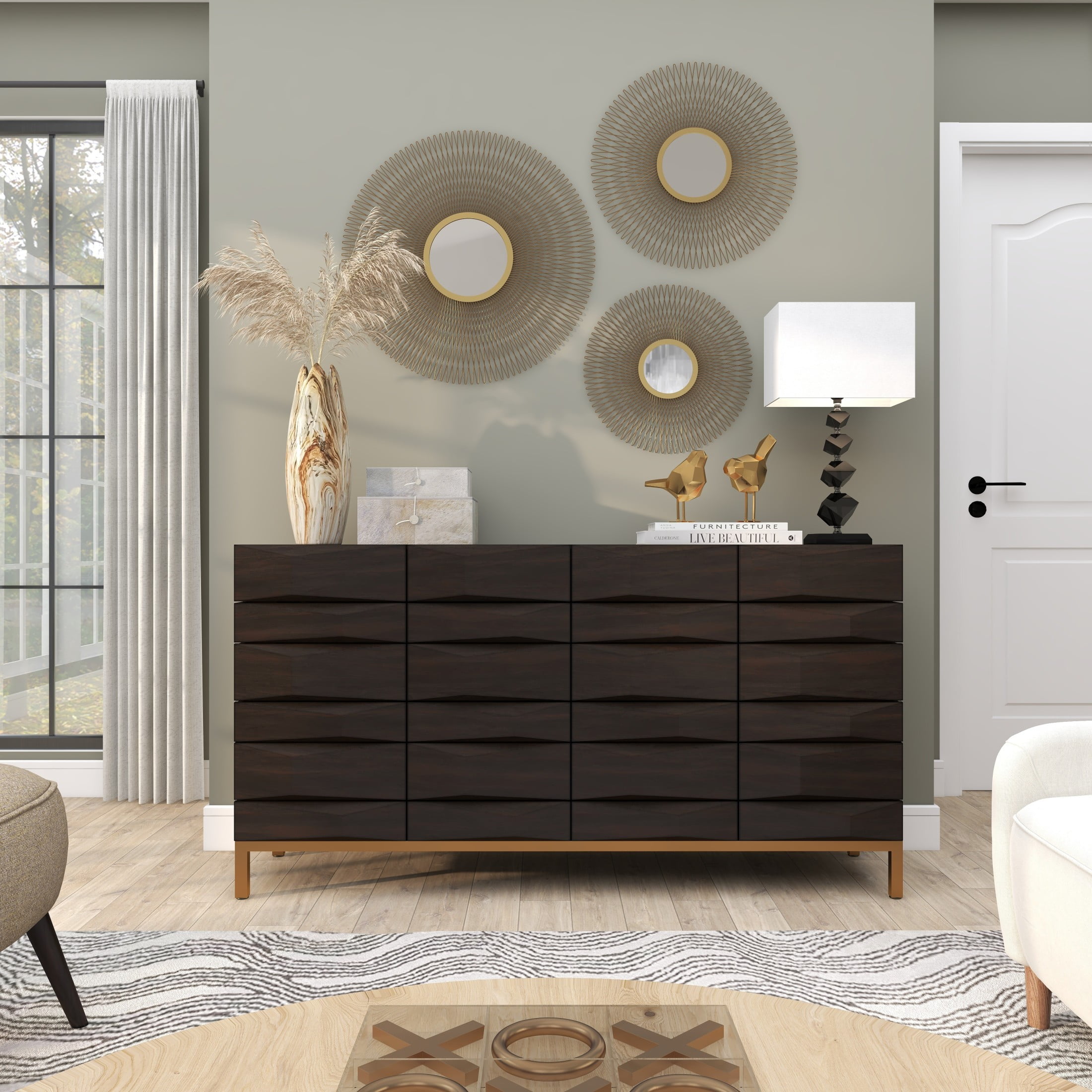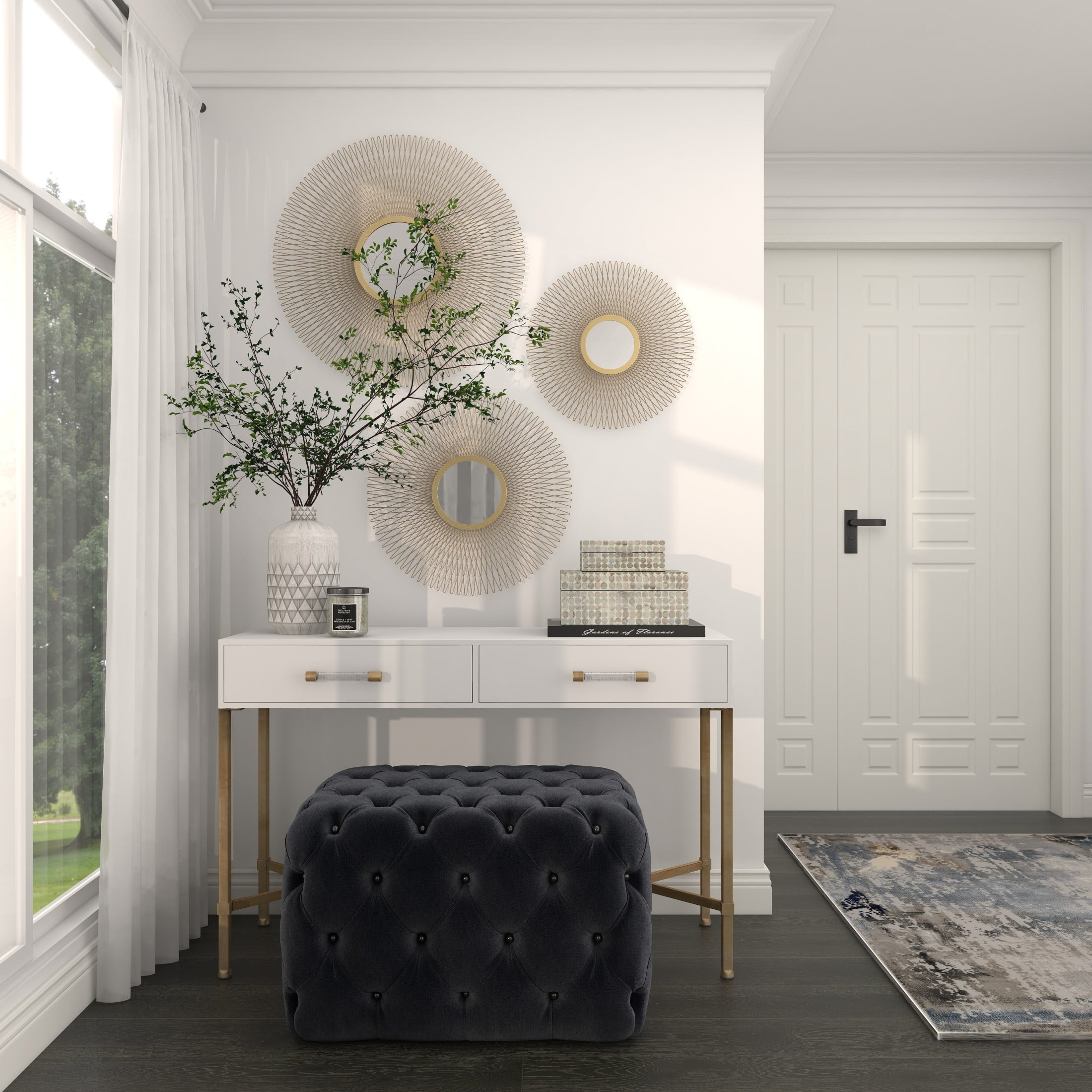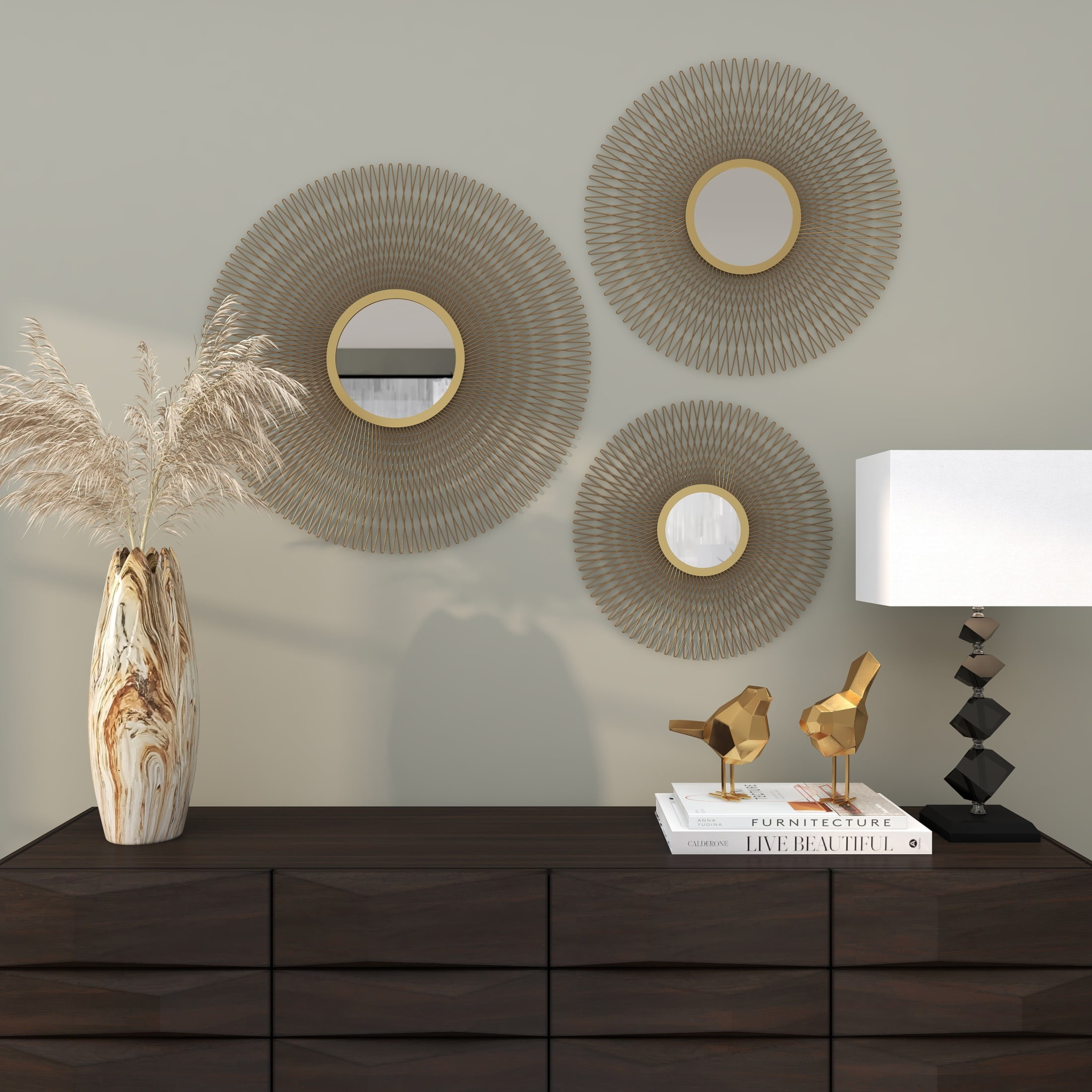 Indulge in the glamorous luxury of plush textures, dazzling details, and sleek finishes to elevate your home and add a sophisticated flair Constructed from solid tin and reflective mirror with an MDF backing, this gold home wall decor set is both sturdy and stylish Round decor set for wall features a polished gold metal finish, brilliantly reflecting light off the mirrored surface This tin set of 3 wall decors includes a sunburst effect, creating a unique and mesmerizing focal point in any space Each gold metal wall mirror measures 18L x 1W x 18H , 22L x 1W x 22H , 27L x 1W x 27H inches, and collectively weighs 12.63 lbs Polished gold wall art set for living room showcases a round shape with a bursting effect that creates an intriguing textural design Wipe clean with a dry cloth Each piece of this glam set of 3 room wall decors is meticulously crafted from welded metal attached to the mirror, showcasing its high-quality construction Glam style DecMode 18″, 22″, 27″D Gold Sunburst Wall Mirror with Mirrored Accent, Set of 3 makes a perfect addition to any home