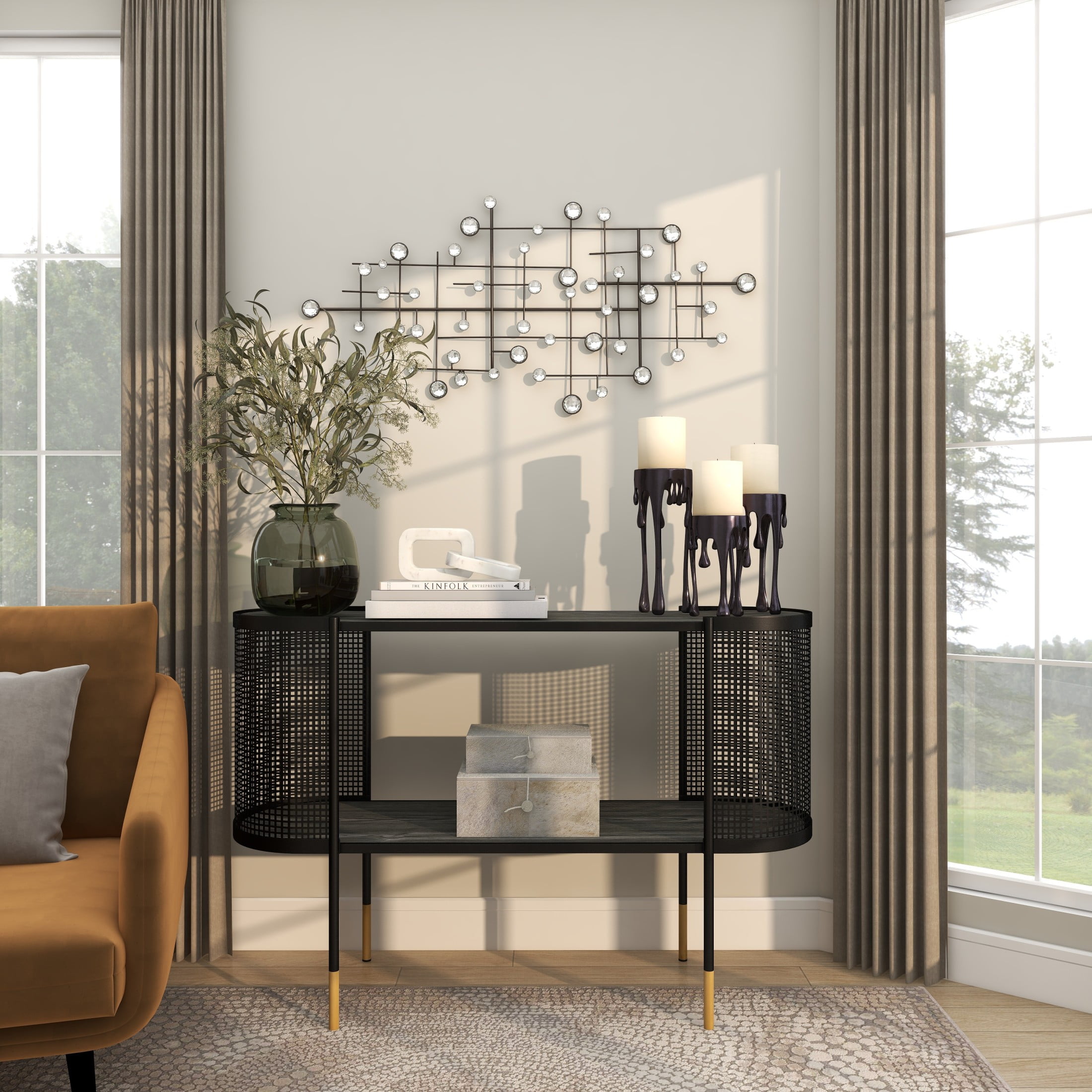 Indulge in the glamorous luxury of plush textures, dazzling details, and sleek finishes to elevate your home and add a sophisticated flair This silver home wall decor is an abstract geometric art piece, skillfully crafted from metal and adorned with sparkling acrylic elements Oval decor for walls boasts a glossy silver finish on its iron bars, while the crystal embellishments shimmer with transparency Iron wall decor features overlapping metal bars and is further enhanced by glass beads at each end The silver metal wall decor measures 20L x 1W x 42H inches, and weighs 5.50 lbs Glossy silver wall art for living room showcases a unique abstract shape frame, which is complemented by clear round glass beads for a chic aesthetic Wipe clean with a dry cloth Each material used in this glam room wall decor has been meticulously crafted, with the glass beads encased within round metal frames to add a touch of glamour Glam style DecMode Silver Metal Abstract Wall Decor with Crystal Embellishments makes a perfect addition to any home