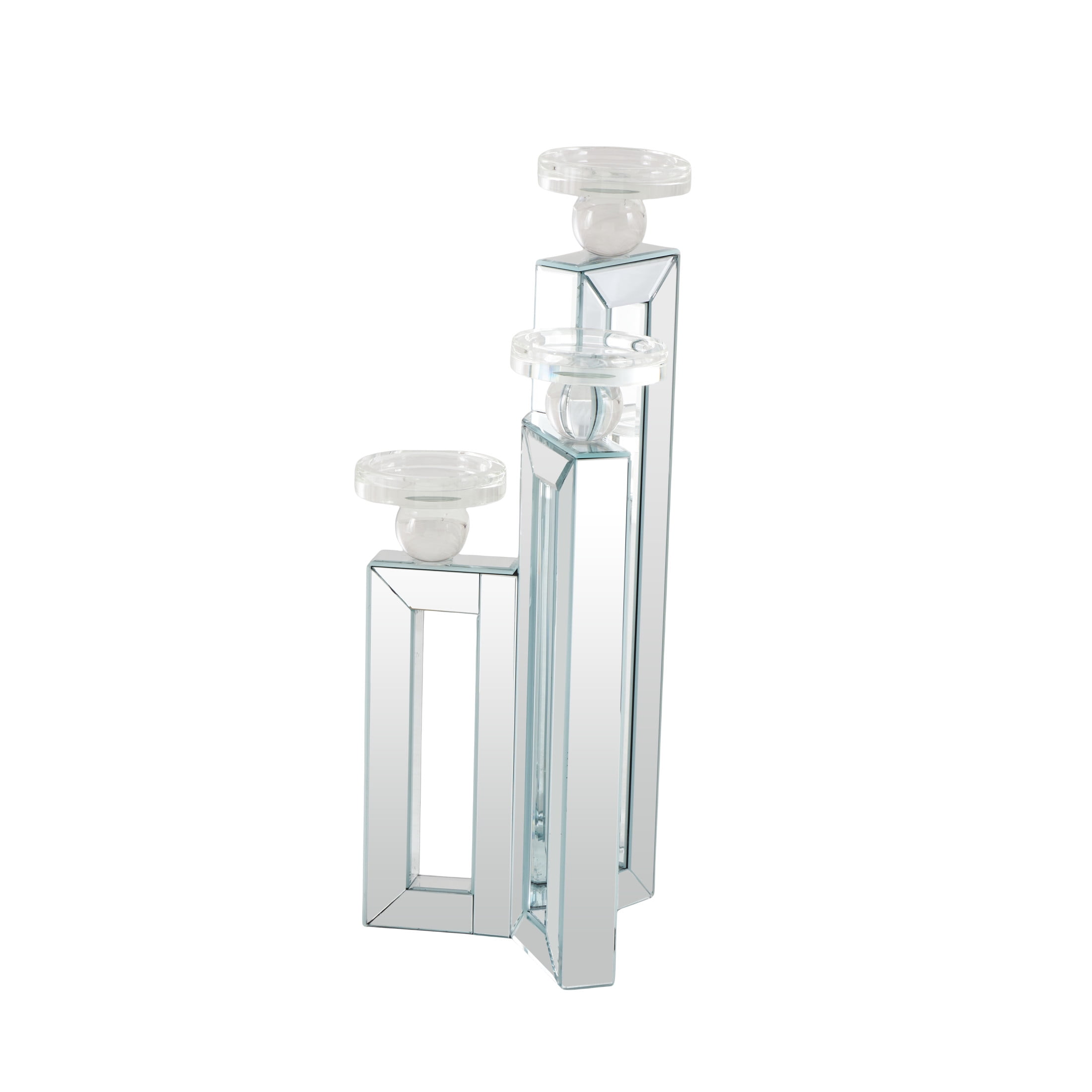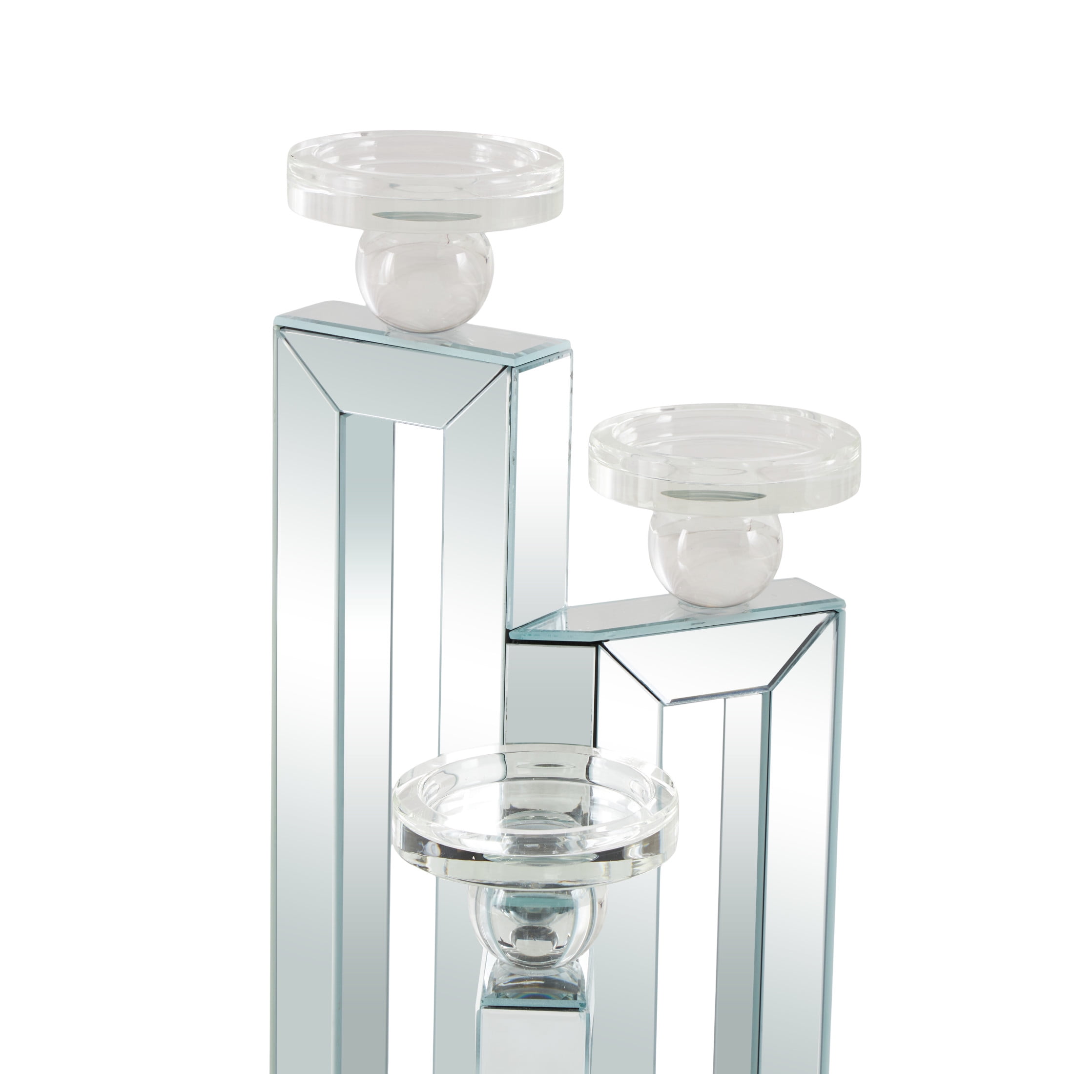 DecMode Glam Wood 3 Plate Pillar Candlle Holder with Silver Beveled Glass Finish, 7″W x 21″H