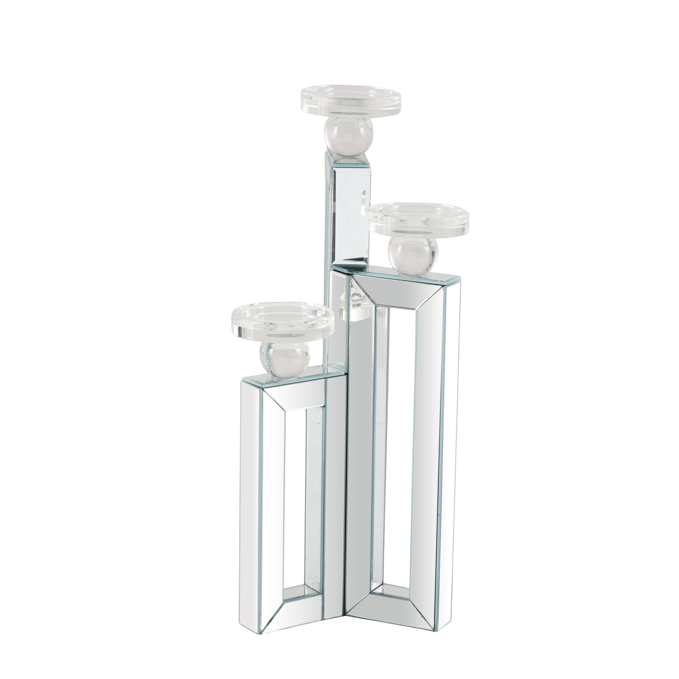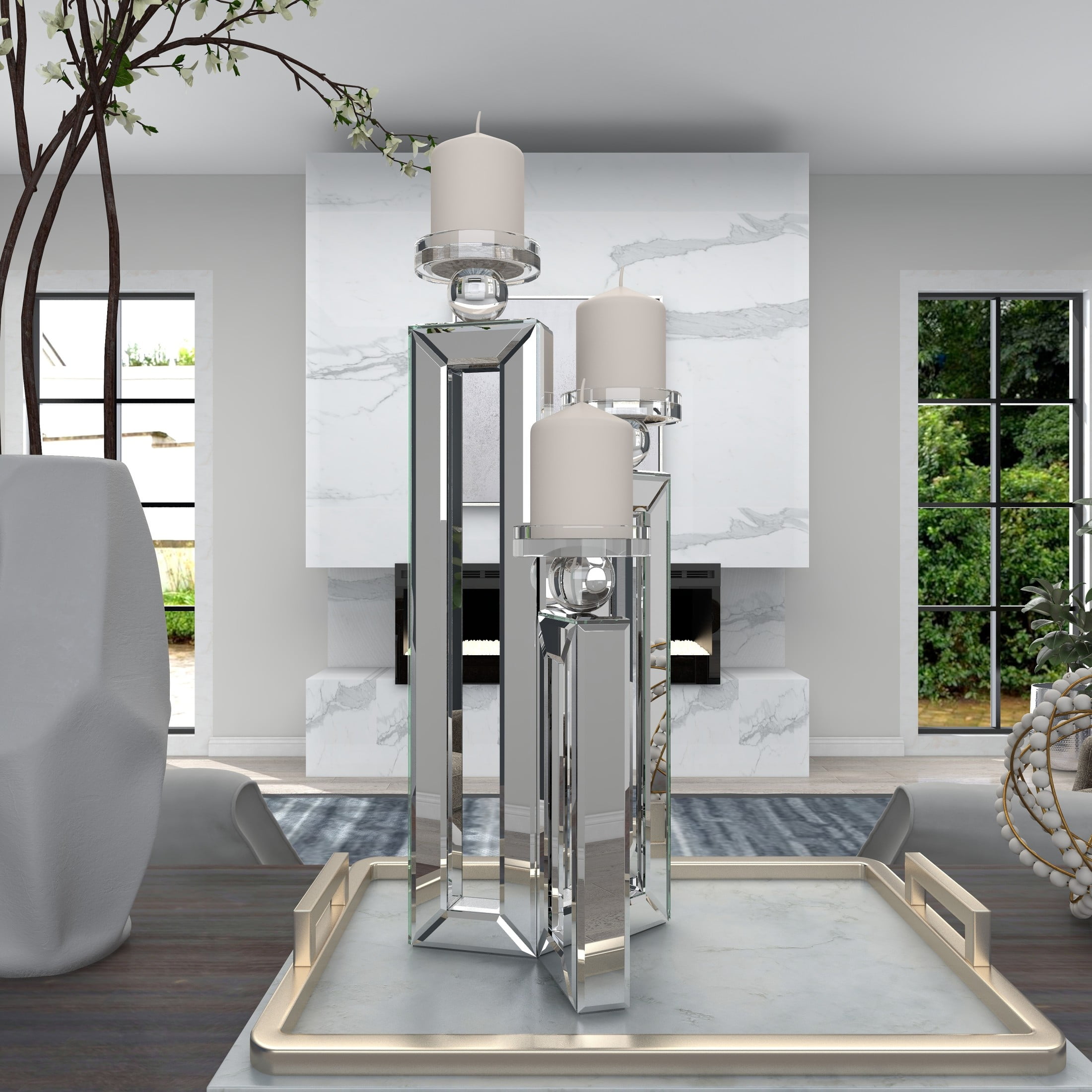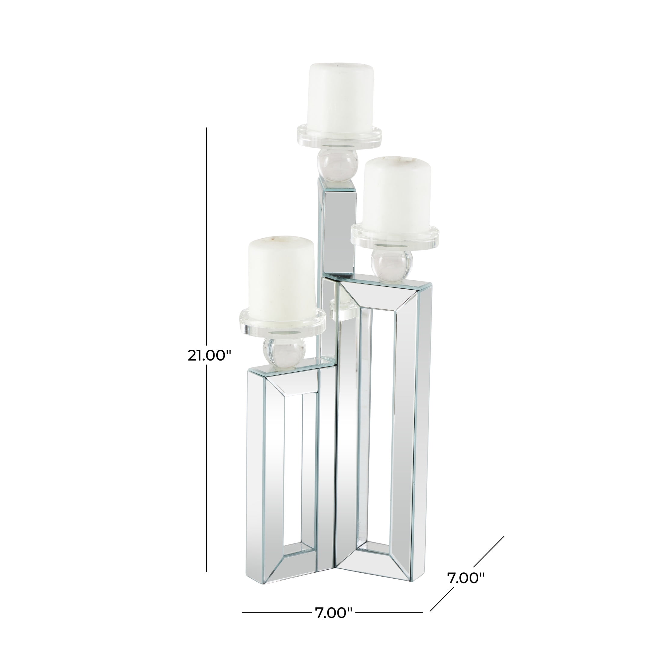 Indulge in the glamorous luxury of plush textures, dazzling details, and sleek finishes to elevate your home and add a sophisticated flair The silver decorative candelabra is crafted with beveled mirror glass and MDF materials for a robust and elegant display The rectangle candlestick stand features a mirrored silver finish with clear glass plates, adding a touch of glamor to any room The glass candelabra showcases three open-style mirror frames in varying heights, each supporting a crystal-like candle plate The silver glass candelabra measures 7L x 7W x 21H inches, and weighs 12.90 lbs The mirrored silver tabletop candelabra showcases open-frame rectangular frames with orb accents holding the square holders, exuding elegance Wipe clean with a dry cloth The glam decorative candleholder is carved from MDF to form open-frame structures with three glass plates and is covered with beveled mirror glass Glam style DecMode 3 Holder Silver Glass Pillar Candelabra with Mirrored Accents makes a perfect addition to any home