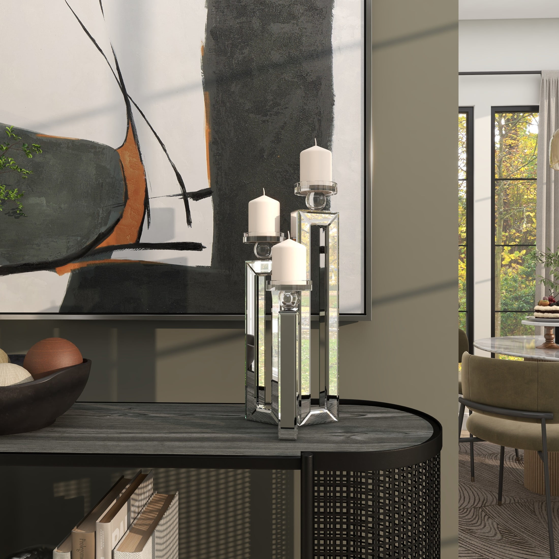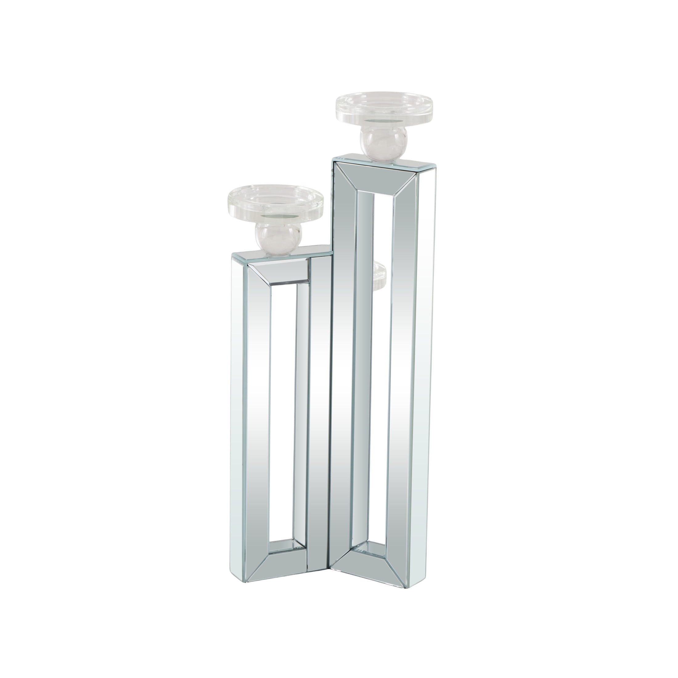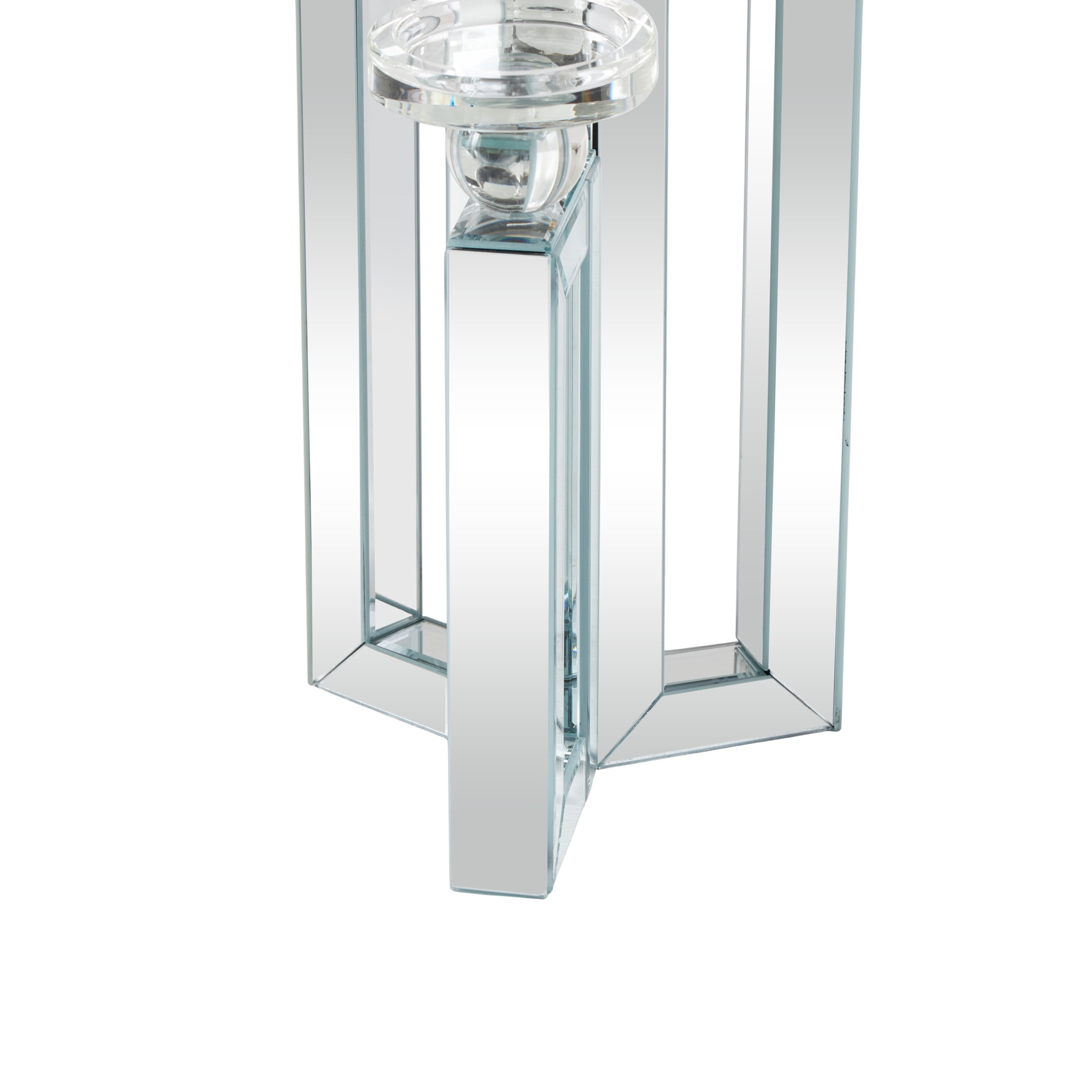 Indulge in the glamorous luxury of plush textures, dazzling details, and sleek finishes to elevate your home and add a sophisticated flair The silver decorative candelabra is crafted with beveled mirror glass and MDF materials for a robust and elegant display The rectangle candlestick stand features a mirrored silver finish with clear glass plates, adding a touch of glamor to any room The glass candelabra showcases three open-style mirror frames in varying heights, each supporting a crystal-like candle plate The silver glass candelabra measures 7L x 7W x 21H inches, and weighs 12.90 lbs The mirrored silver tabletop candelabra showcases open-frame rectangular frames with orb accents holding the square holders, exuding elegance Wipe clean with a dry cloth The glam decorative candleholder is carved from MDF to form open-frame structures with three glass plates and is covered with beveled mirror glass Glam style DecMode 3 Holder Silver Glass Pillar Candelabra with Mirrored Accents makes a perfect addition to any home