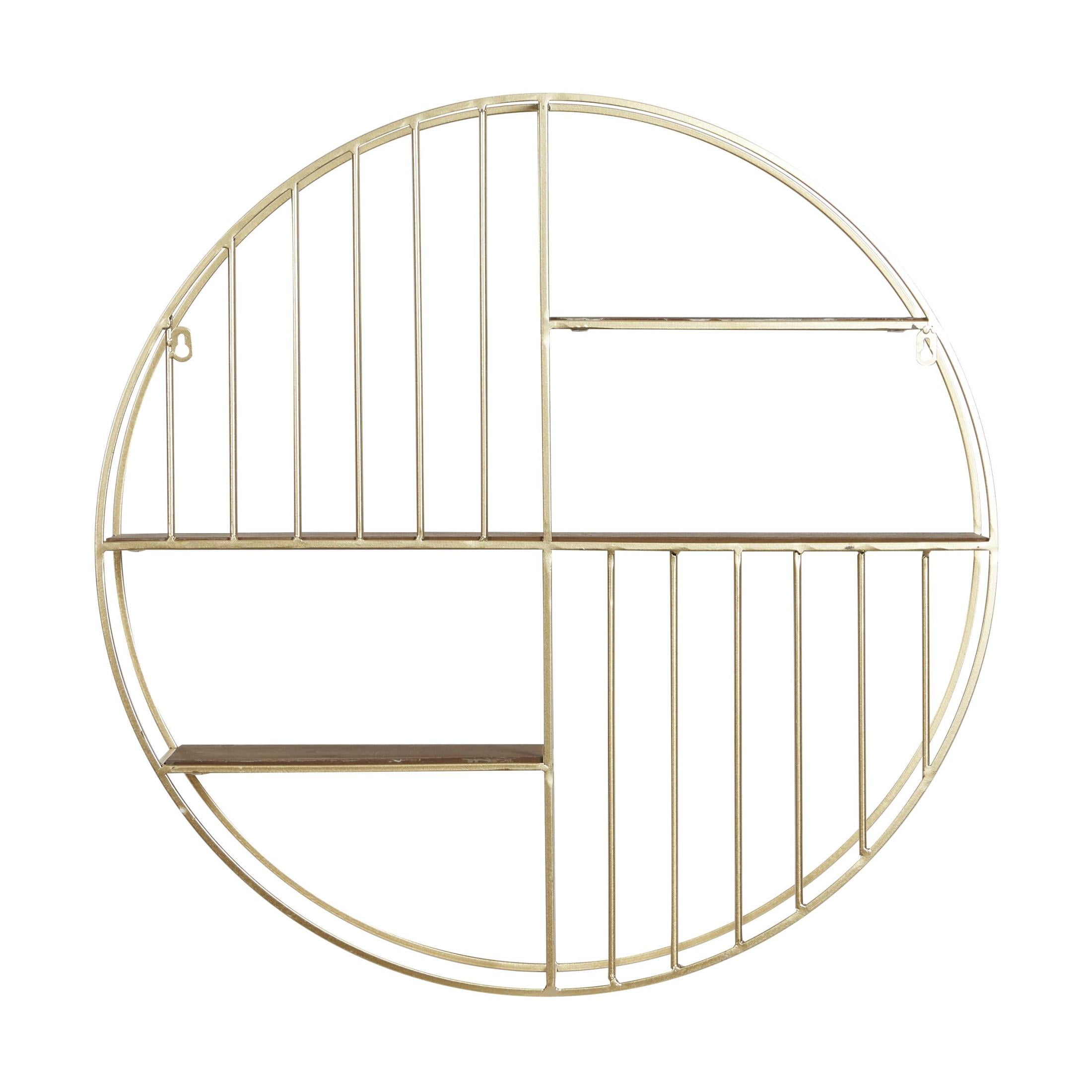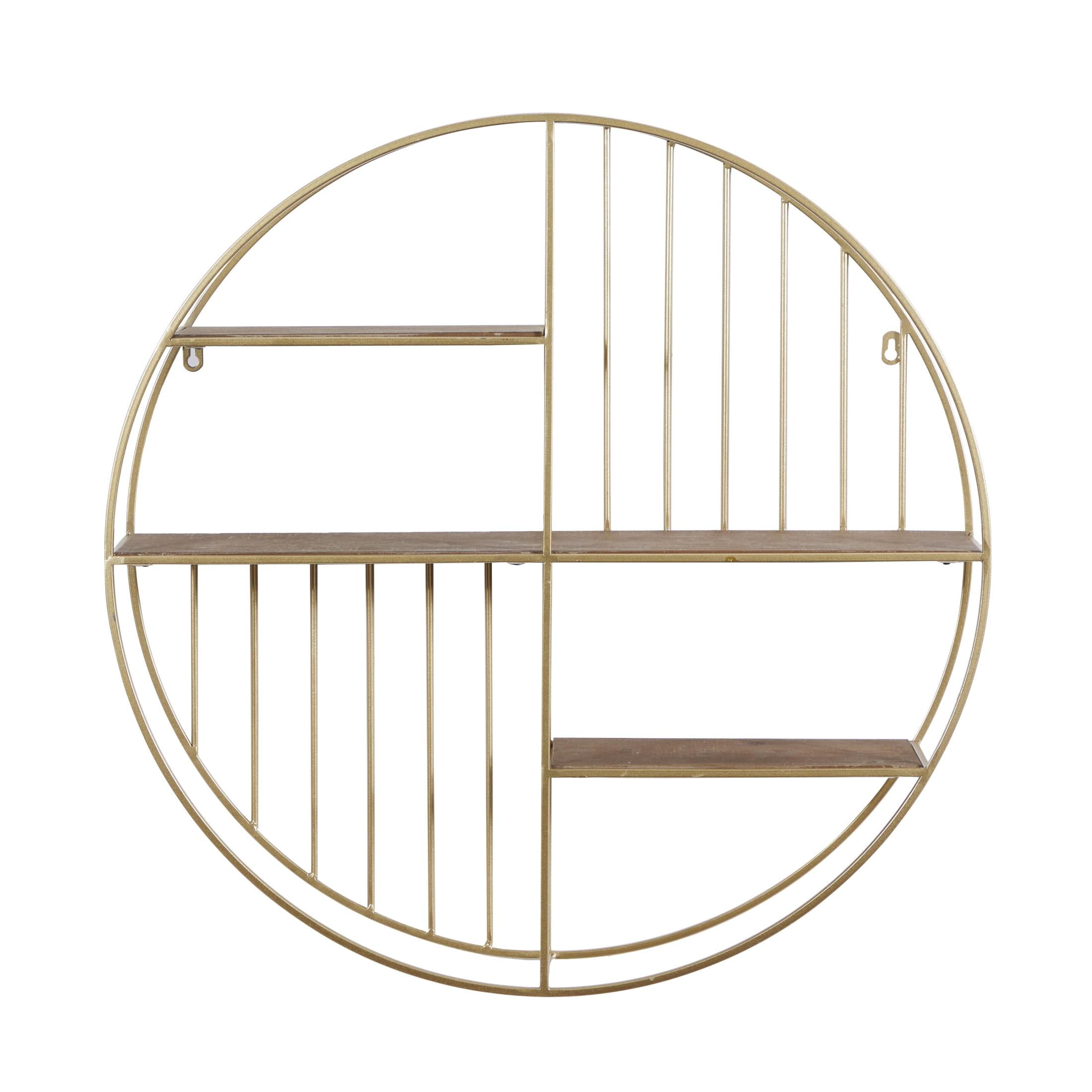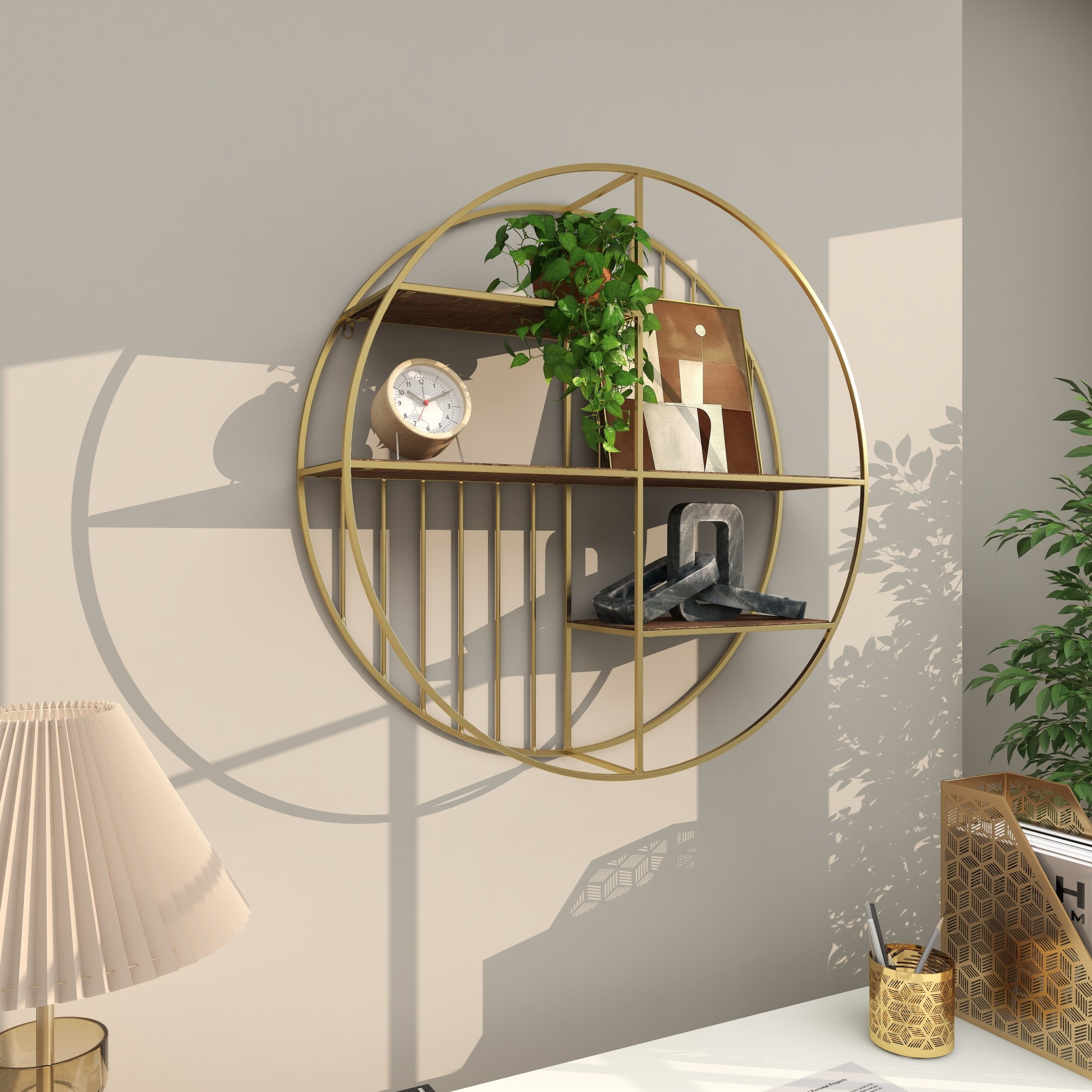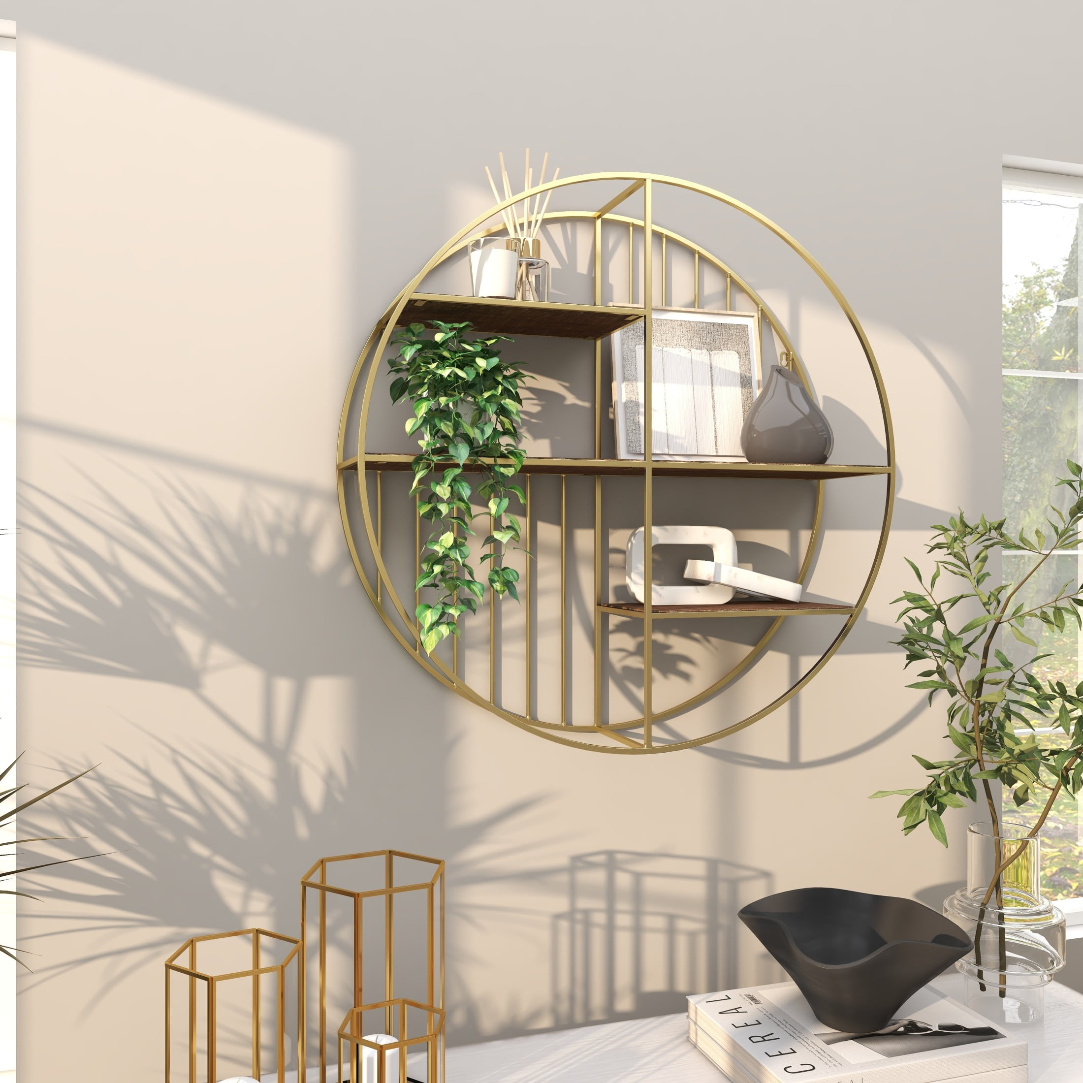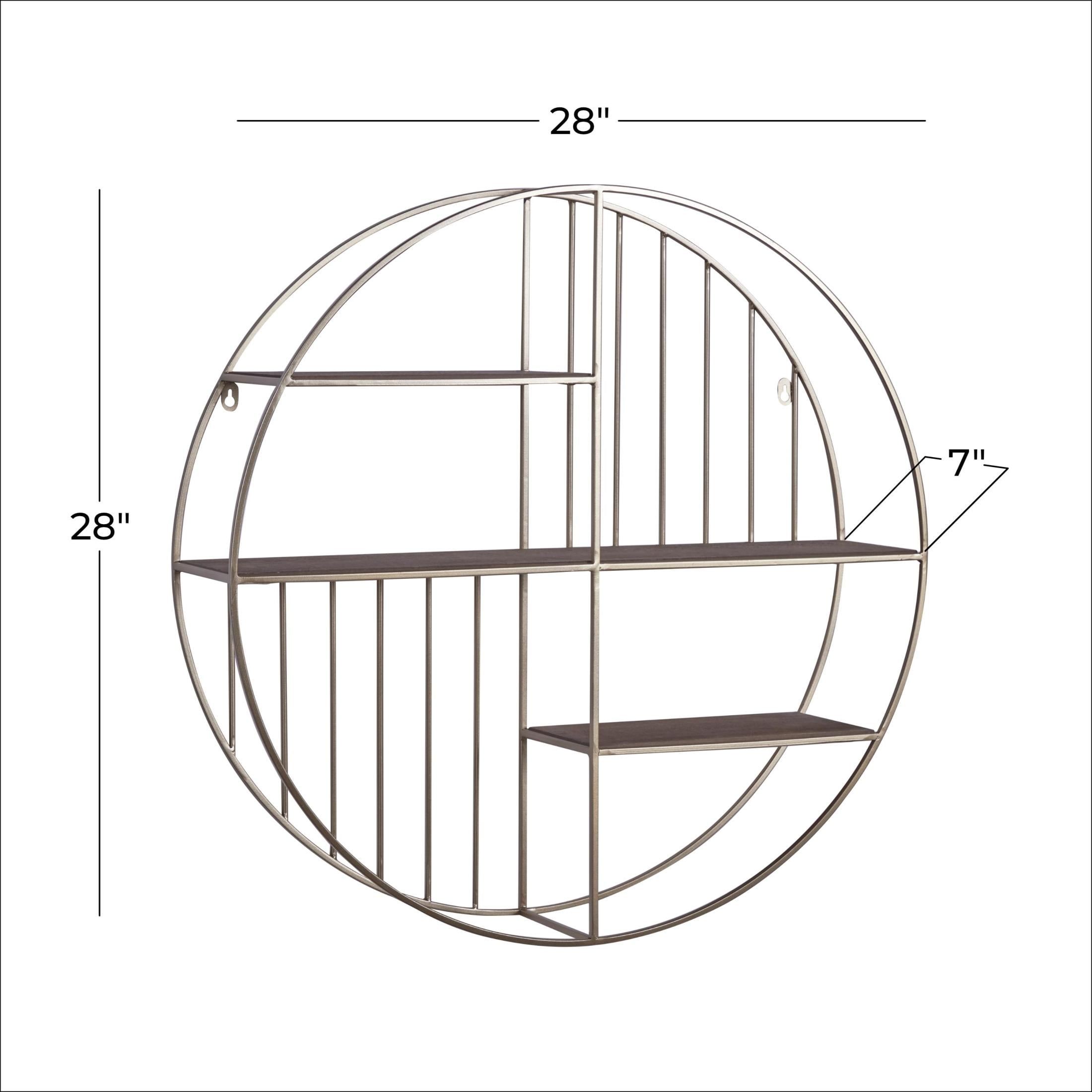 DecMode Gold Modern Iron Round Wall Shelf with Natural Brown Shelf Finish , 28″W x 28″H