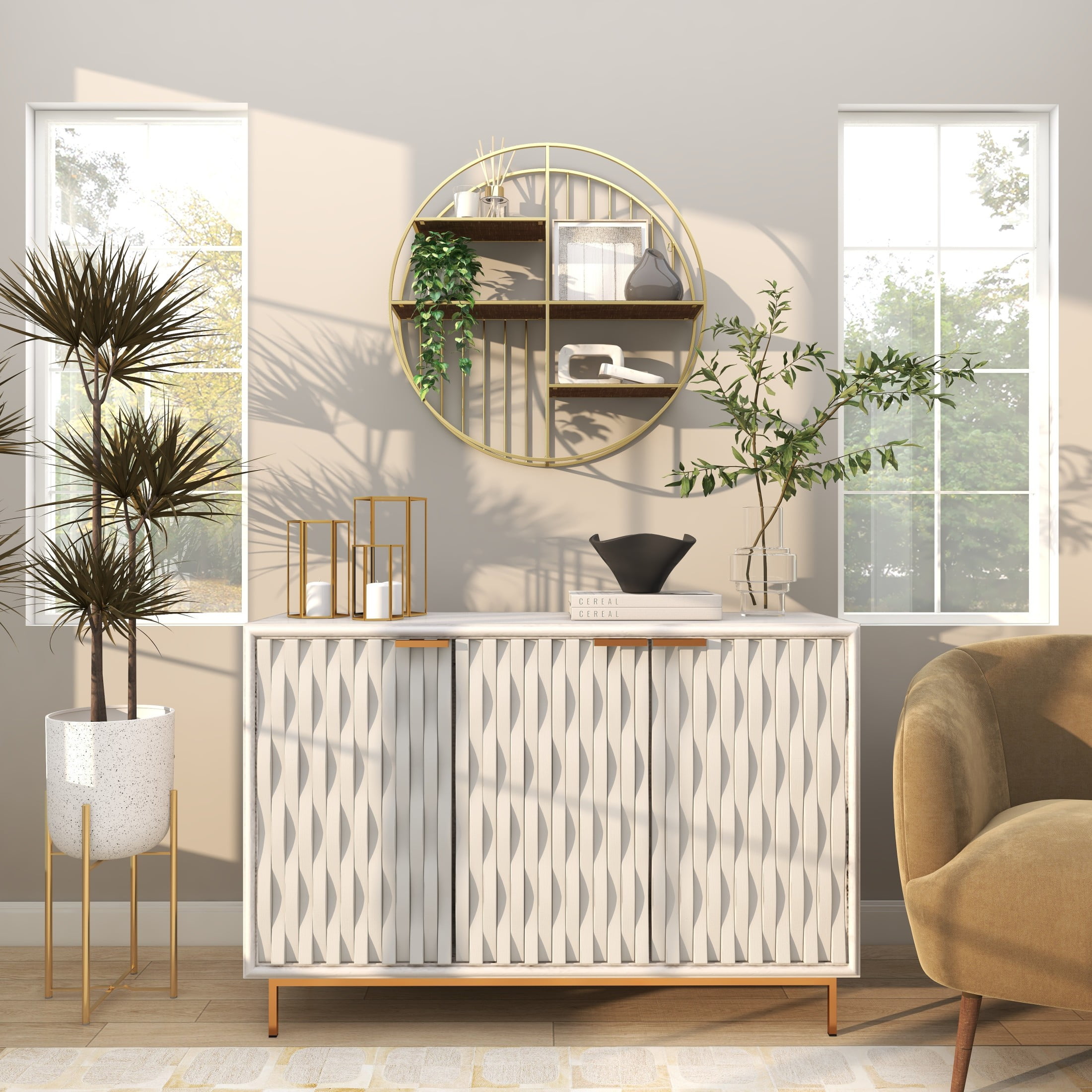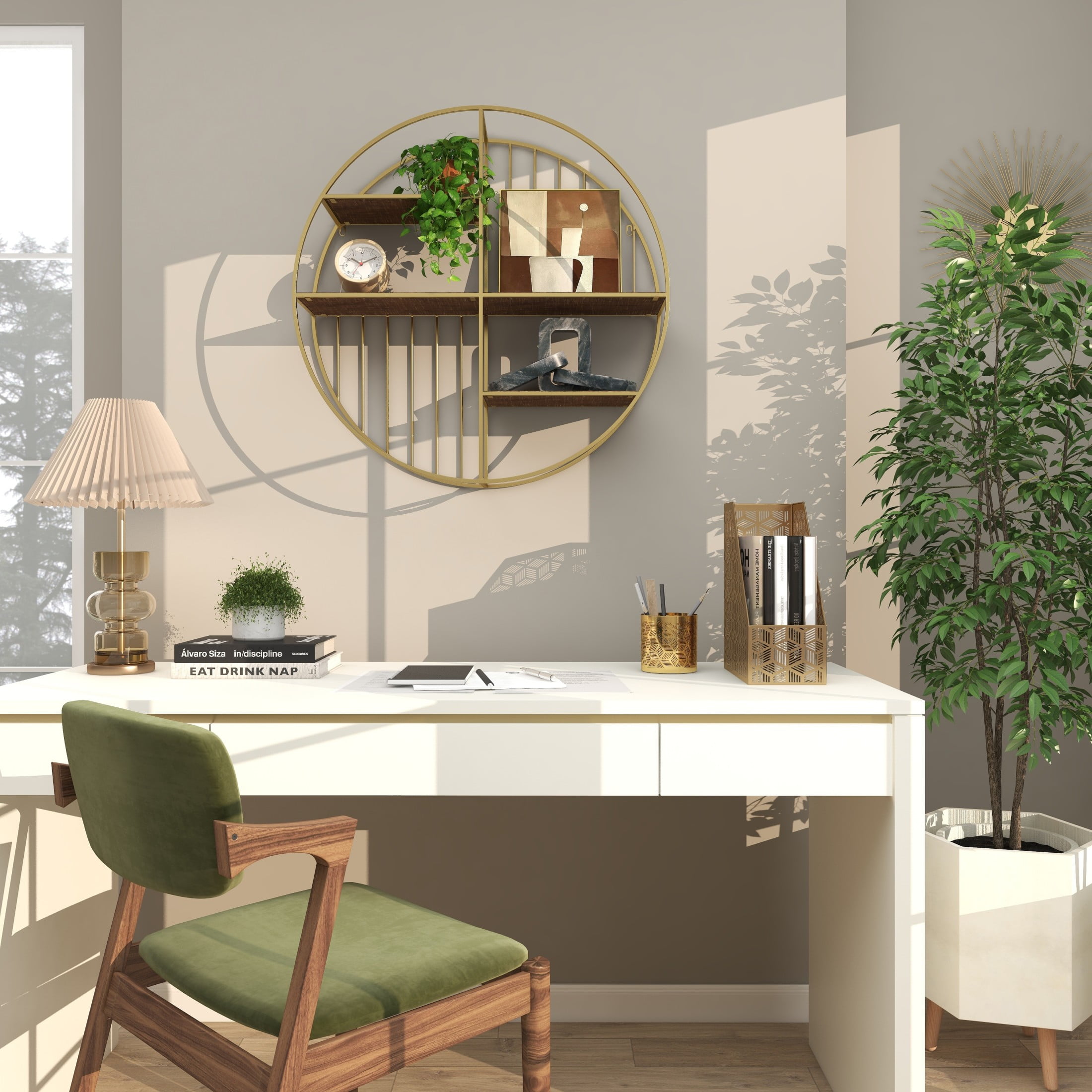 Inspired by sleek elegance and clean lines, a minimalistic design offers effortless luxury with monochromatic tones and bold, angular structures The gold room wall shelf is crafted from robust iron and MDF materials, ensuring durability and style Round shelf for wall boasts a satin gold-finished frame paired with natural wood brown shelving, creating a warm and sophisticated accent piece This iron wall shelf features a geometric metal frame and multiple wooden shelves, creating a modern and stylish display piece The gold metal wall shelf measures 28.0L x 7.0W x 28.0H inches, and weighs 6.4 lbs Satin gold room floating shelf features a rounded frame with rectangular wood slats and line patterns, adding visual appeal Wipe clean with a dry cloth Modern mounted wall shelf is constructed with welded metal and mounted wood slats, complete with attached hardware metal backing for stability Modern style DecMode 28″ x 7″ Circle 3-Tier Gold Geometric Wall Shelf with 3 Wood Shelves and Linear Rods makes a perfect addition to any home