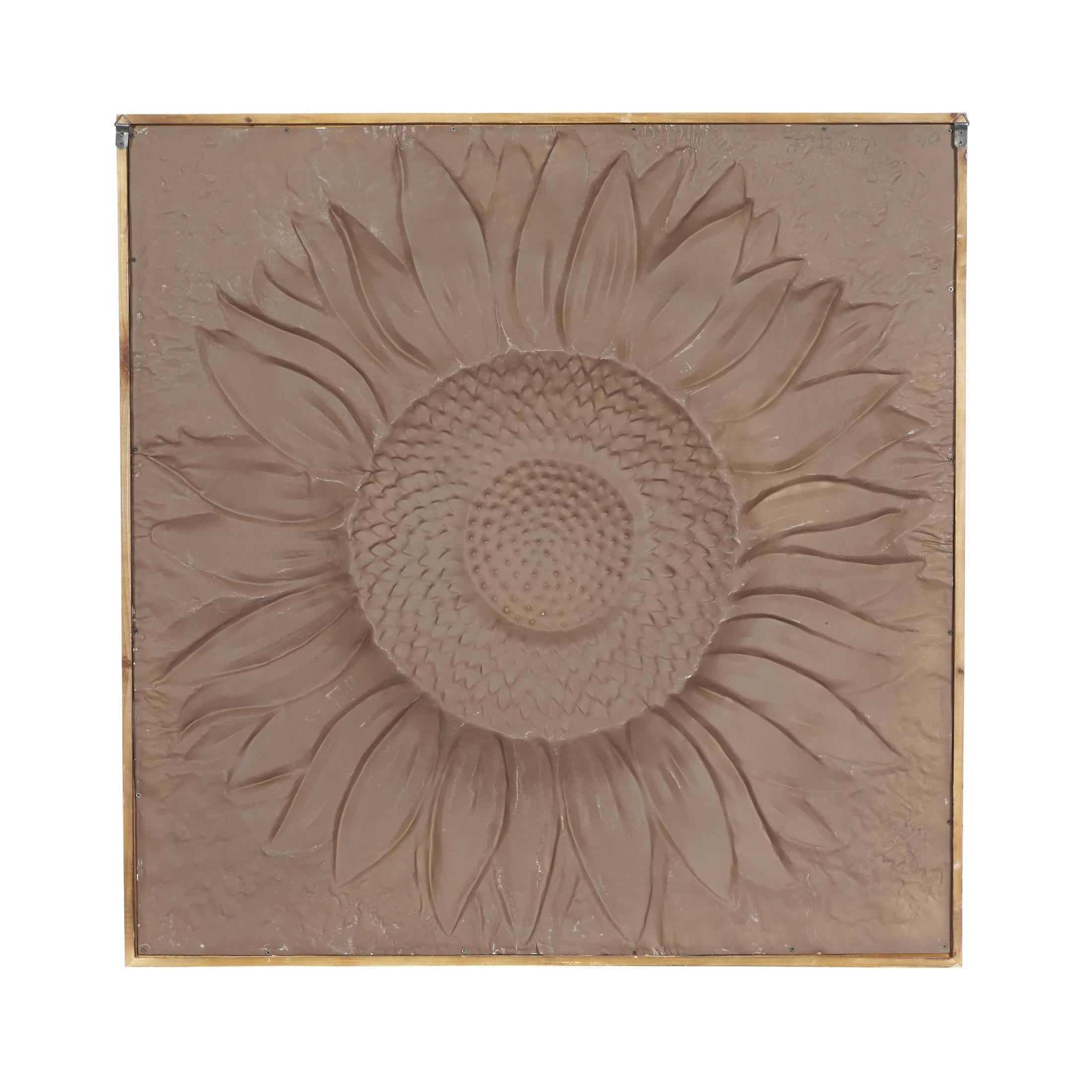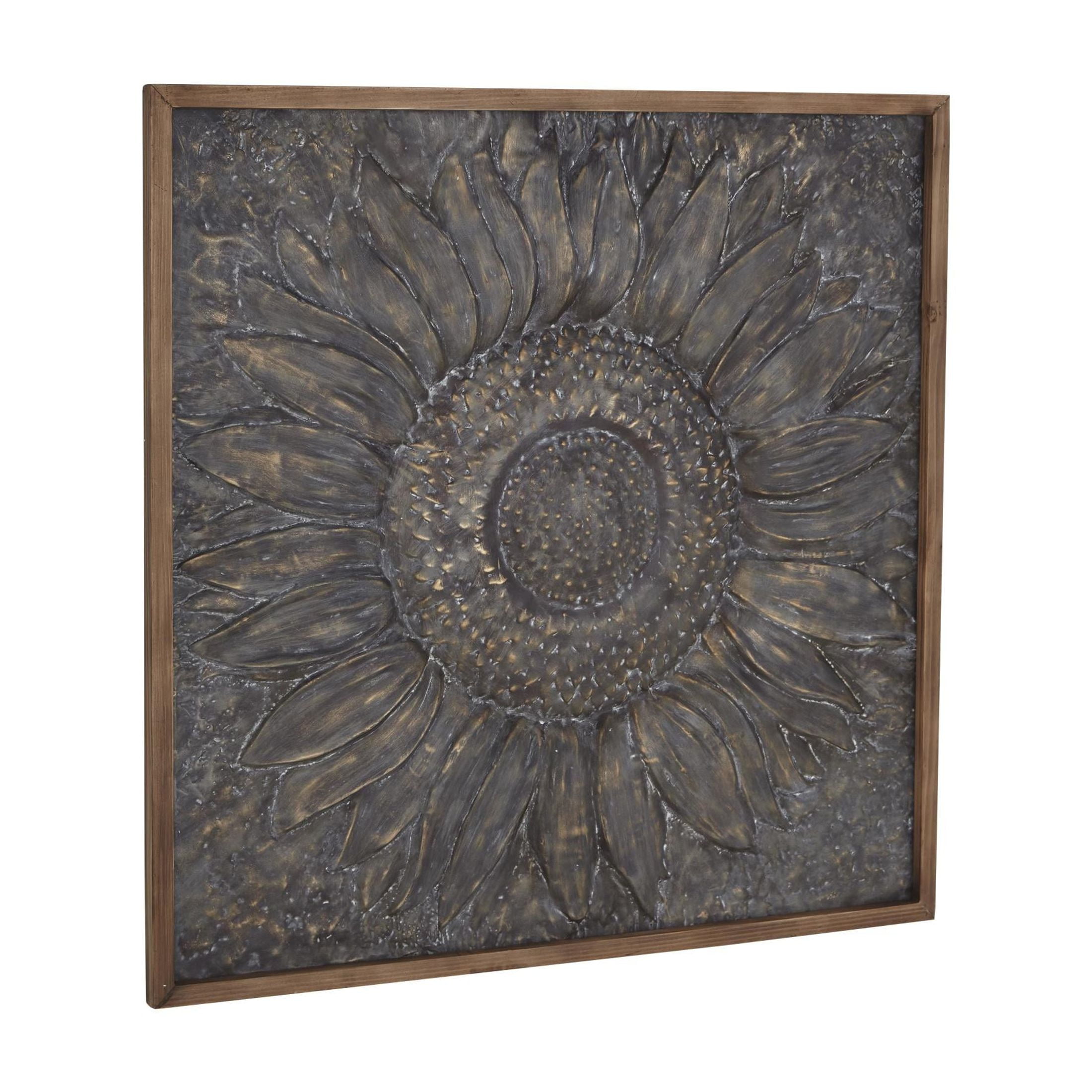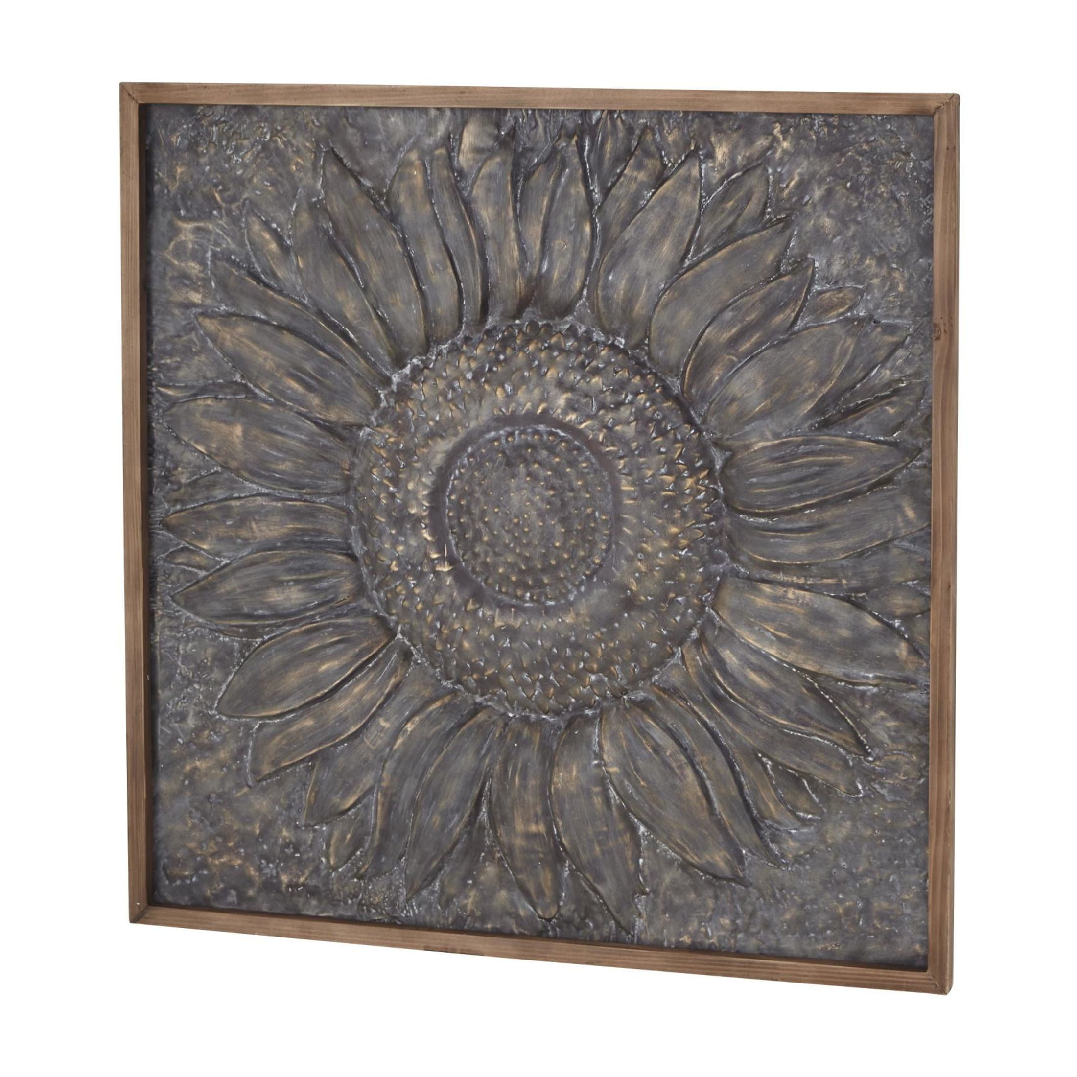 Designed with rugged beauty and an earthy charm, where natural simplicity, warmth, and organic materials create a wholesome atmosphere Crafted from natural fir wood and iron, this gray home wall decor exudes a rustic charm that can enhance any space Square decor for wall showcases a striking satin gray finish, with its dark silver metal sunflower highlighted by metallic gold brushstrokes and brown frame Iron wall decor is distinguished by its 3D carved and embossed design, nestled within a natural wood frame The gray metal wall decor measures 39L x 1W x 39H inches, and weighs 4 lbs Satin gray wall art for living room assumes a square shape with its dark gray metal panel painted with gold brushstrokes, adding texture and depth to the overall design Wipe clean with a dry cloth Each element of this rustic room wall decor is meticulously crafted, featuring a molded metal sunflower carving embossed to create a convex structure and encased within a wooden frame Rustic style DecMode Gray Metal Sunflower Floral Wall Decor with Embossed Details makes a perfect addition to any home