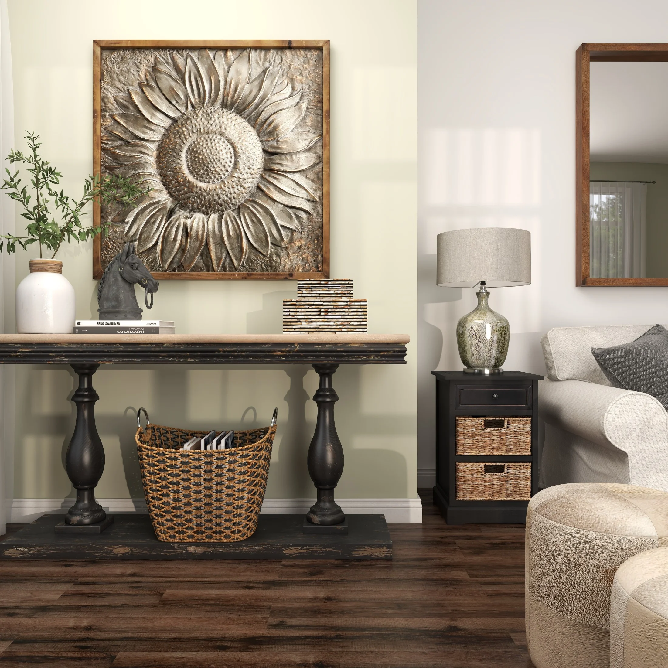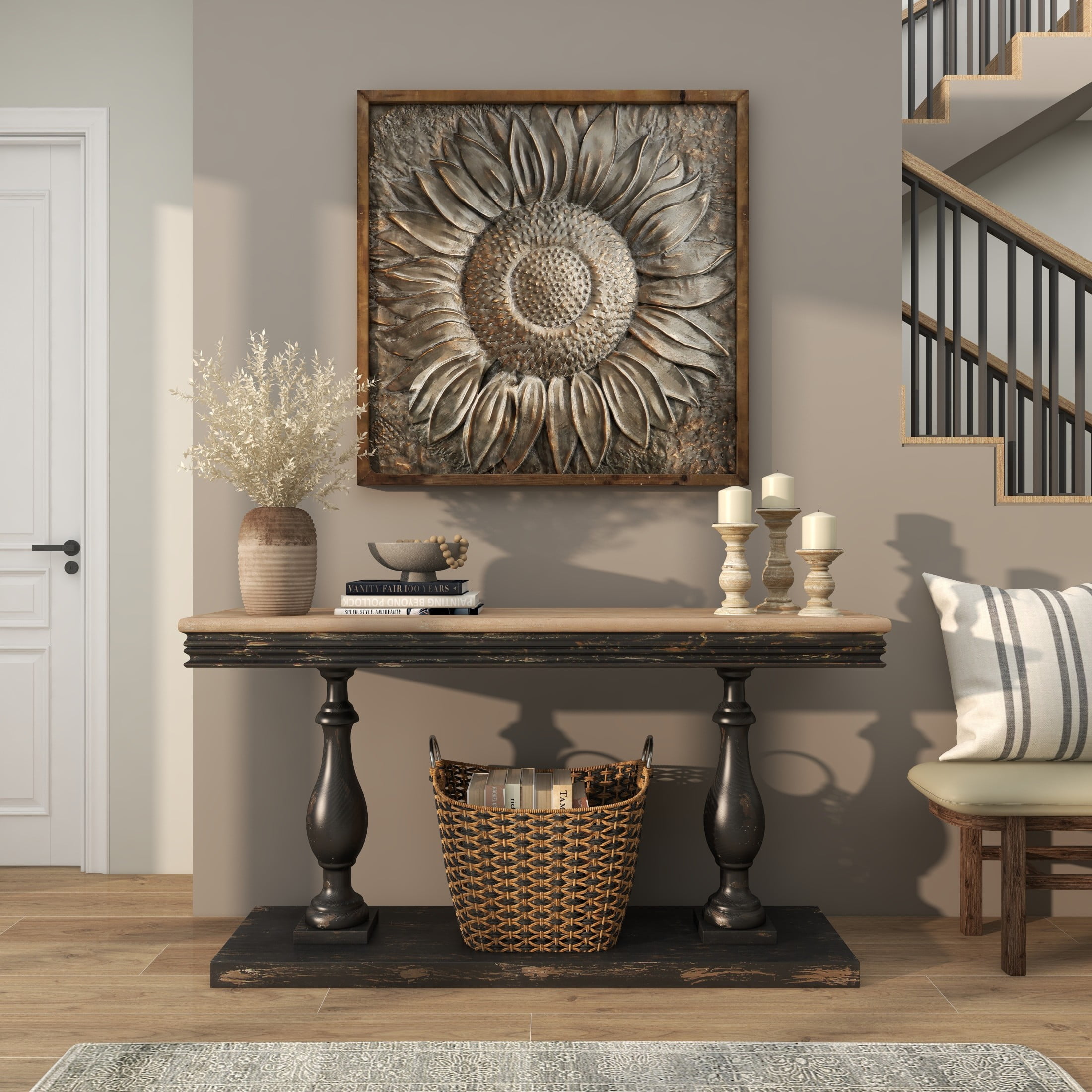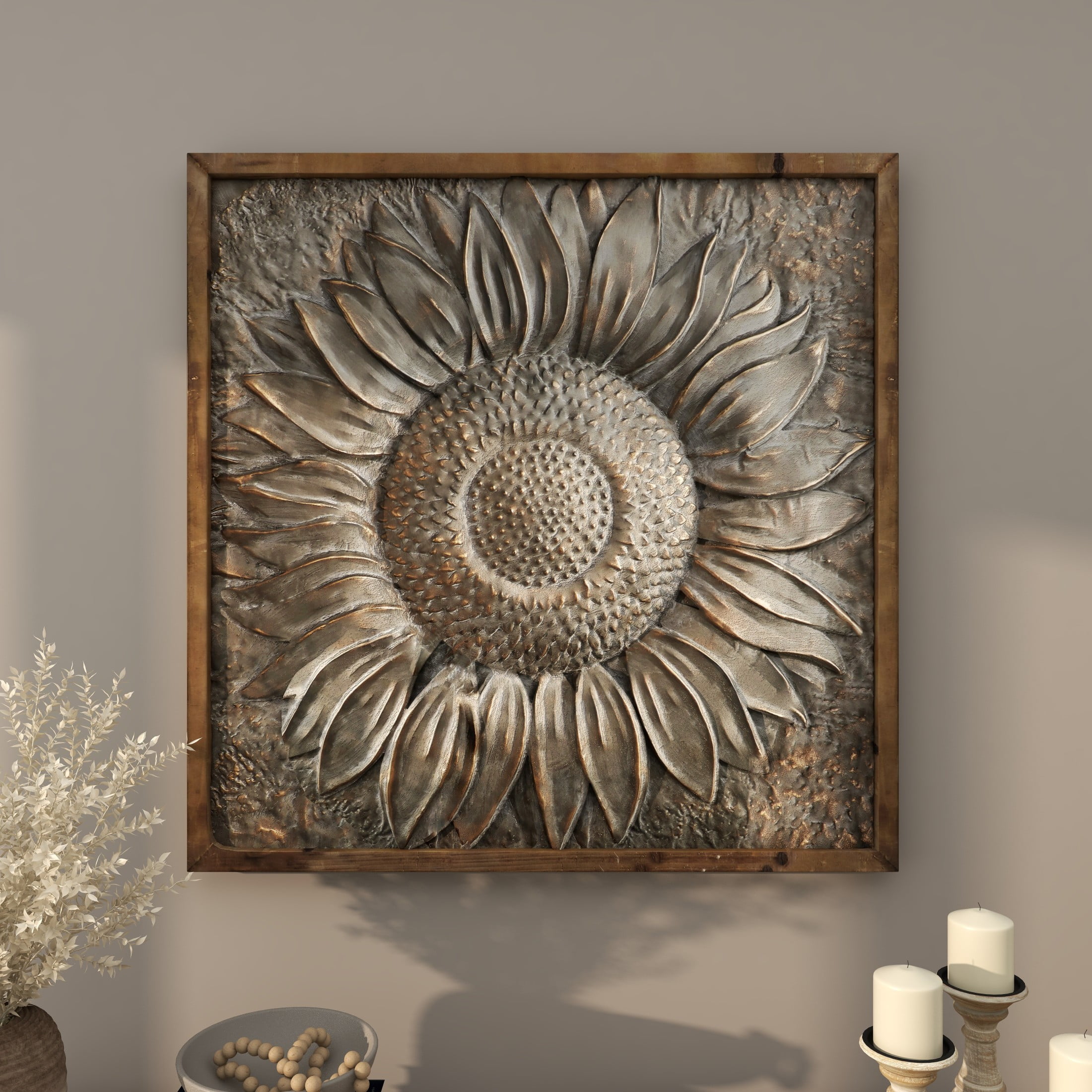 Designed with rugged beauty and an earthy charm, where natural simplicity, warmth, and organic materials create a wholesome atmosphere Crafted from natural fir wood and iron, this gray home wall decor exudes a rustic charm that can enhance any space Square decor for wall showcases a striking satin gray finish, with its dark silver metal sunflower highlighted by metallic gold brushstrokes and brown frame Iron wall decor is distinguished by its 3D carved and embossed design, nestled within a natural wood frame The gray metal wall decor measures 39L x 1W x 39H inches, and weighs 4 lbs Satin gray wall art for living room assumes a square shape with its dark gray metal panel painted with gold brushstrokes, adding texture and depth to the overall design Wipe clean with a dry cloth Each element of this rustic room wall decor is meticulously crafted, featuring a molded metal sunflower carving embossed to create a convex structure and encased within a wooden frame Rustic style DecMode Gray Metal Sunflower Floral Wall Decor with Embossed Details makes a perfect addition to any home