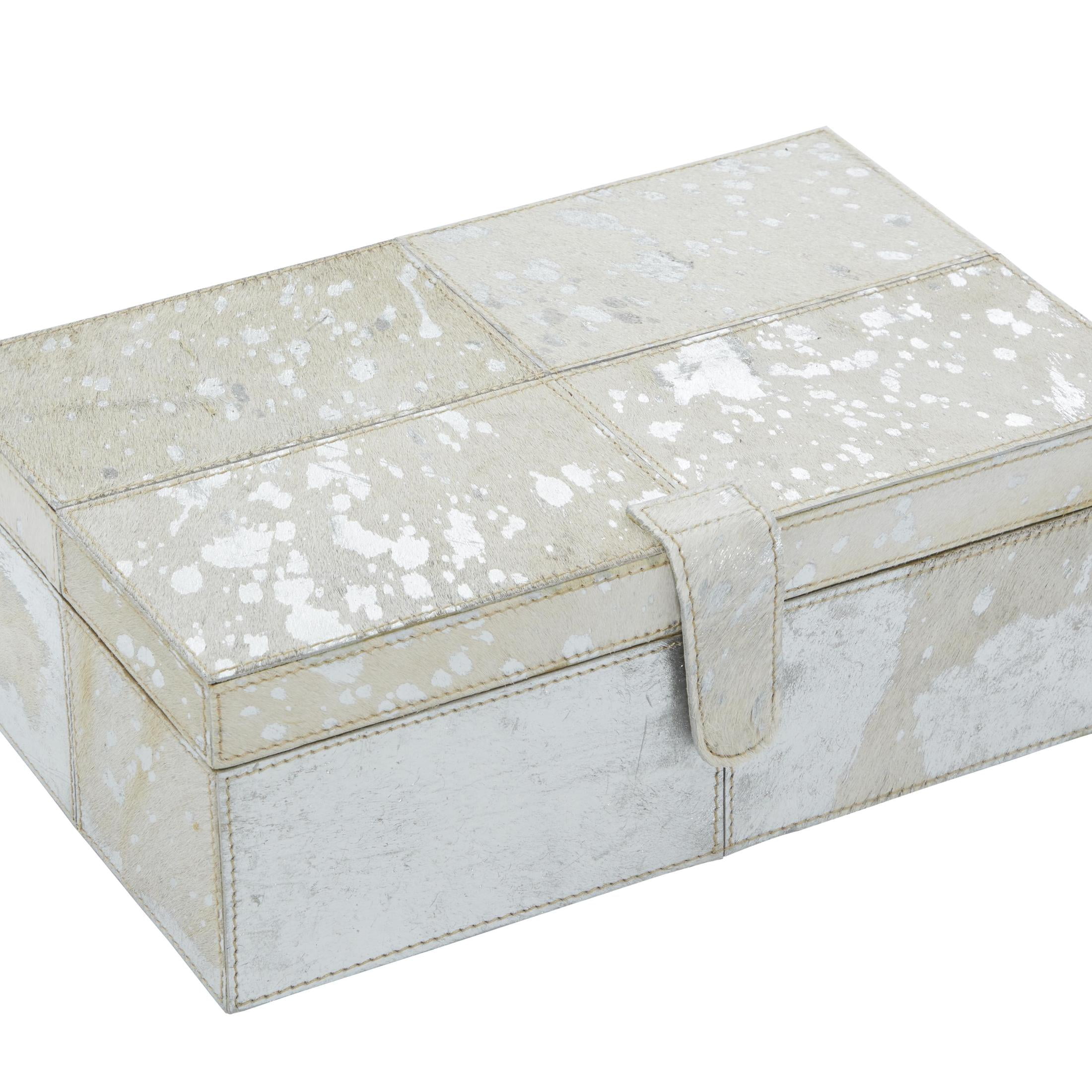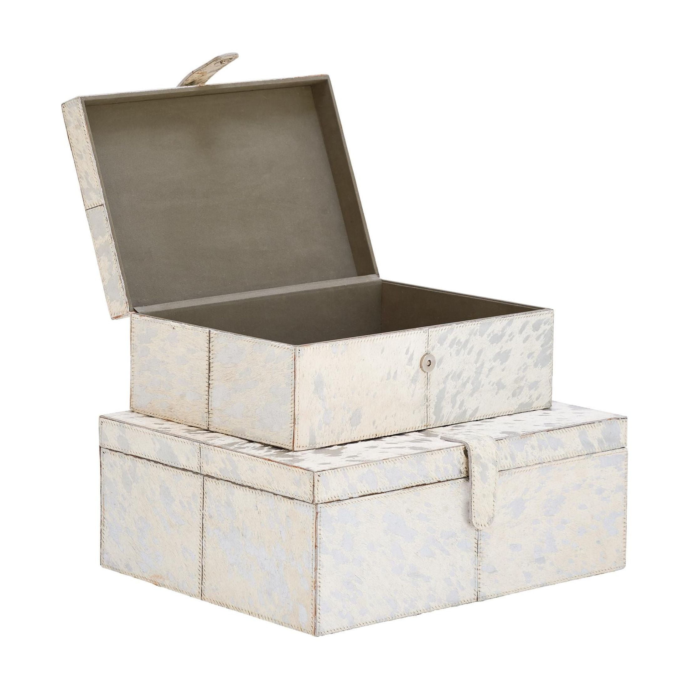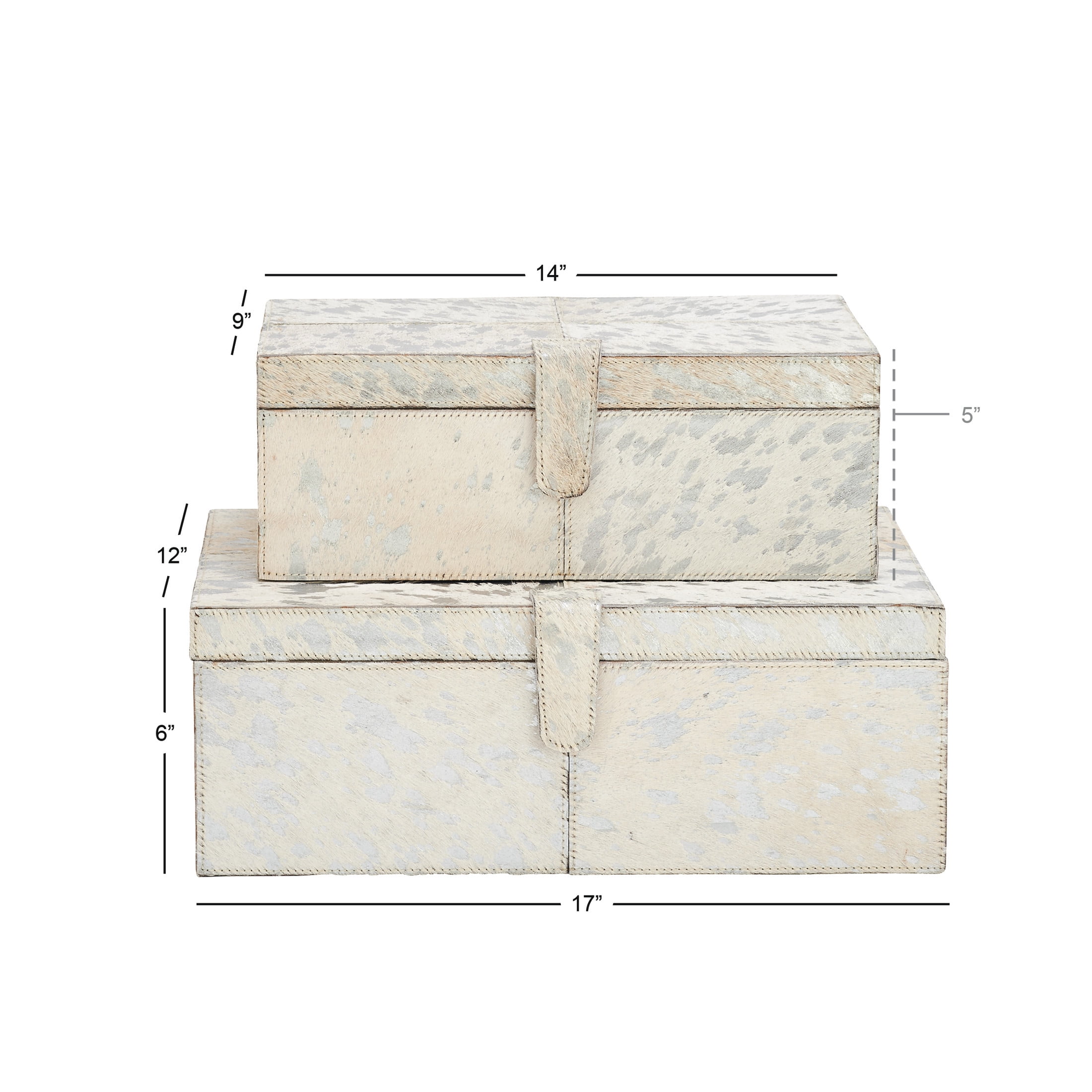 Indulge in the glamorous luxury of plush textures, dazzling details, and sleek finishes to elevate your home and add a sophisticated flair Crafted from natural hide leather, MDF wood, and velvet materials, this silver decorative box set exudes an air of refined elegance Rectangle decorative storage box set showcases a chic grainy silver and white cow print leather hide, enhanced by textual hair and upholstered stitching Leather set of 2 boxes features a convenient lift-open side and secure snap button locks Each silver leather box measures 14L x 9W x 5H , 17L x 12W x 6H inches, and collectively weighs 7.48 lbs Embodying natural cowhide patch patterns on their rectangular frames, these grainy silver gift boxes are as visually appealing as they are practical Wipe clean with a dry cloth Glam set of 2 keepsake boxes is crafted with MDF and wrapped in white leather featuring snap button locks and a single compartment blending style and functionality Glam style DecMode Handmade Cowhide Storage Silver Leather Decorative Box with Stitching Detail, 2 Count makes a perfect addition to any home