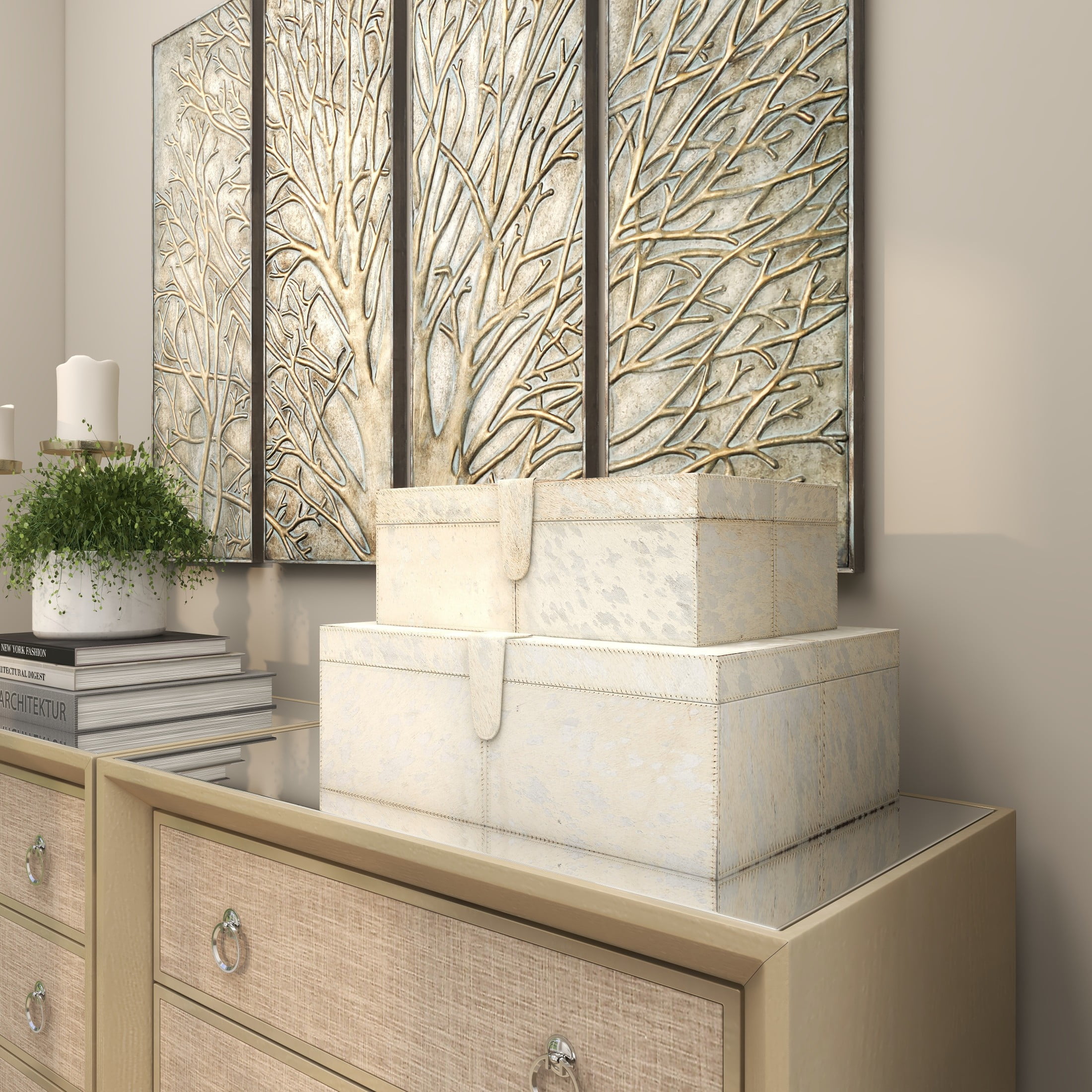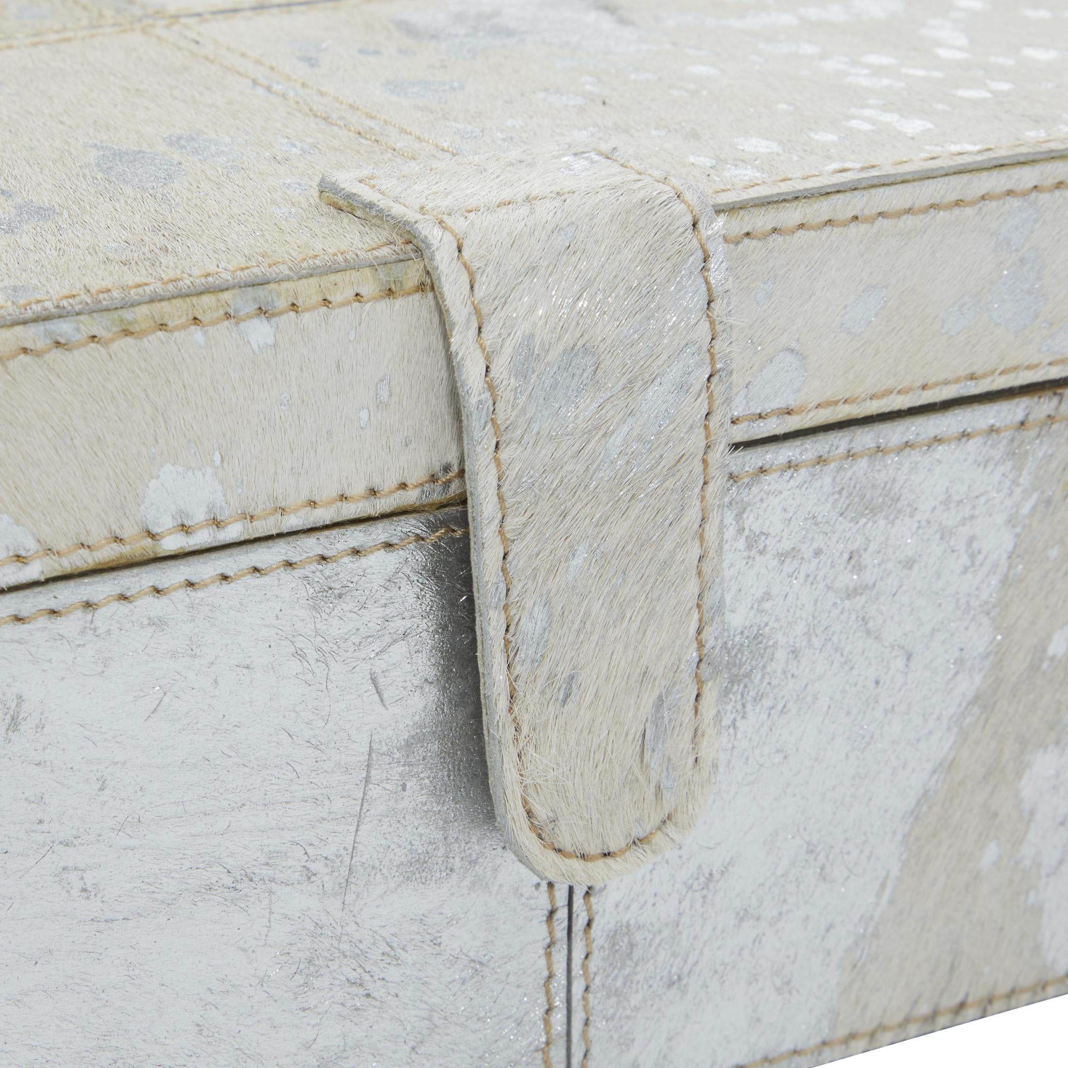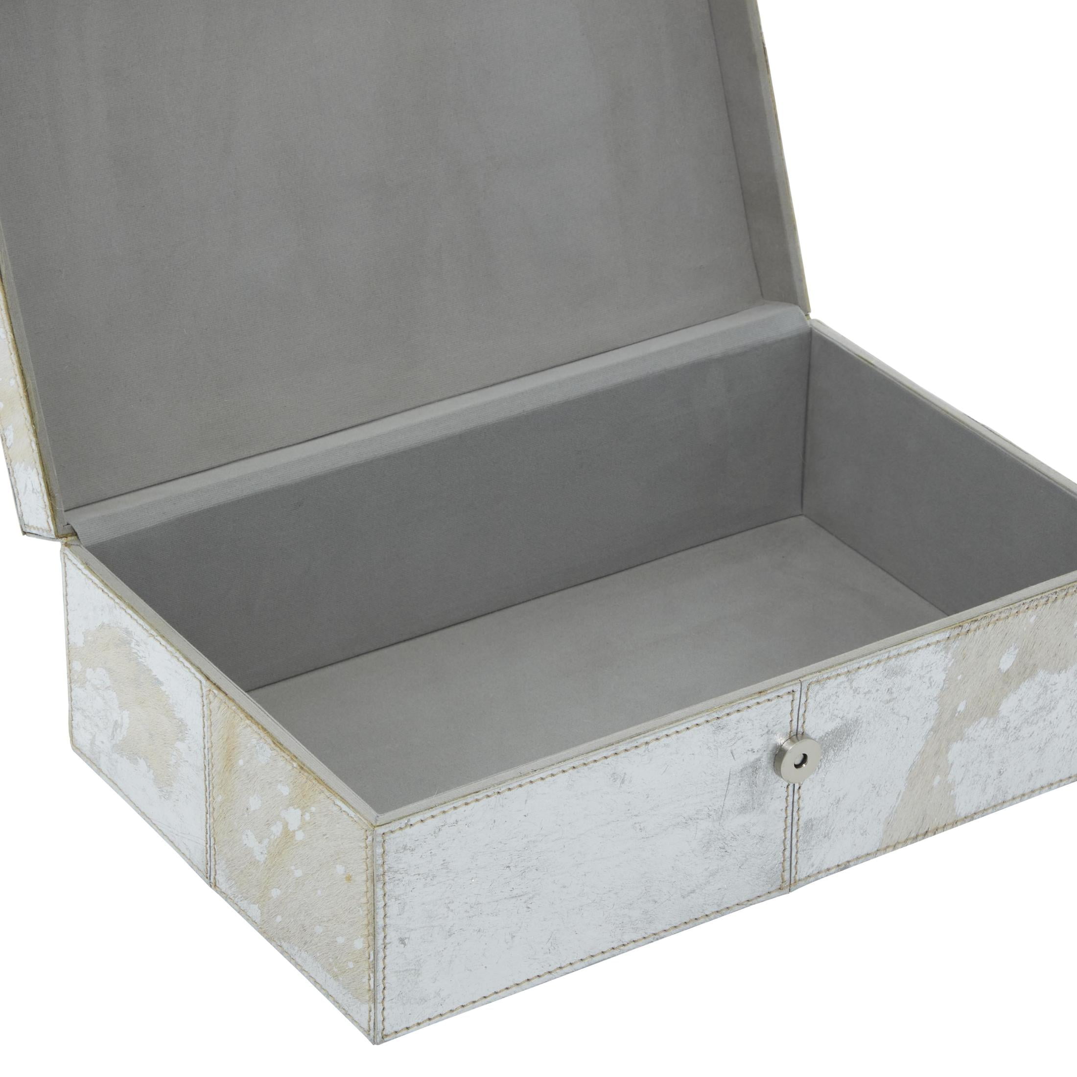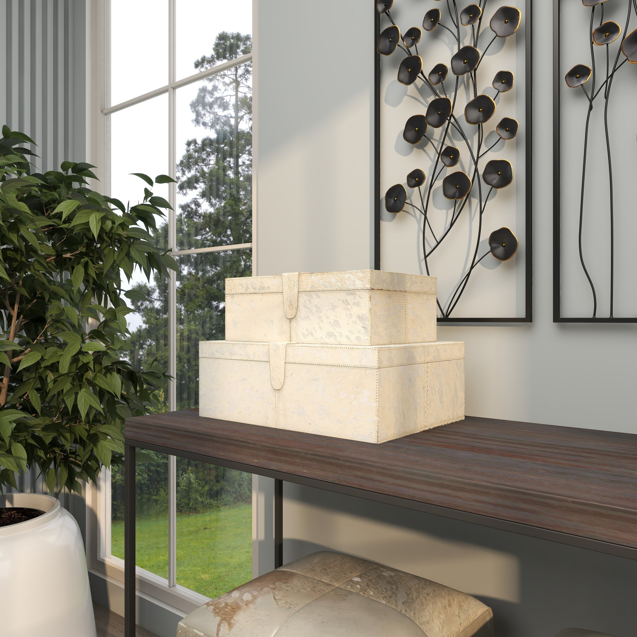 Indulge in the glamorous luxury of plush textures, dazzling details, and sleek finishes to elevate your home and add a sophisticated flair Crafted from natural hide leather, MDF wood, and velvet materials, this silver decorative box set exudes an air of refined elegance Rectangle decorative storage box set showcases a chic grainy silver and white cow print leather hide, enhanced by textual hair and upholstered stitching Leather set of 2 boxes features a convenient lift-open side and secure snap button locks Each silver leather box measures 14L x 9W x 5H , 17L x 12W x 6H inches, and collectively weighs 7.48 lbs Embodying natural cowhide patch patterns on their rectangular frames, these grainy silver gift boxes are as visually appealing as they are practical Wipe clean with a dry cloth Glam set of 2 keepsake boxes is crafted with MDF and wrapped in white leather featuring snap button locks and a single compartment blending style and functionality Glam style DecMode Handmade Cowhide Storage Silver Leather Decorative Box with Stitching Detail, 2 Count makes a perfect addition to any home
