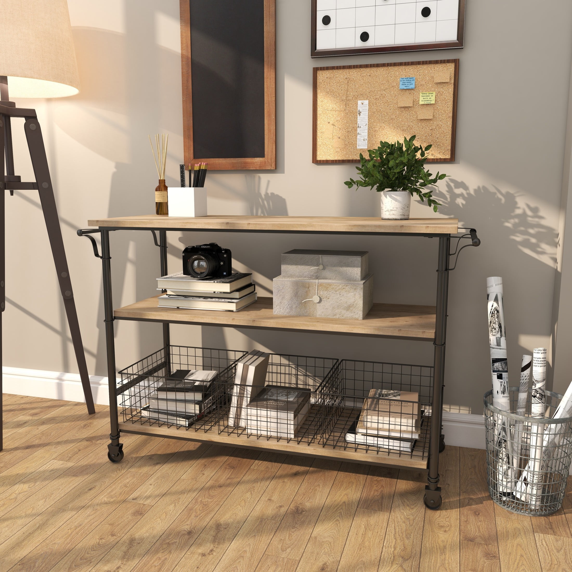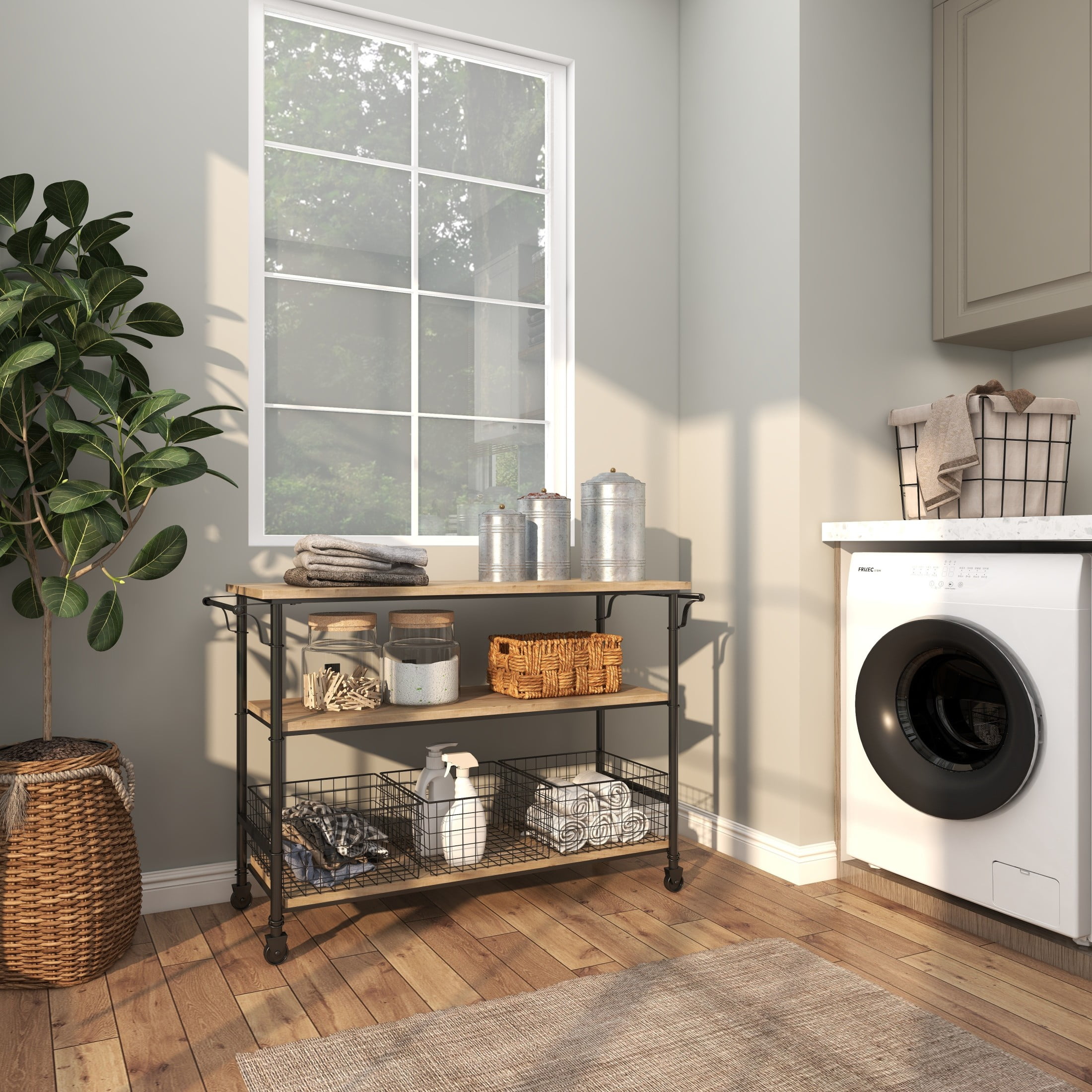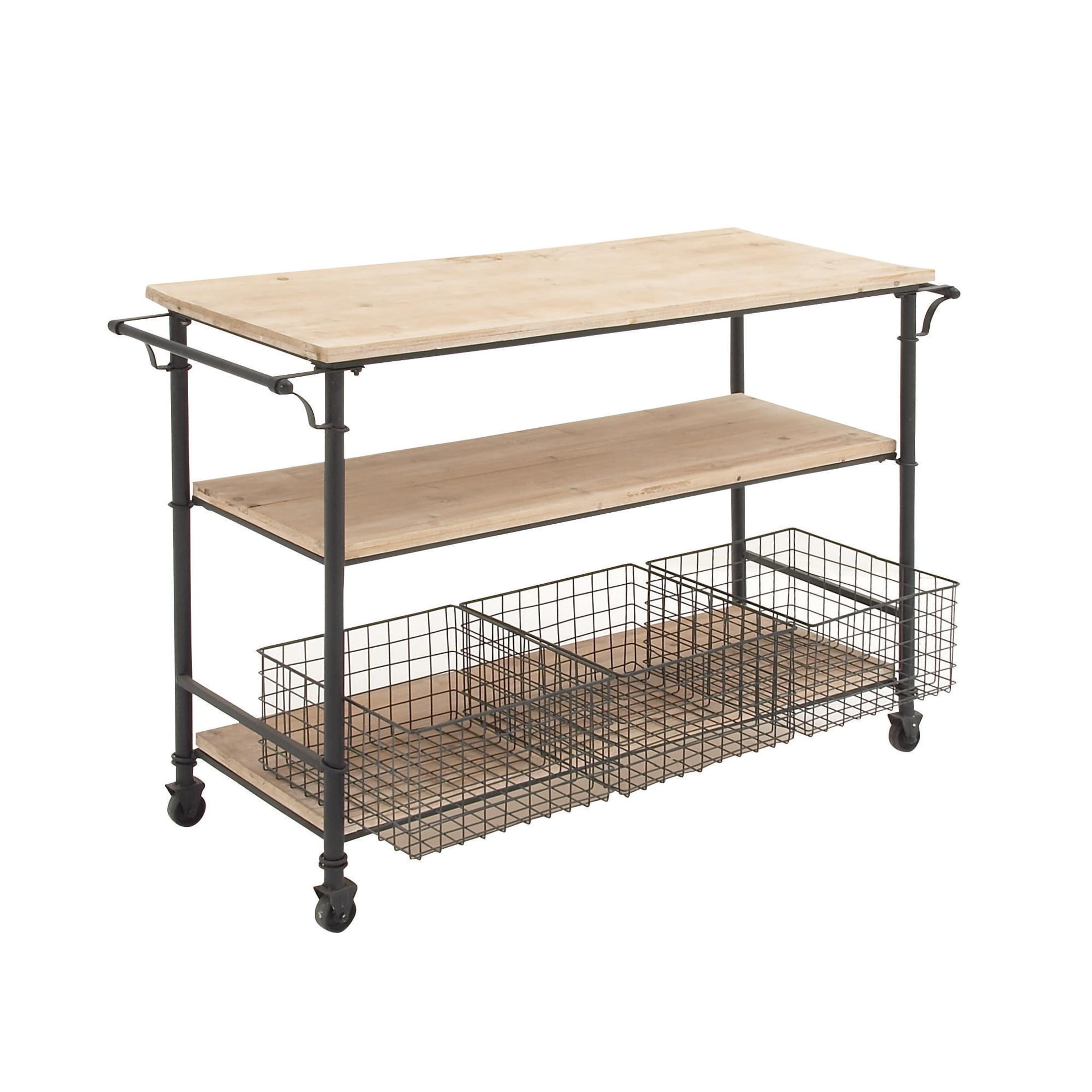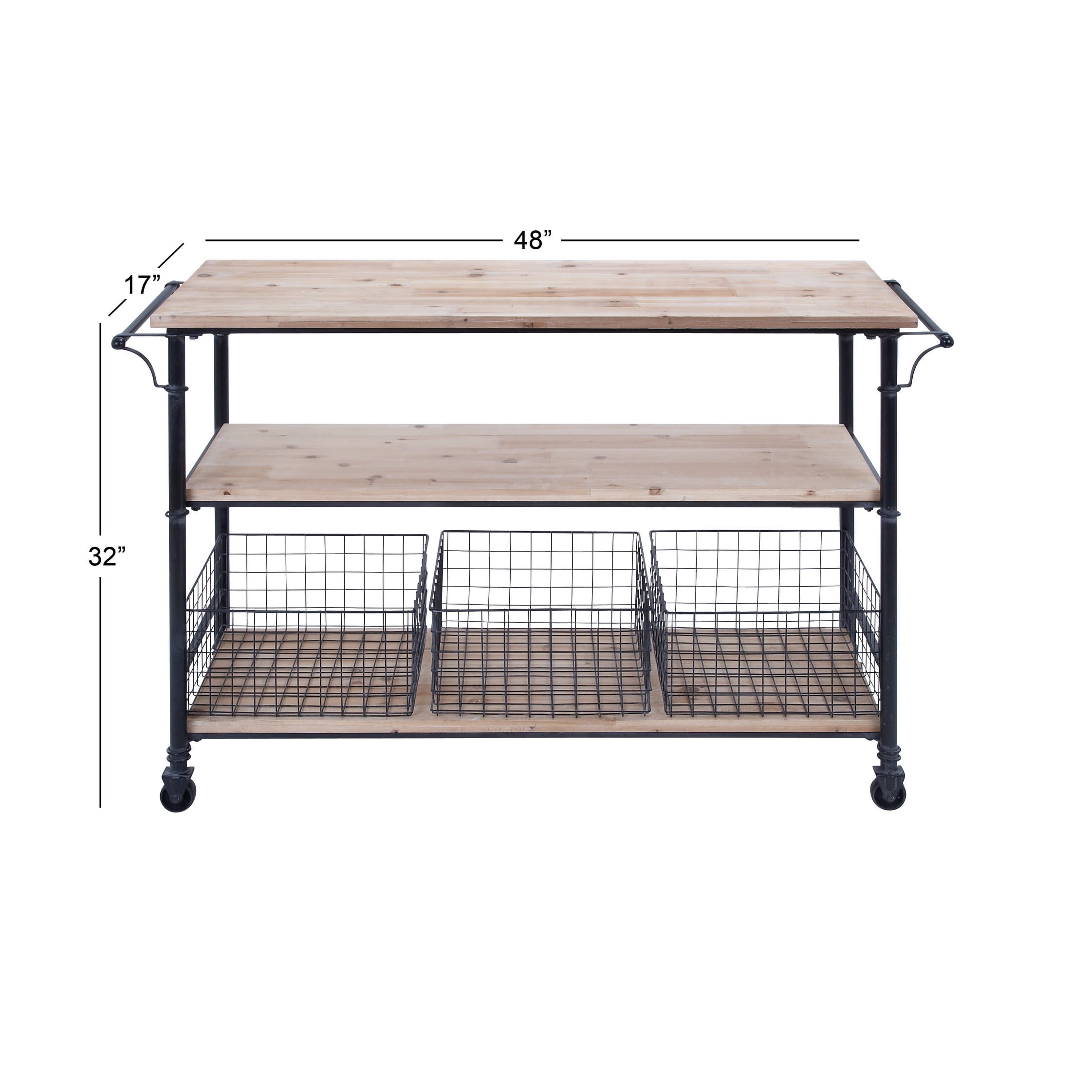 DecMode Industrial Brown 3 Tier Wooden Rolling Cart with 3 Baskets, 48″W x 32″H