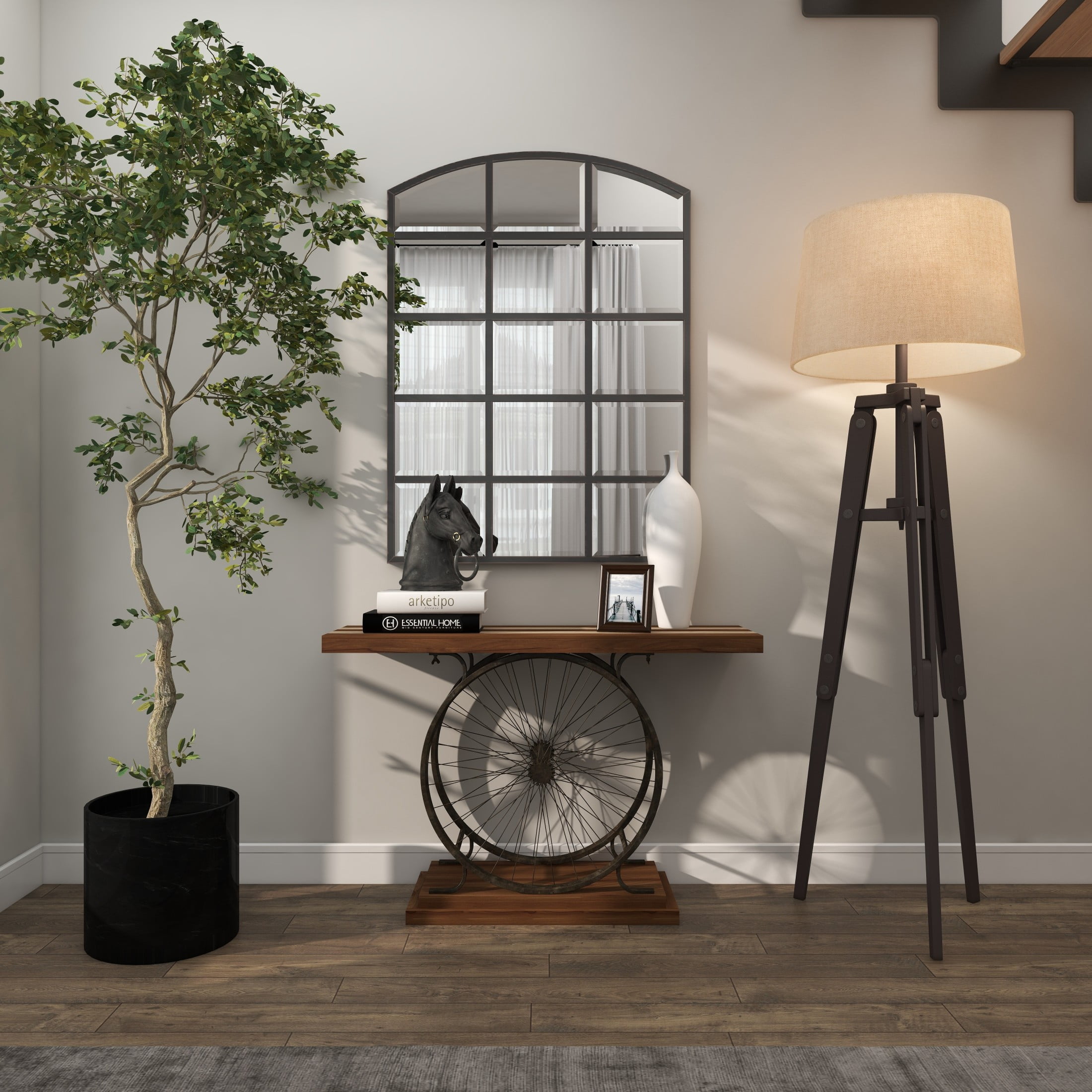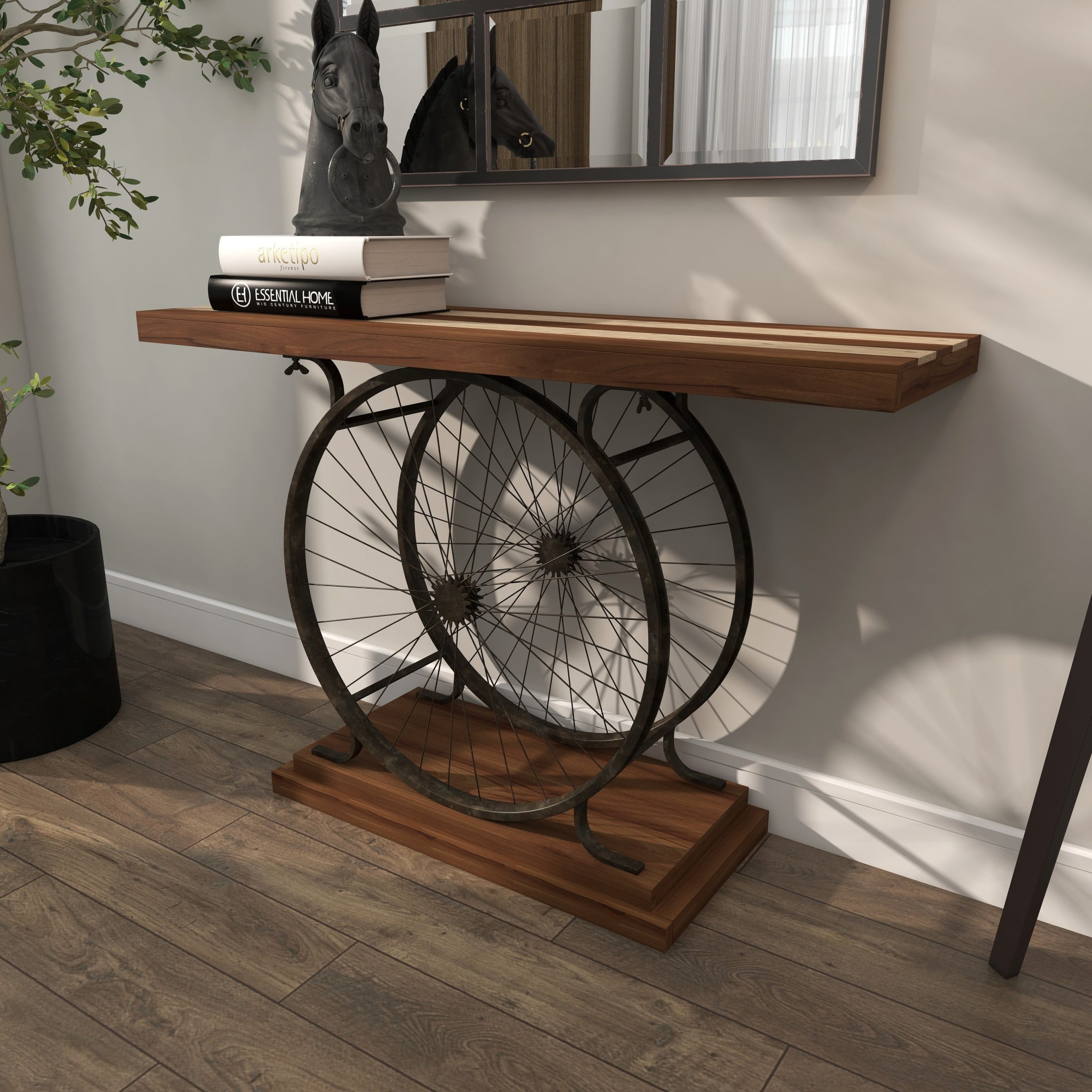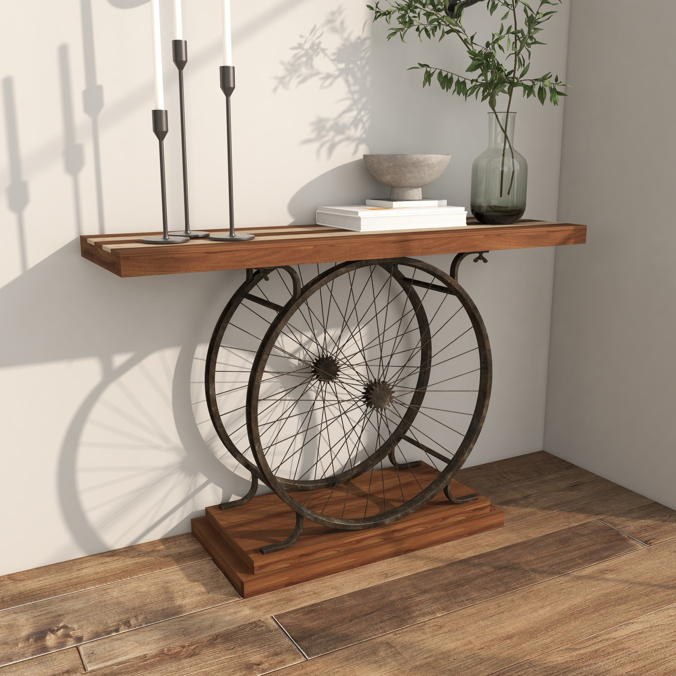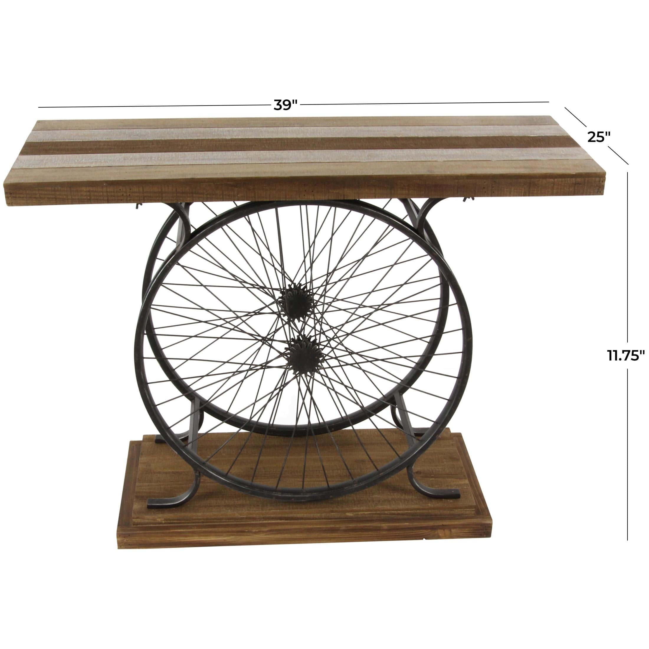 Designed with rugged charm and edgy allure, where metal finishes and raw materials unite to create an urban aesthetic that showcases your artistic expression The brown living room console table is crafted from iron and fir wood, ensuring durability and style The rectangle living room furniture features an oiled brown finish with different shade variations, supported by a black metal frame This wood console table features a two-tone wood design with dual bicycle wheels on a tiered platform for an elevated display The brown wood console table measures 39L x 11.75W x 25H inches, and weighs 30 lbs The oiled brown home table showcases a rectangular wooden tabletop and base with a wheel-shaped metal body with inner rods arranged in a unique pattern Wipe clean with a dry cloth The industrial home console table features intricately forged iron to form its wheel-designed center base, with a carved wooden tabletop and bottom platform attached Industrial style DecMode 39″ x 25″ Brown Wood Wide Slatted Top Bike Console Table with Dual Wheel Frame and Tiered Base, 1-Piece makes a perfect addition to any home