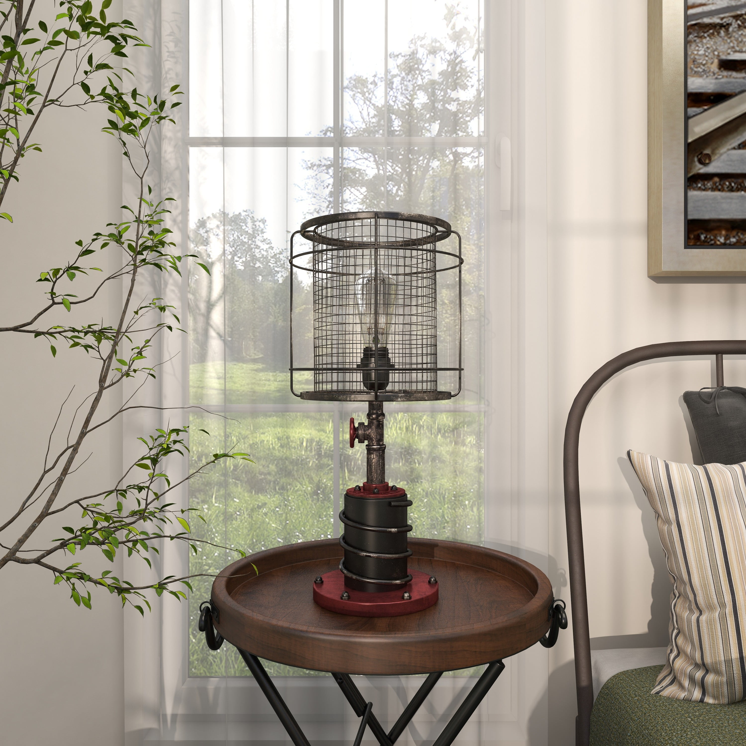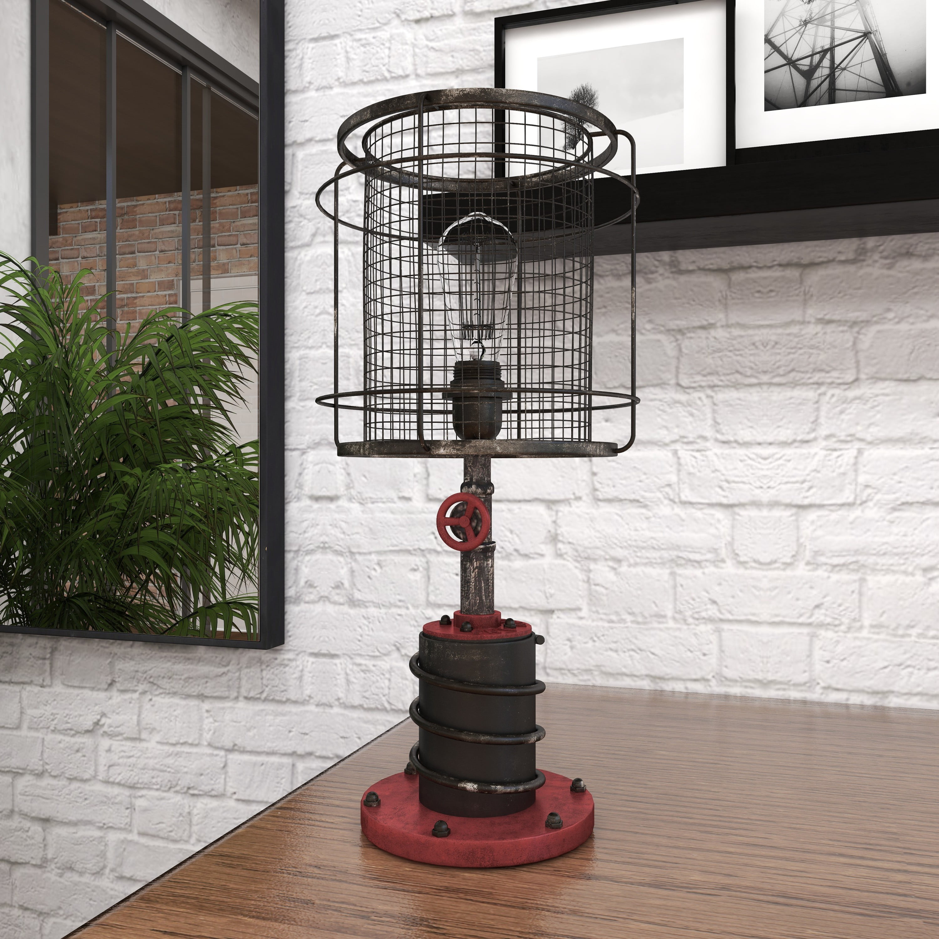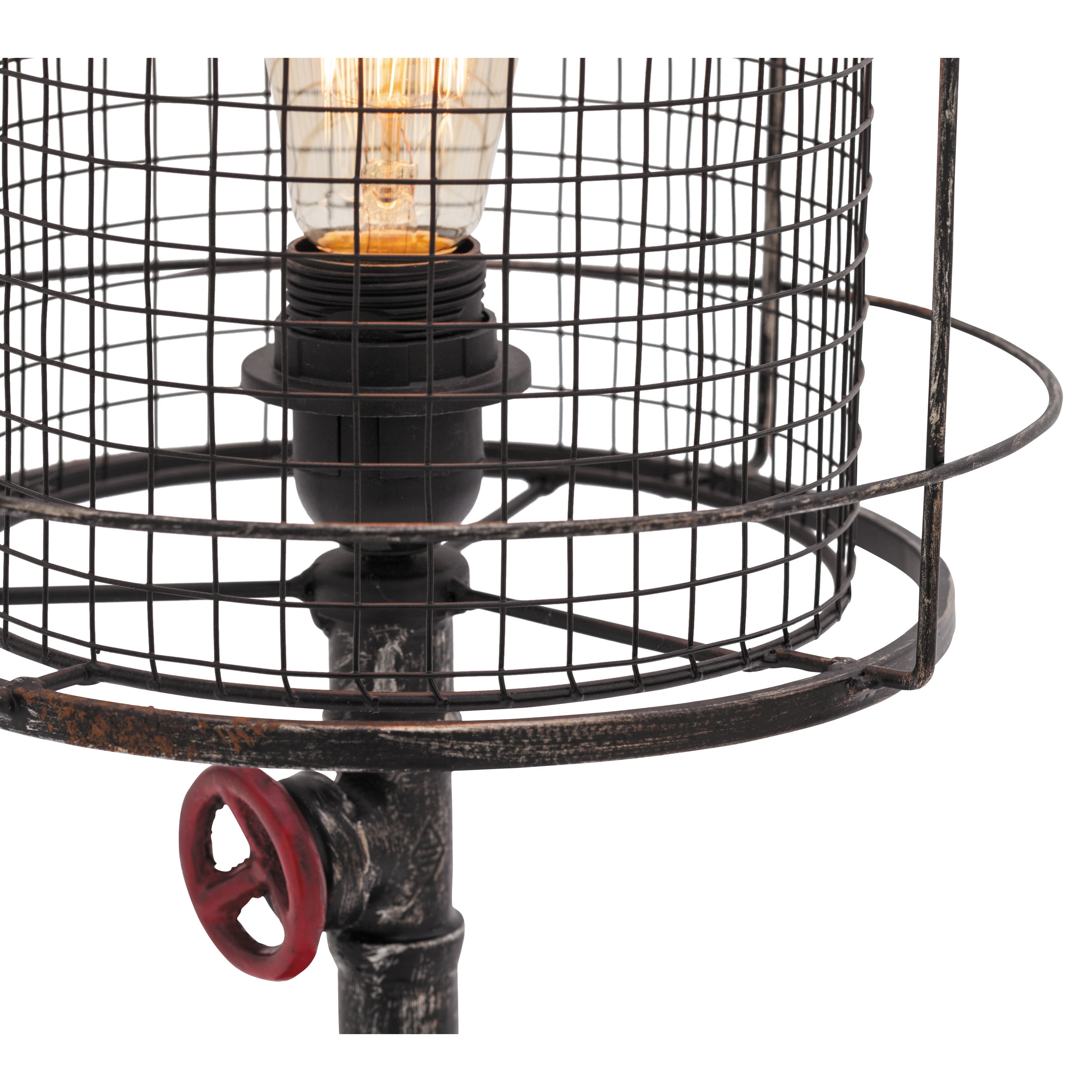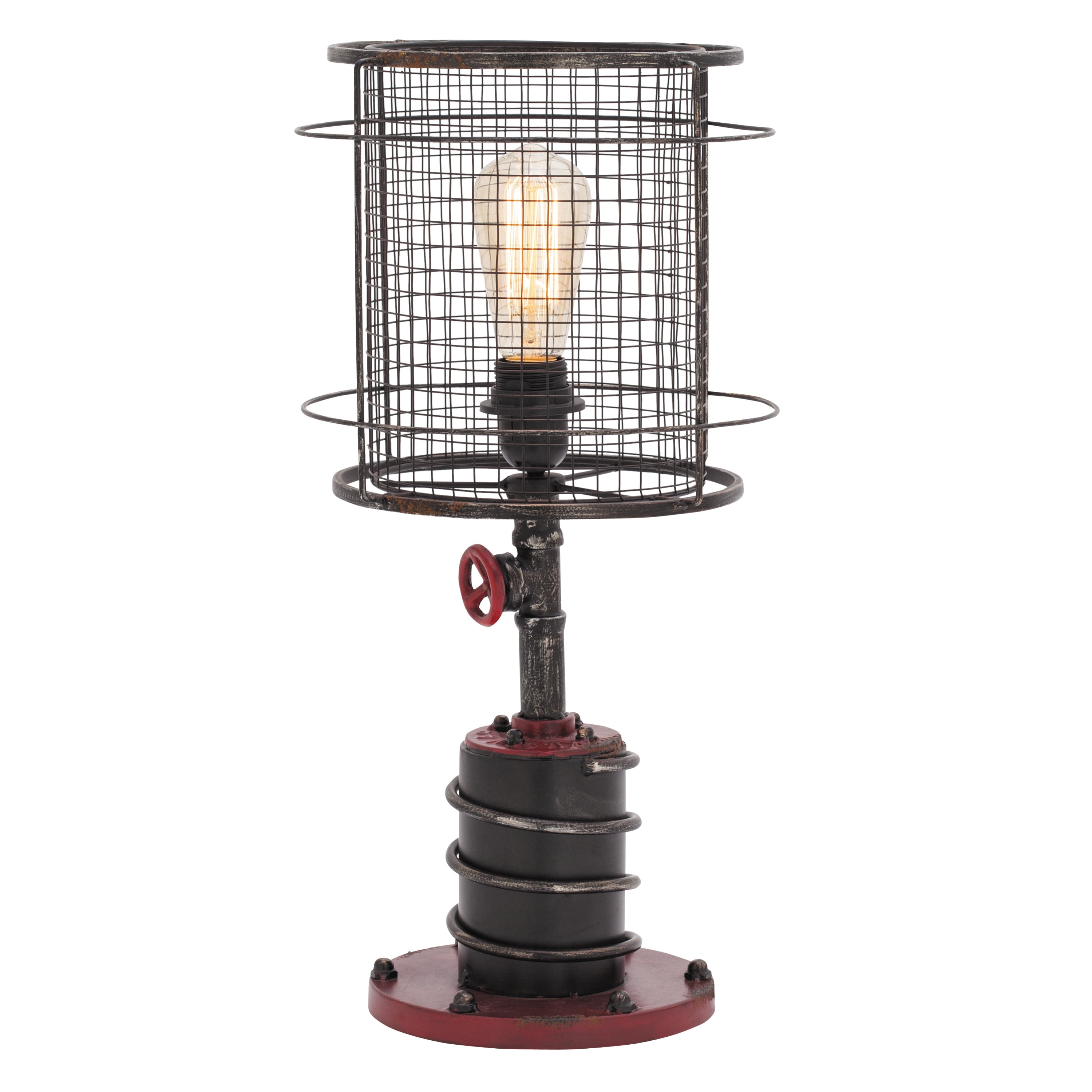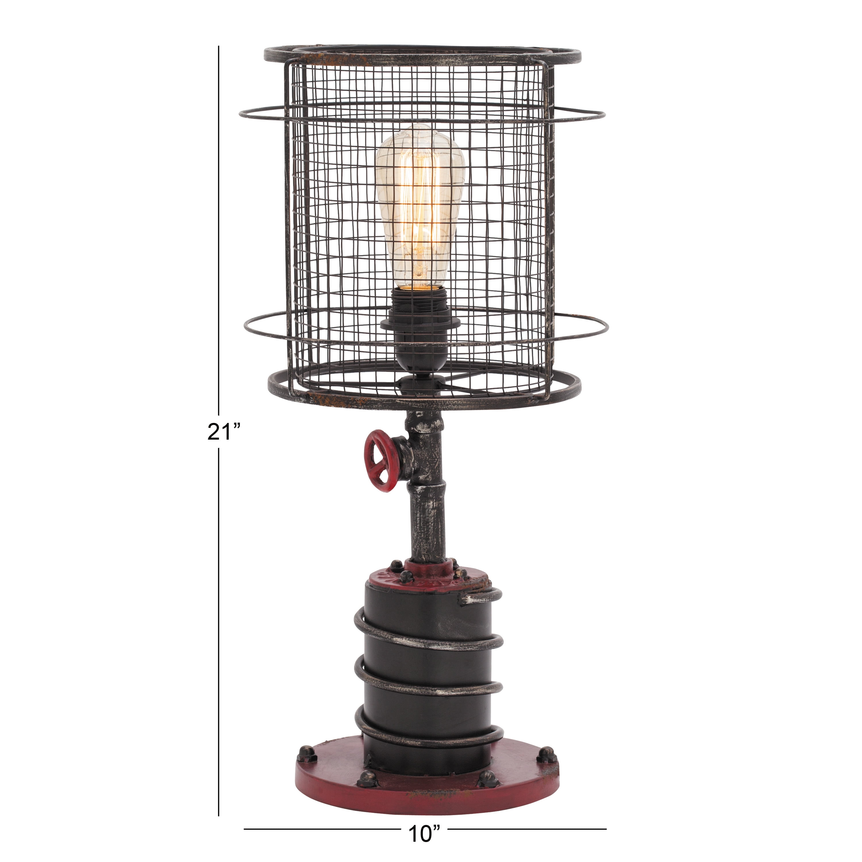 Designed with rugged charm and edgy allure, where metal finishes and raw materials unite to create an urban aesthetic that showcases your artistic expression Made of a solid iron lamp shade and base with glass Edison bulb included Item features a black and red accent lamp with semi distressed finish Unique black lamp with a tall, round, open metal mesh cage lampshade Each accent lamp measures 10.50L x 10.50W x 21H inches, and weighs 3.62 lbs Unique industrial lamp with a cylinder cage shade and mechanical cylinder base with bolts Wipe clean with a dry cloth Red and black lamp is constructed of welded metal and attached to an Edison bulb lamp Industrial style DecMode Industrial Inspired Red Accent Lamp with Black Metal Shade (2 Count) makes a perfect addition to any home