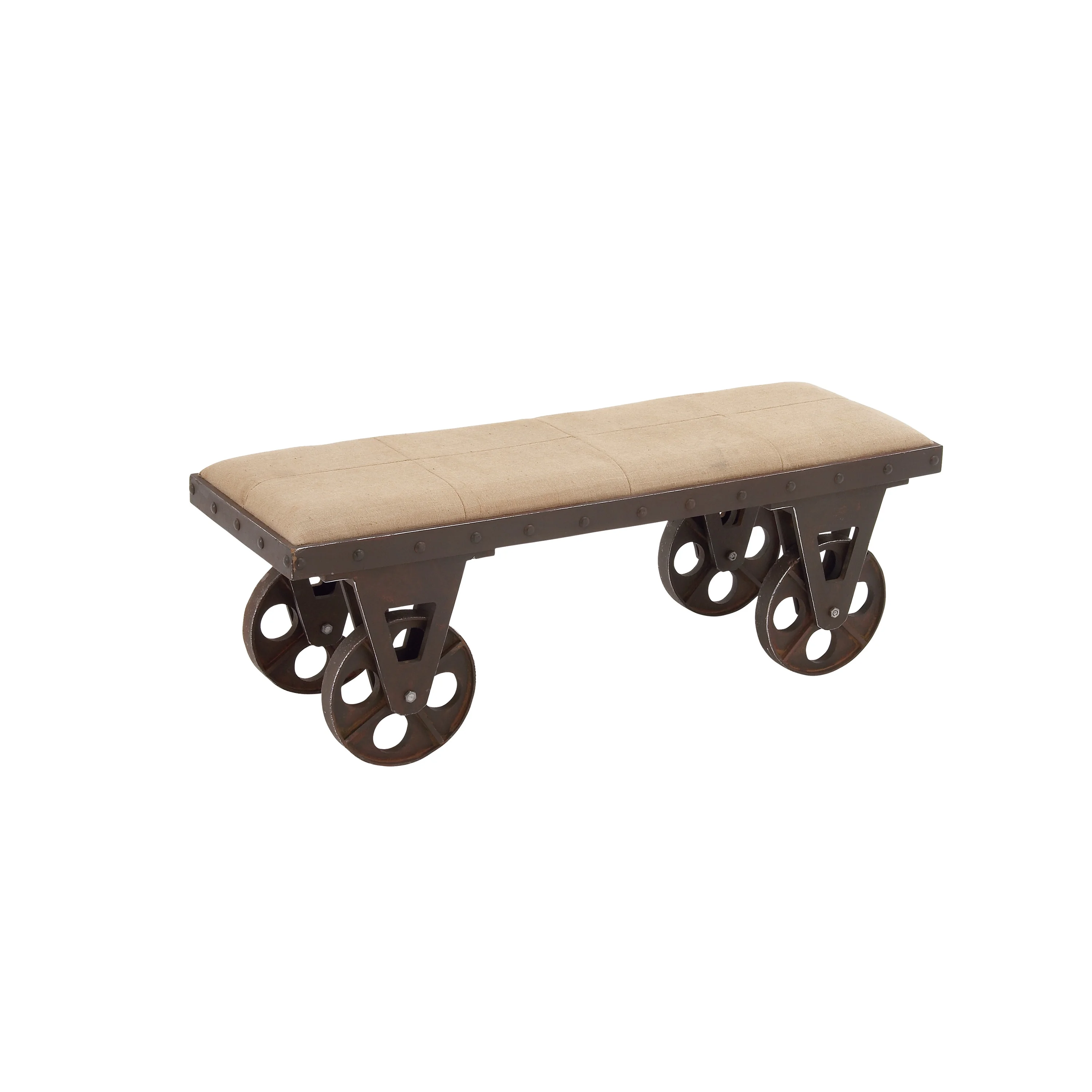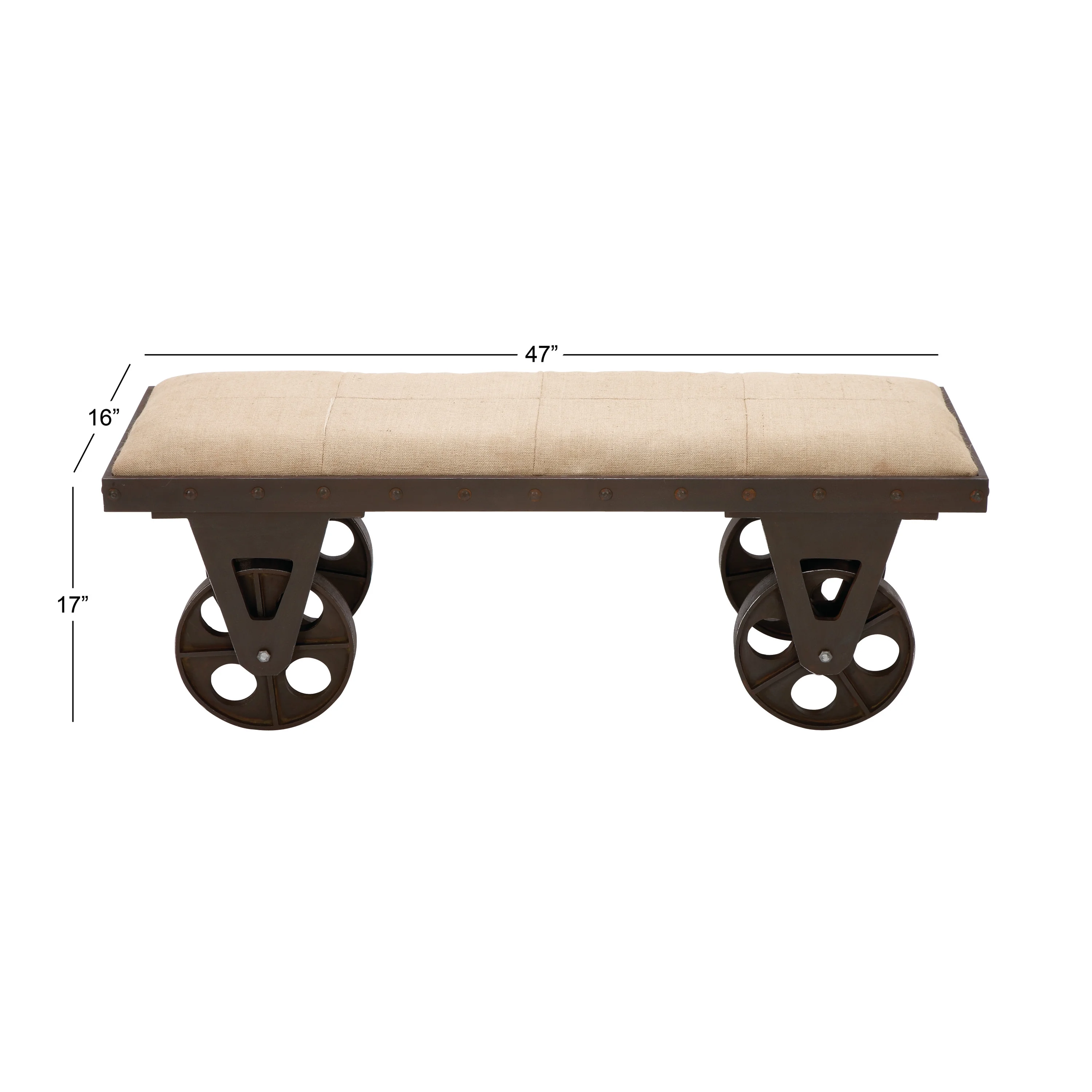 Designed with rugged charm and edgy allure, where metal finishes and raw materials unite to create an urban aesthetic that showcases your artistic expression Rolling cart tyle bench is composed of a combination of metal, mdf and fabric Vintage metal bench has a beige colored fabric with dark brown push cart style legs Brown metal bench features a wagon style structure with 4 round wheels and bolted detailing around the plush upholstered seat The bench measures 47L x 16W x 17H inches, and weighs 30.87 lbs This fabric bench comes in a rectangular surface with wheels as legs Wipe clean with a dry cloth This fabric bench is shaped and welded wood and iron materials topped with fabric Industrial style DecMode Wooden Bench with Wheels, Brown makes a perfect addition to any home