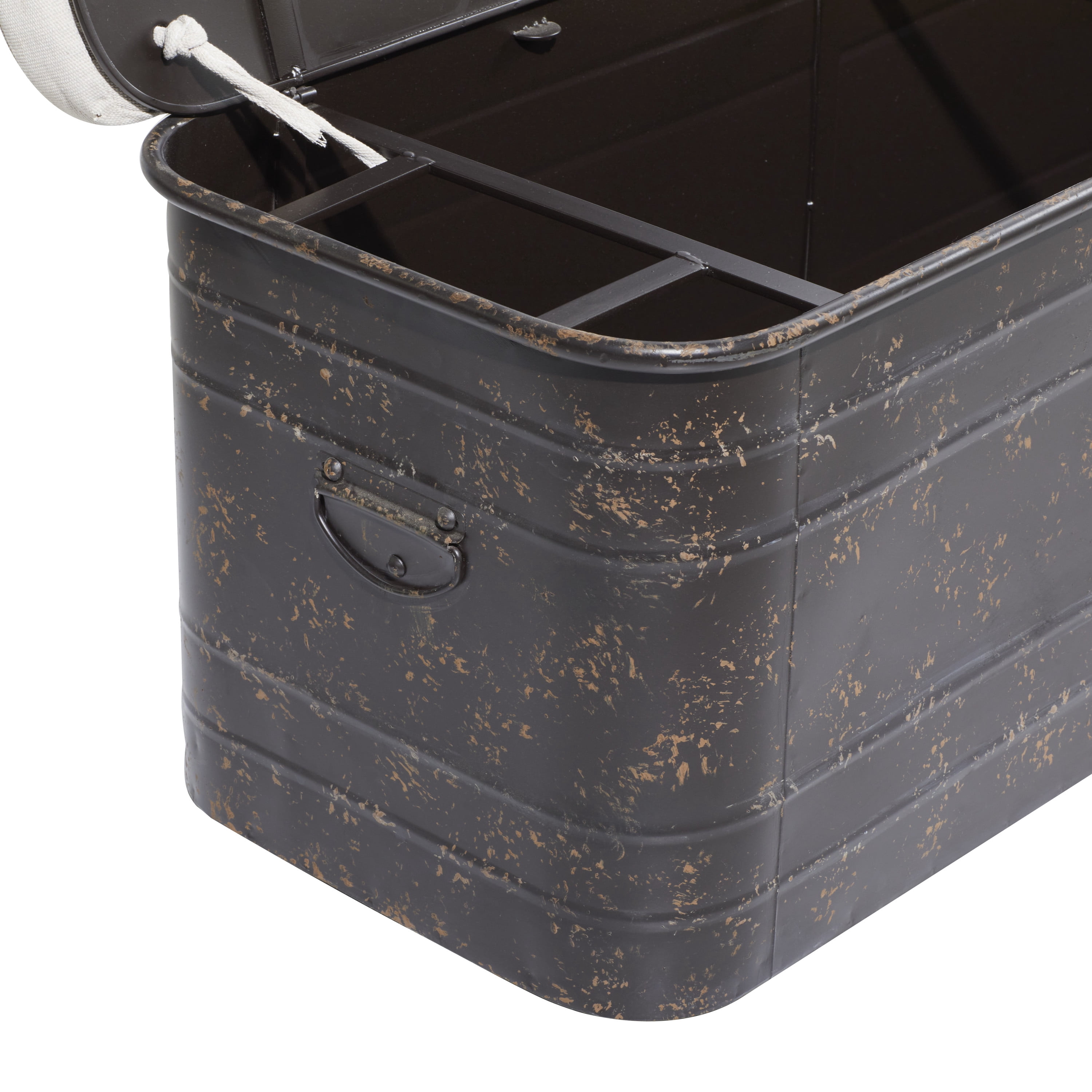 Designed with rugged charm and edgy allure, where metal finishes and raw materials unite to create an urban aesthetic that showcases your artistic expression Entryway upholstered storage bench is made a solid iron with fabric seat Light beige fabric seat over dark brown-painted iron body with heavy distressing Industrial long bench features upholstered seat and hand-painted typography, with latch closure that lifts open to reveal spacious storage inside The storage bench measures 48L x 16W x 17H inches, and weighs 28.0 lbs This rectangle metal bench with storage and cushion carries a dark brown exterior Wipe clean with a dry cloth This entry bench with shoe storage is molded with a rectangular bench seat that opens to a wide container and welded with two swing handles Industrial style DecMode Metal Storage Bench with Cream Burlap Top and Latch, Brown makes a perfect addition to any home