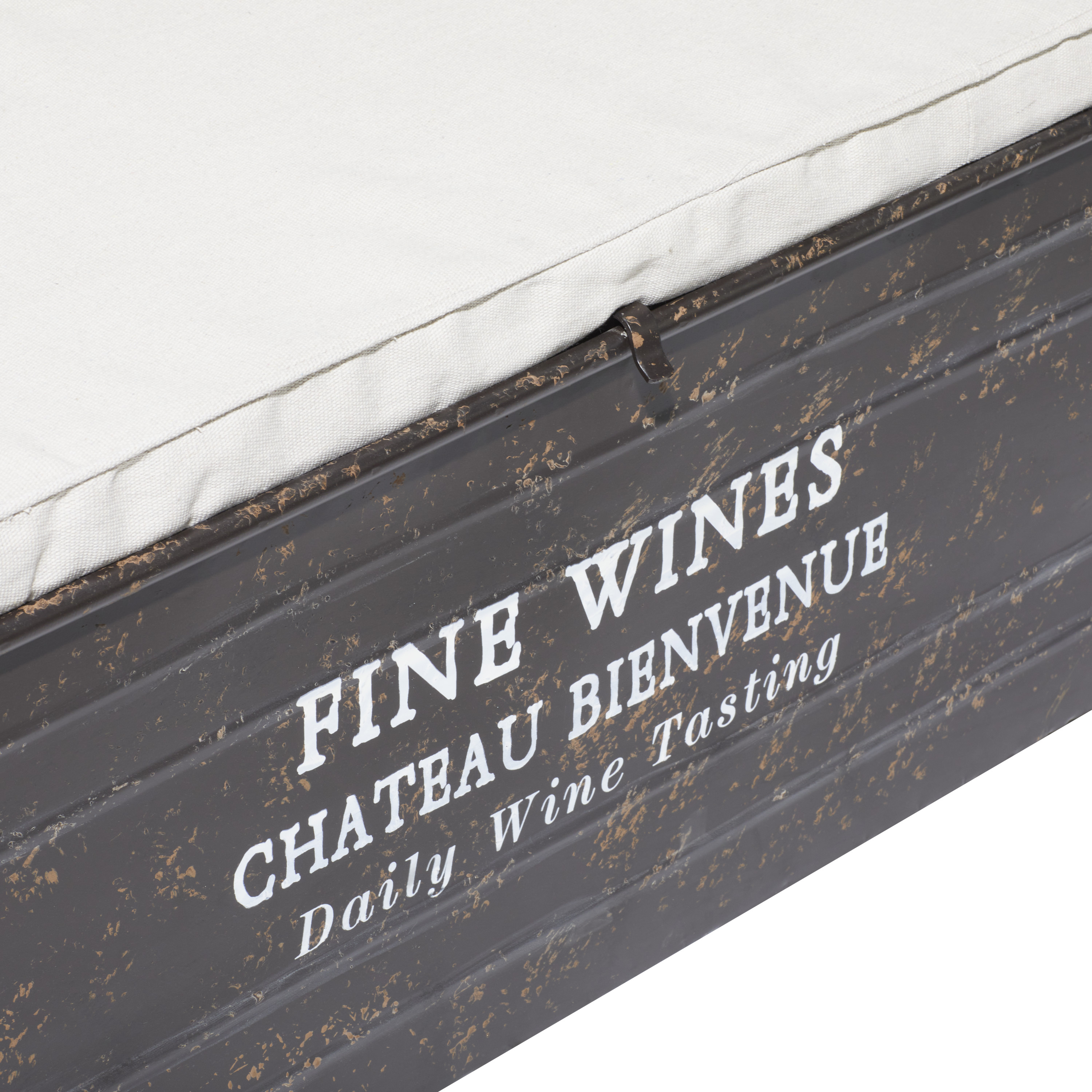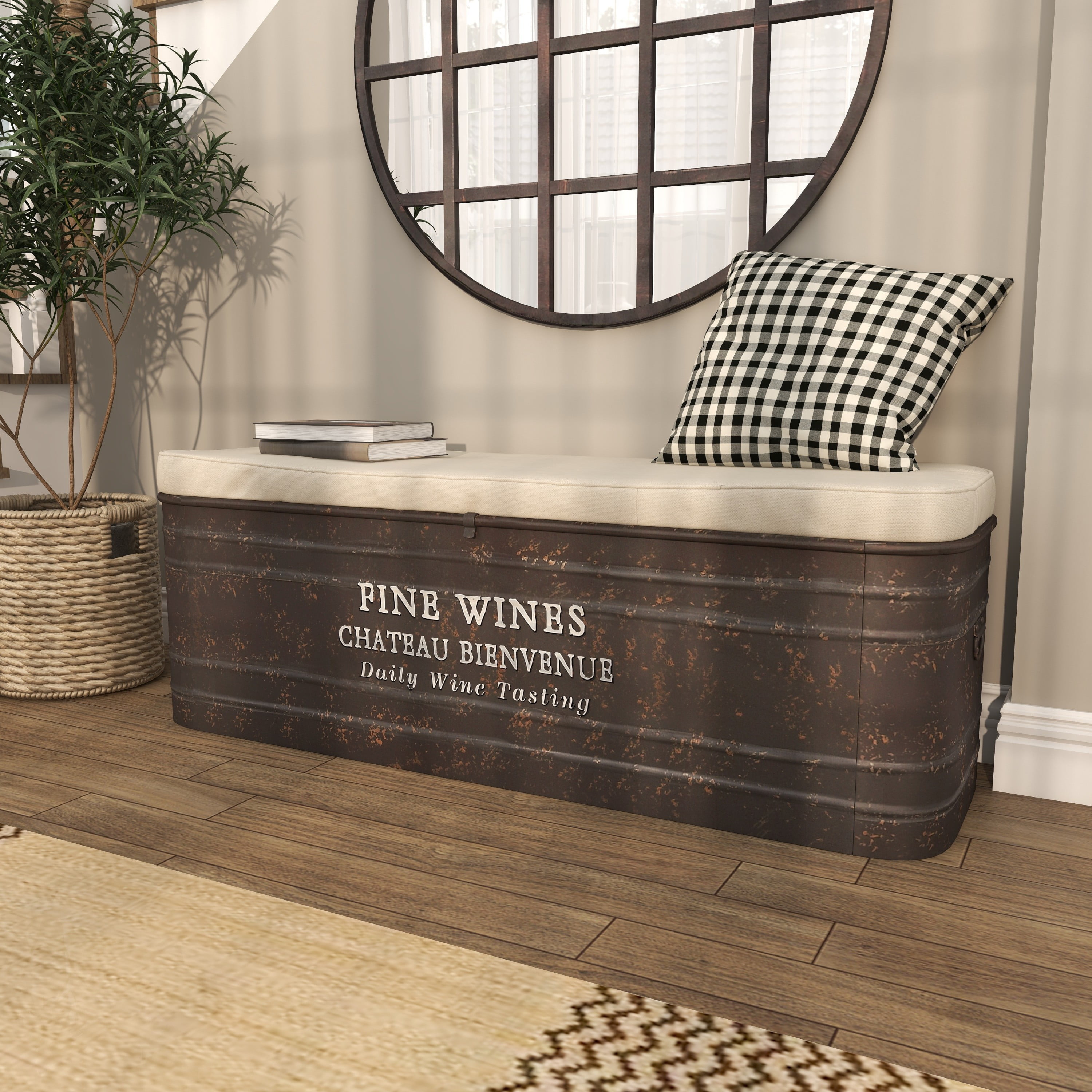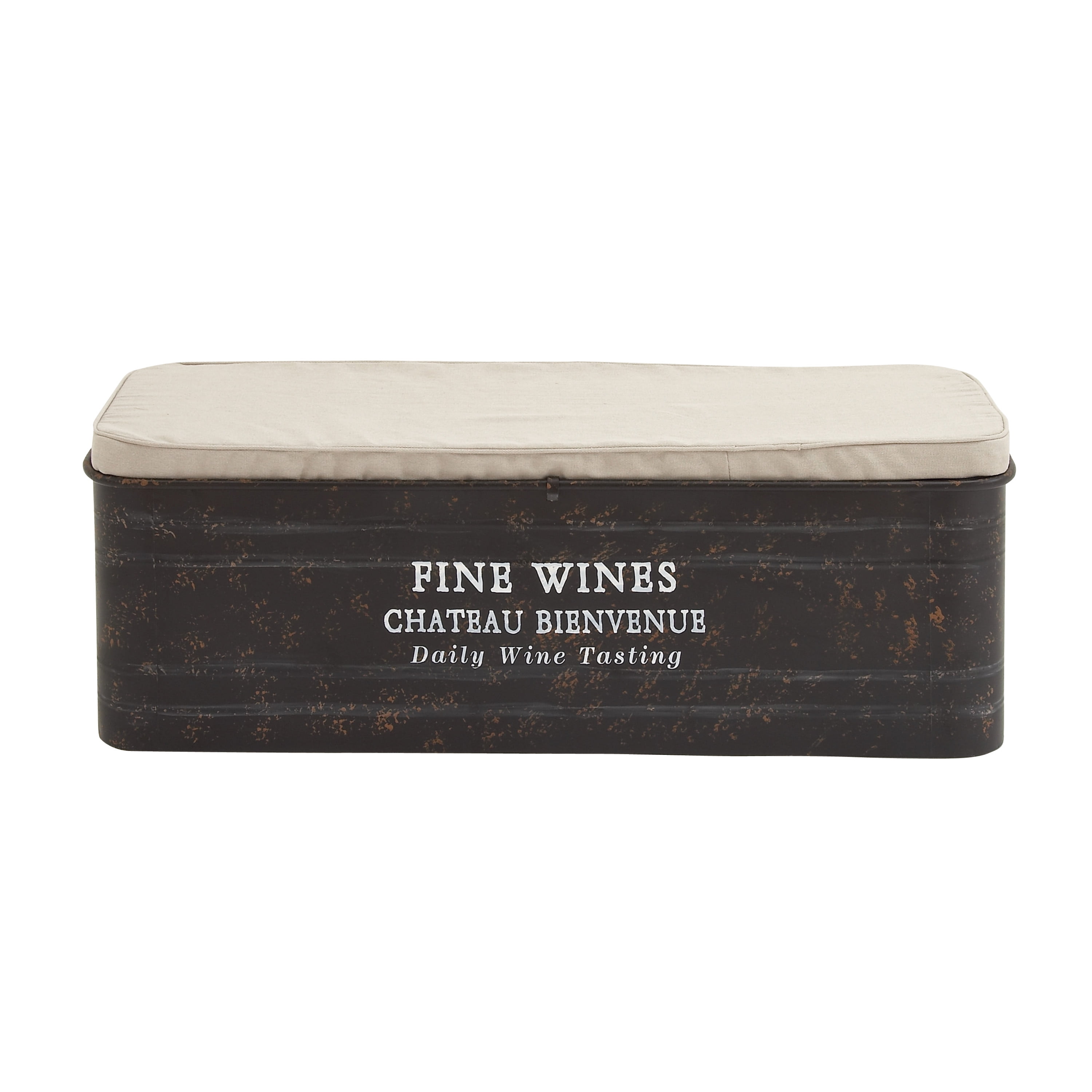 DecMode Metal Storage Bench with Cream Burlap Top and Latch, Brown is a unique addition to your stylish home. Rectangular storage bench will complement dark leather sofa with other heirloom decor for the perfect antique design style. This item ships in 1 carton. Suitable for indoor use only. This item ships fully assembled in one piece. Maximum weight limit is 250 lbs. Can accommodate 2 people. This is a single brown colored entryway bench. Industrial style. Typography includes “FINE WINES, CHATEAU BIENVENUE, Daily Wine Tasting”.