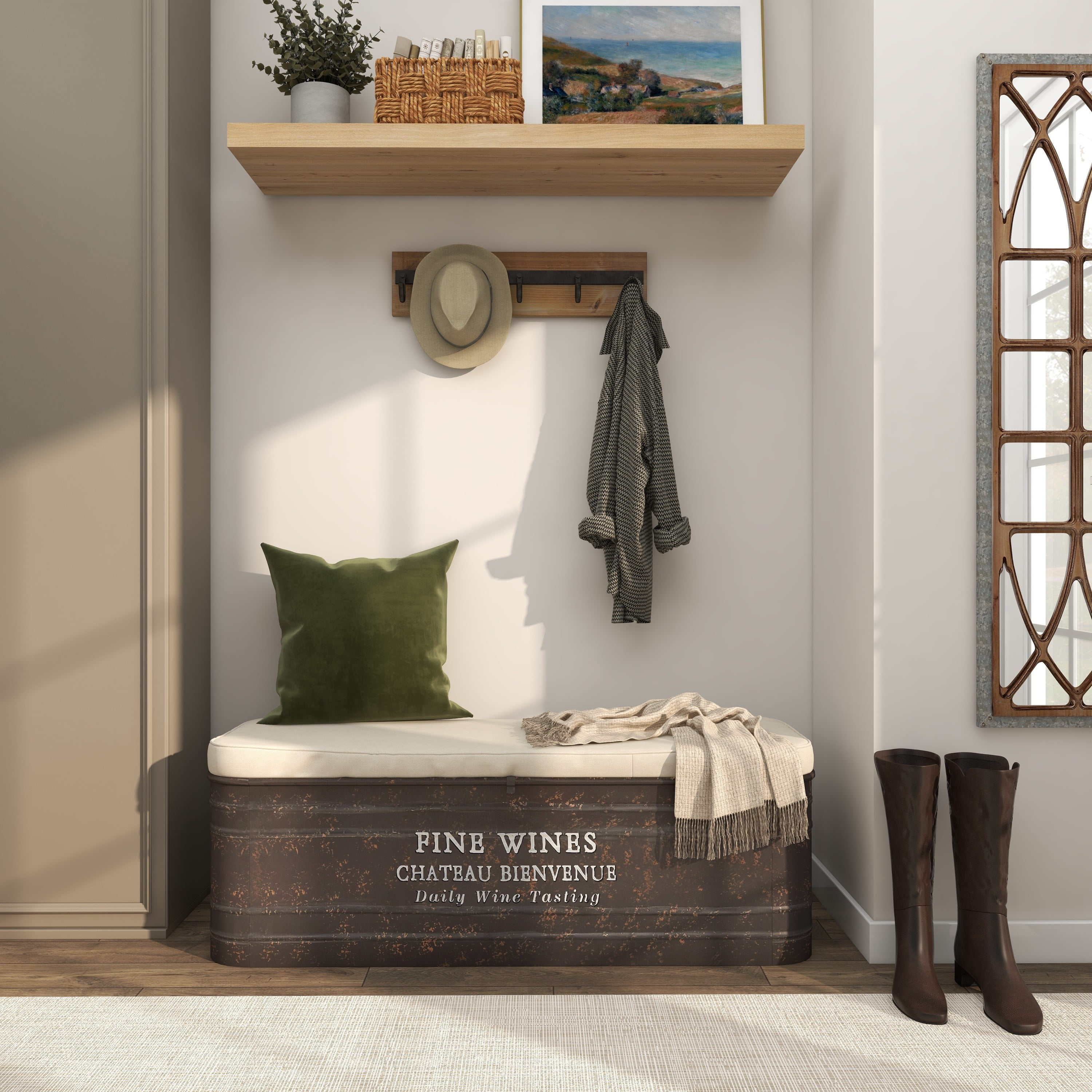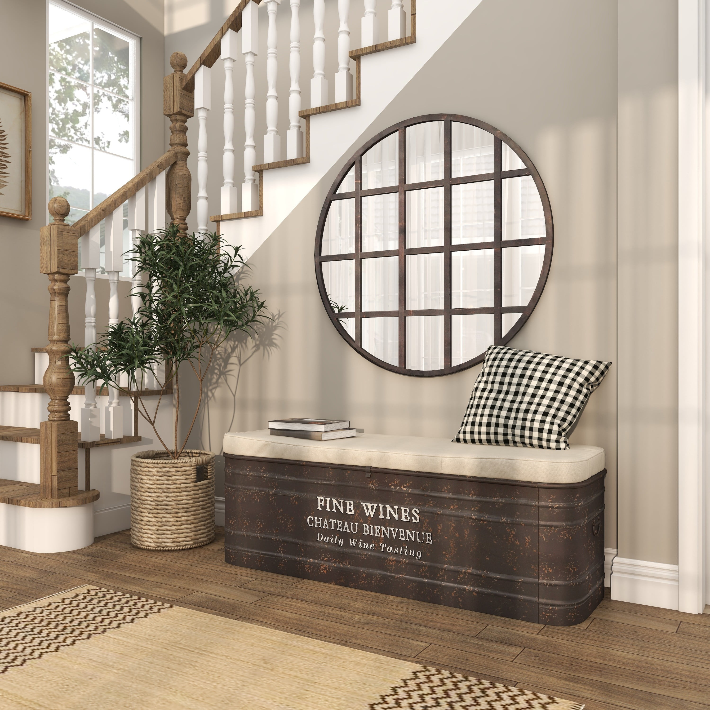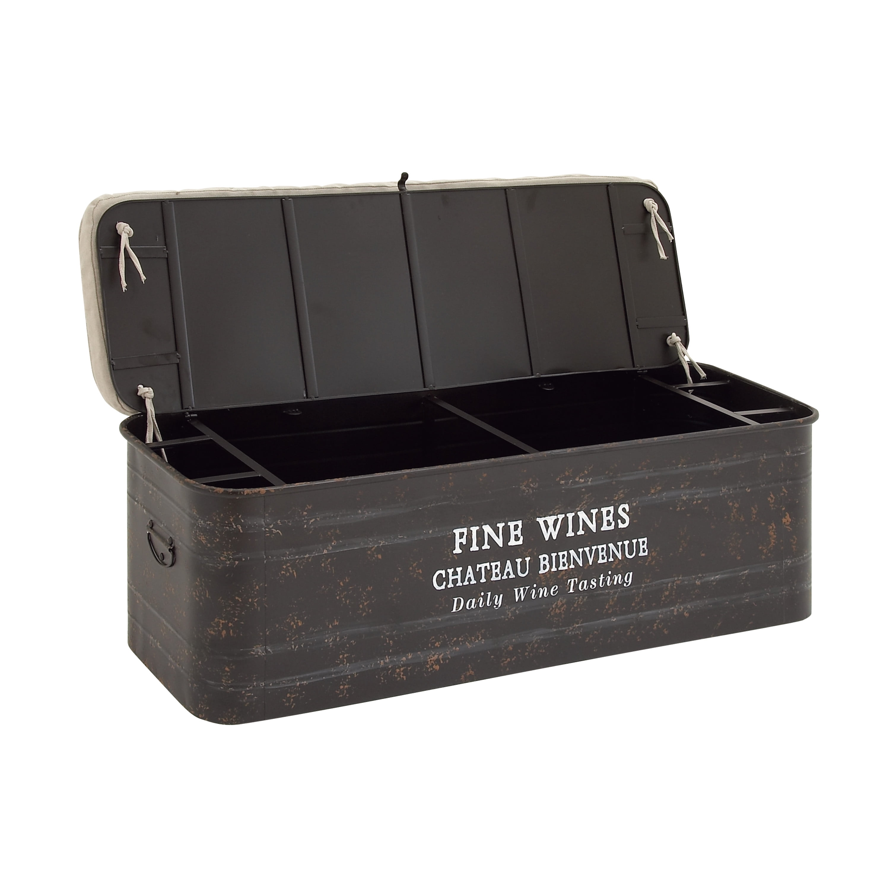 DecMode Metal Storage Bench with Cream Burlap Top and Latch, Brown is a unique addition to your stylish home. Rectangular storage bench will complement dark leather sofa with other heirloom decor for the perfect antique design style. This item ships in 1 carton. Suitable for indoor use only. This item ships fully assembled in one piece. Maximum weight limit is 250 lbs. Can accommodate 2 people. This is a single brown colored entryway bench. Industrial style. Typography includes “FINE WINES, CHATEAU BIENVENUE, Daily Wine Tasting”.