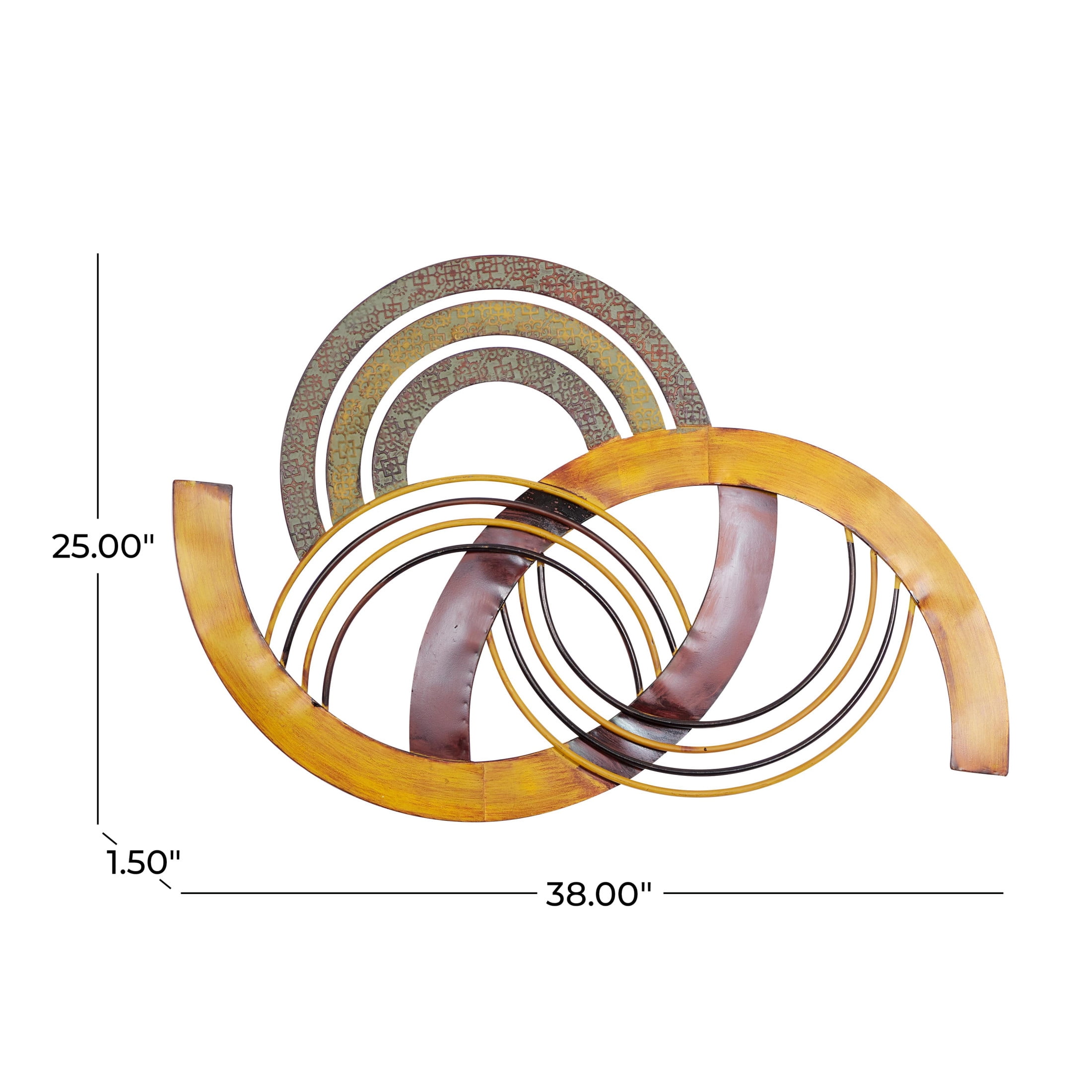Inspired by sleek elegance and clean lines, a minimalistic design offers effortless luxury with monochromatic tones and bold, angular structures Crafted from solid iron materials, this multi-colored home wall decor is robust and durable Arched decor for wall showcases a vibrant blend of textured iron finishes in fire orange, dark brown, and patterned yellow, all coated with a modern satin finish The unique design of this iron wall decor features overlapping semi-circle bands and rods, making it an intriguing piece to behold The multi colored metal wall decor measures 38L x 1.50W x 25H inches, and weighs 4.75 lbs Satin multi-colored wall art for living room boasts an arched shape with semi-circles attached and overlapping one another, creating elaborate pattern details that make it a true work of art Wipe clean with a dry cloth Each material in this modern room wall decor has been meticulously shaped and welded to form the intricate overlapping design Modern style DecMode Multi Colored Metal Abstract Wall Decor makes a perfect addition to any home