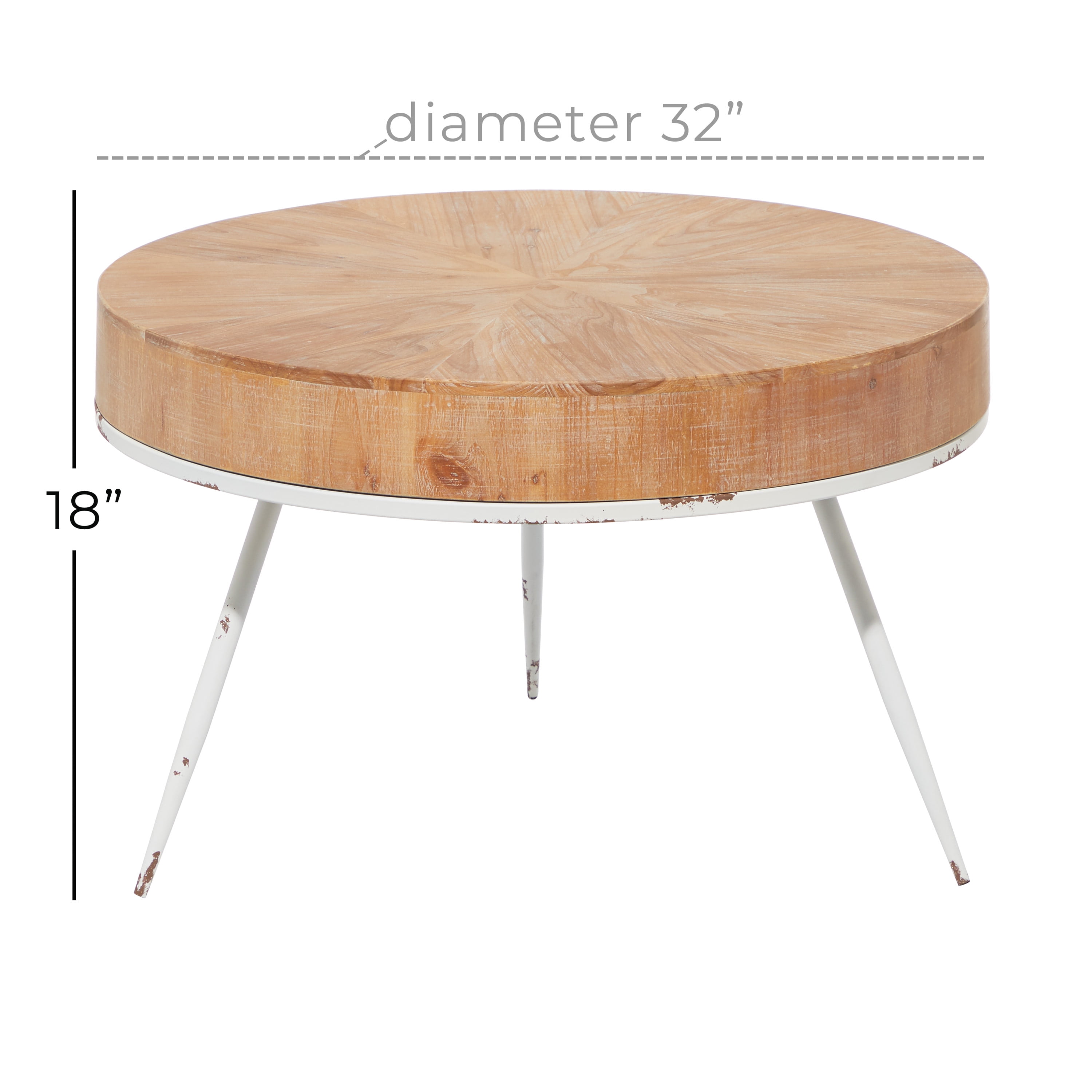 DecMode Natural Brown/Tan Wood Modern Style and Minimalist Design Round Coffee Table with a White Distressed Metal Base, 32″W x 18″H,