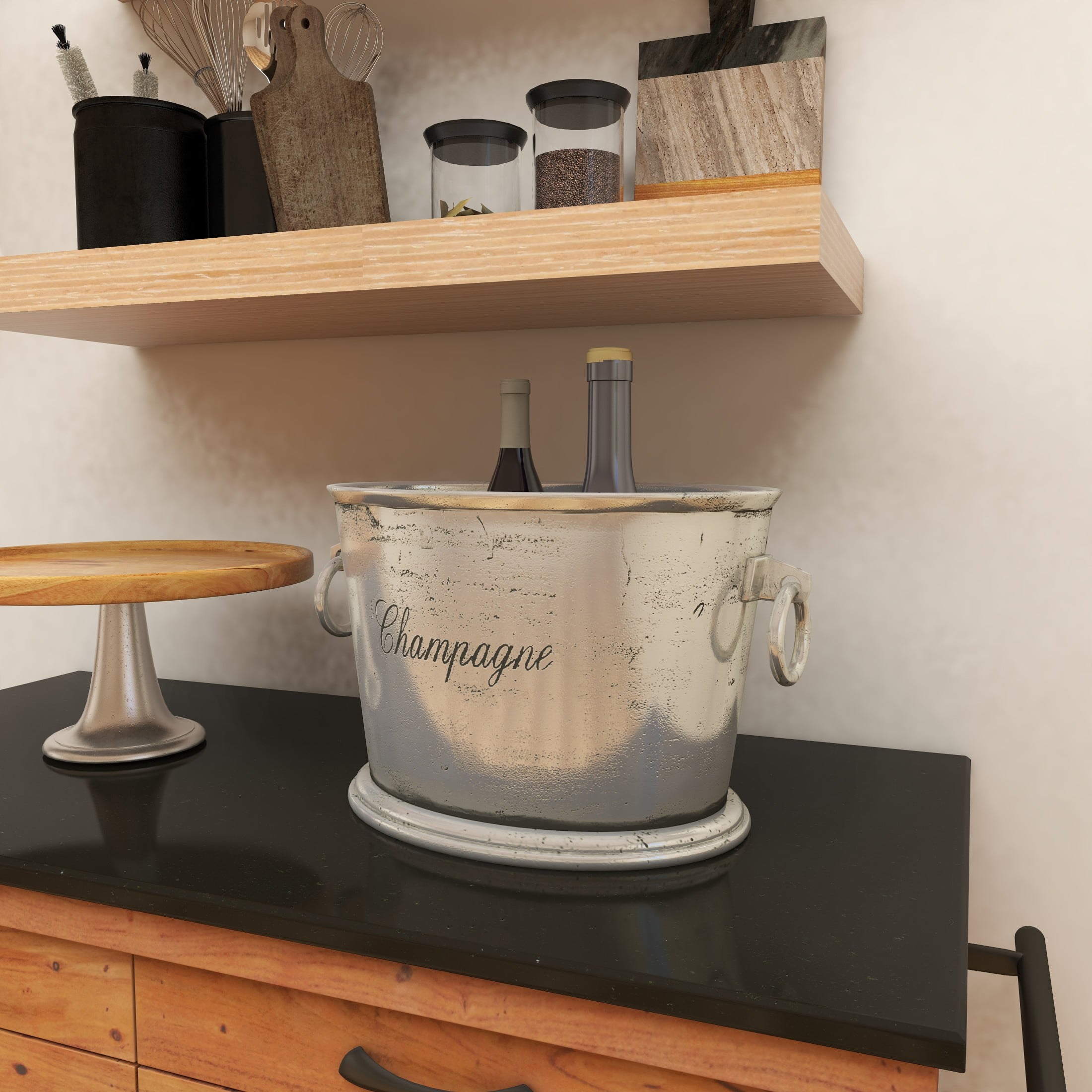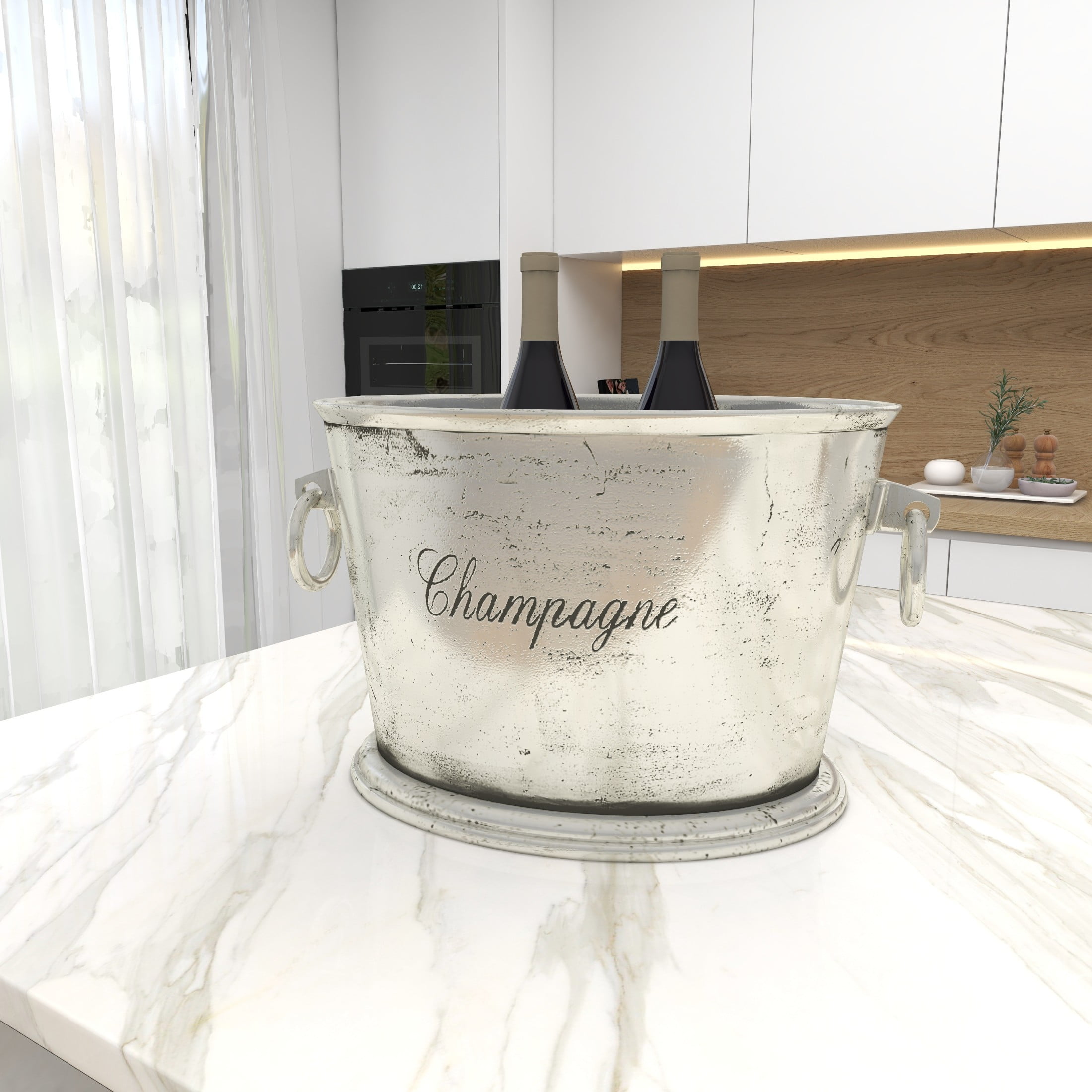 Designed with timeless sophistication, rich old-world textures and warm hues come together for a refined classic taste of luxury A wine cooler made from pure aluminum metal and crafted in India An oval-shaped wine cooler which features an embossed “Champagne” sign, polished silver, and a weathered finish Holds 3-4 bottles with ice comfortably with ring handles for easy transport The silver aluminum metal ice bucket measures 17L x 10W x 10H inches, and weighs 13.20 lbs This cloche features a round marble base with a glass dome lid furnished with a round knob Wipe clean with a dry cloth This cloche is made of carved marble base material with a molded glass lid Traditional style DecMode Oval Aluminum Metal Champagne Silver Ice Bucket with Ring Handles makes a perfect addition to any home