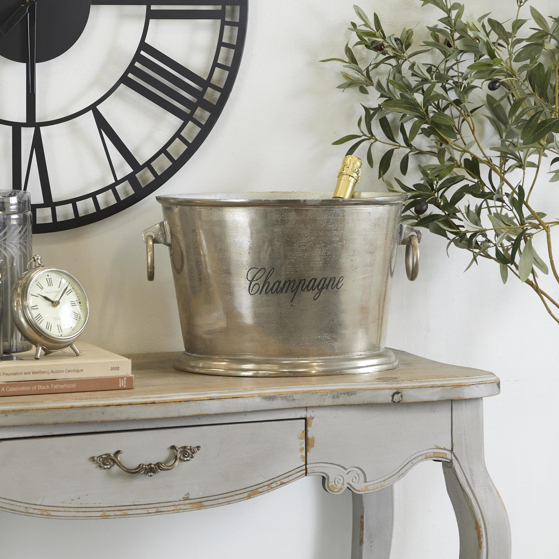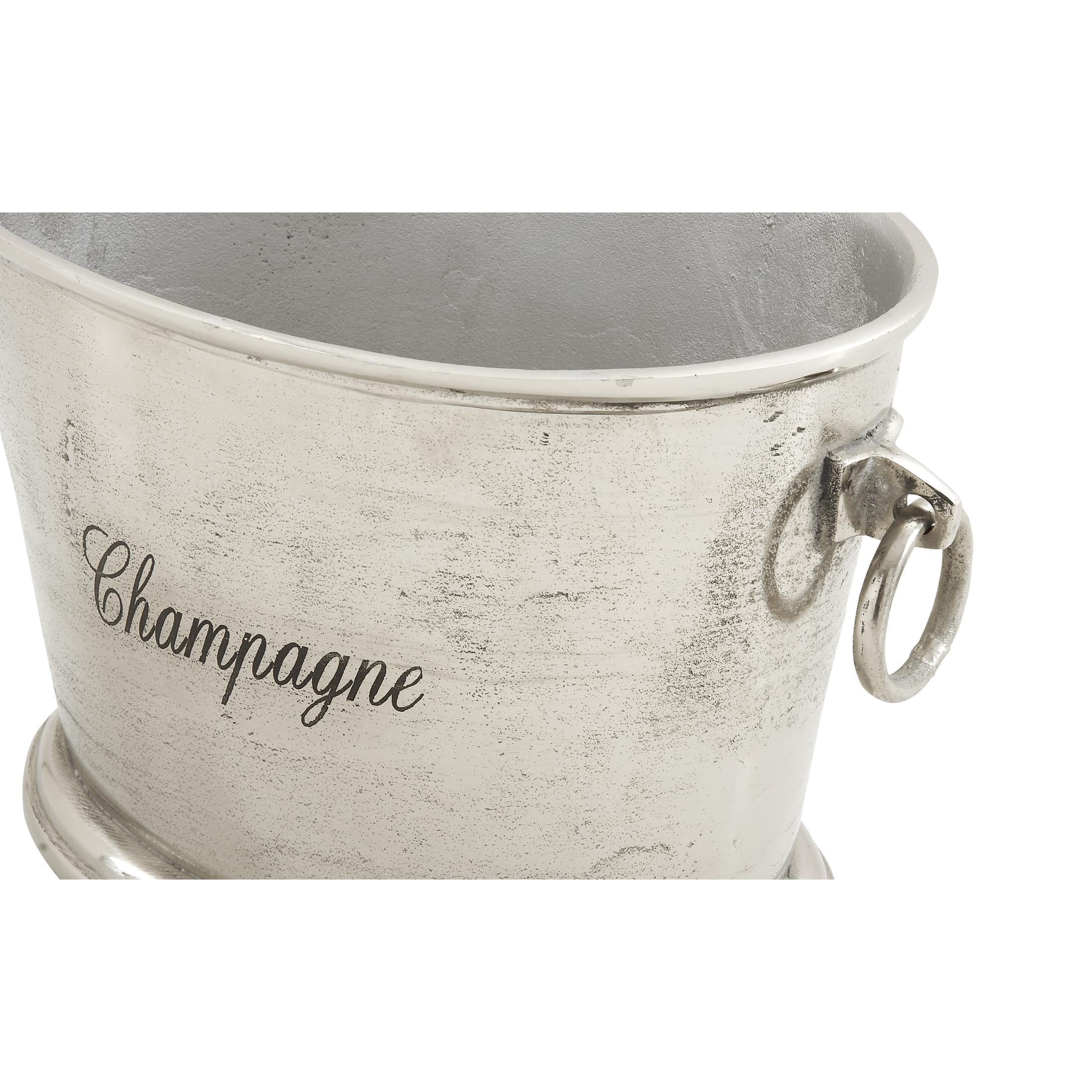 DecMode Oval Aluminum Metal Champagne Silver Ice Bucket with Ring Handles is a unique addition to your stylish home. A good storage item for display as well on patio or bar spaces of homes. This item ships in 1 carton. Aluminum ice bucket makes a great gift for any occasion. Suitable for indoor use only. This item ships fully assembled in one piece. Maximum weight limit is 5 lbs. Made in India. This is a single silver colored champagne bucket. Traditional style. Silver ice bucket can hold 3 average wine bottles. Showcases “Champagne” in cursive typography.