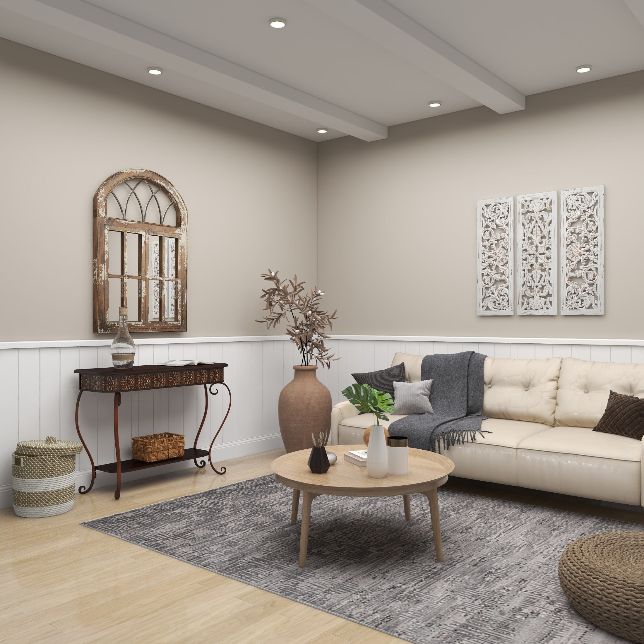 Designed with timeless sophistication, rich old-world textures and warm hues come together for a refined classic taste of luxury The brown living room console table is crafted from iron and MDF, blending durability with style Rectangle living room furniture highlights a polished brown finish and copper metal frame, exuding classic elegance Iron console table features stamped nouveau riche side panels and elegant scroll leg stands, blending artistry with a touch of opulence The brown metal console table measures 43L x 14W x 32H inches, and weighs 27.20 lbs Polished brown home table exhibits a rectangular silhouette with rounded edges and embellished with ornate floral motifs and scrolled legs Wipe clean with a dry cloth Traditional home console table is constructed with intricately welded iron, furnished with wooden top and a bottom shelf, combining durability with classic style Traditional style DecMode 43″ x 32″ Brown Metal Embossed Floral Console Table with Ornate Scroll Legs, 1-Piece makes a perfect addition to any home