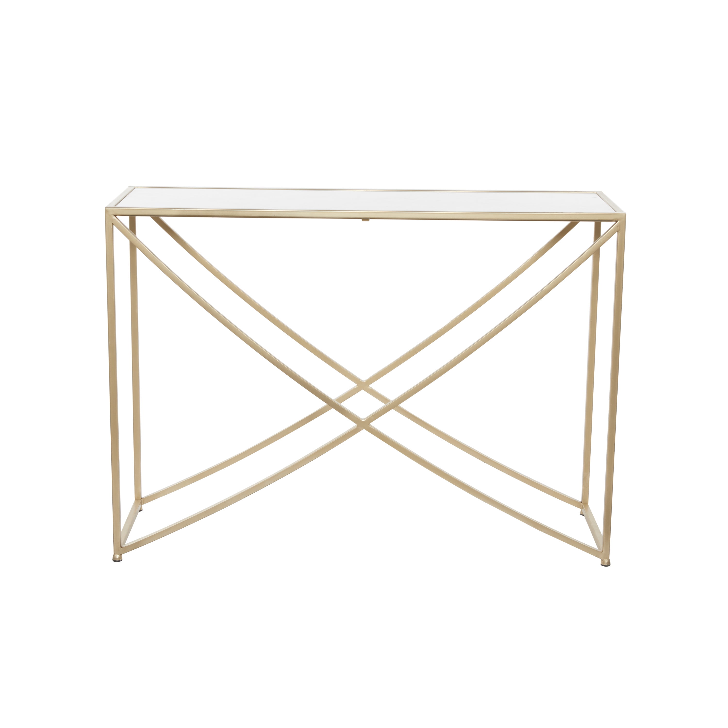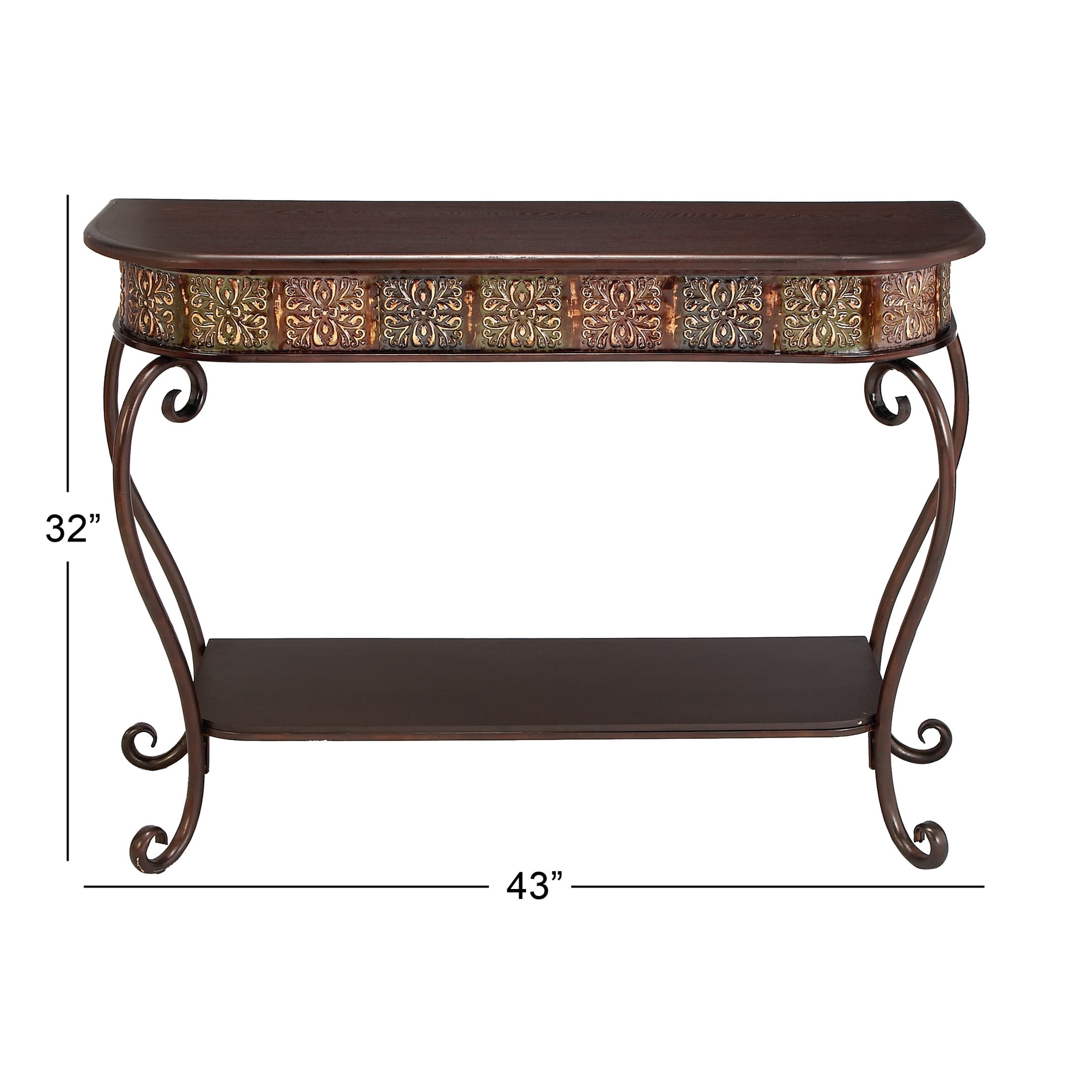 DecMode 43″ x 32″ Brown Metal Embossed Floral Console Table with Ornate Scroll Legs, 1-Piece is a unique addition to your stylish home. Bring a finishing touch to your home with an inviting appeal with this console table. A sturdy and long lasting construction for a years of enjoyment. The floral table is an ideal complement to vanilla and pastel-painted walls, adding elegance to your living room, hallway, or entryway. This console table has a completely finished back. This item ships in 1 carton. Suitable for indoor use only. Some assembly required. Maximum weight limit is 100 lbs. This is a single brown colored entryway table. Iron console table features a single fixed shelf. Traditional style.