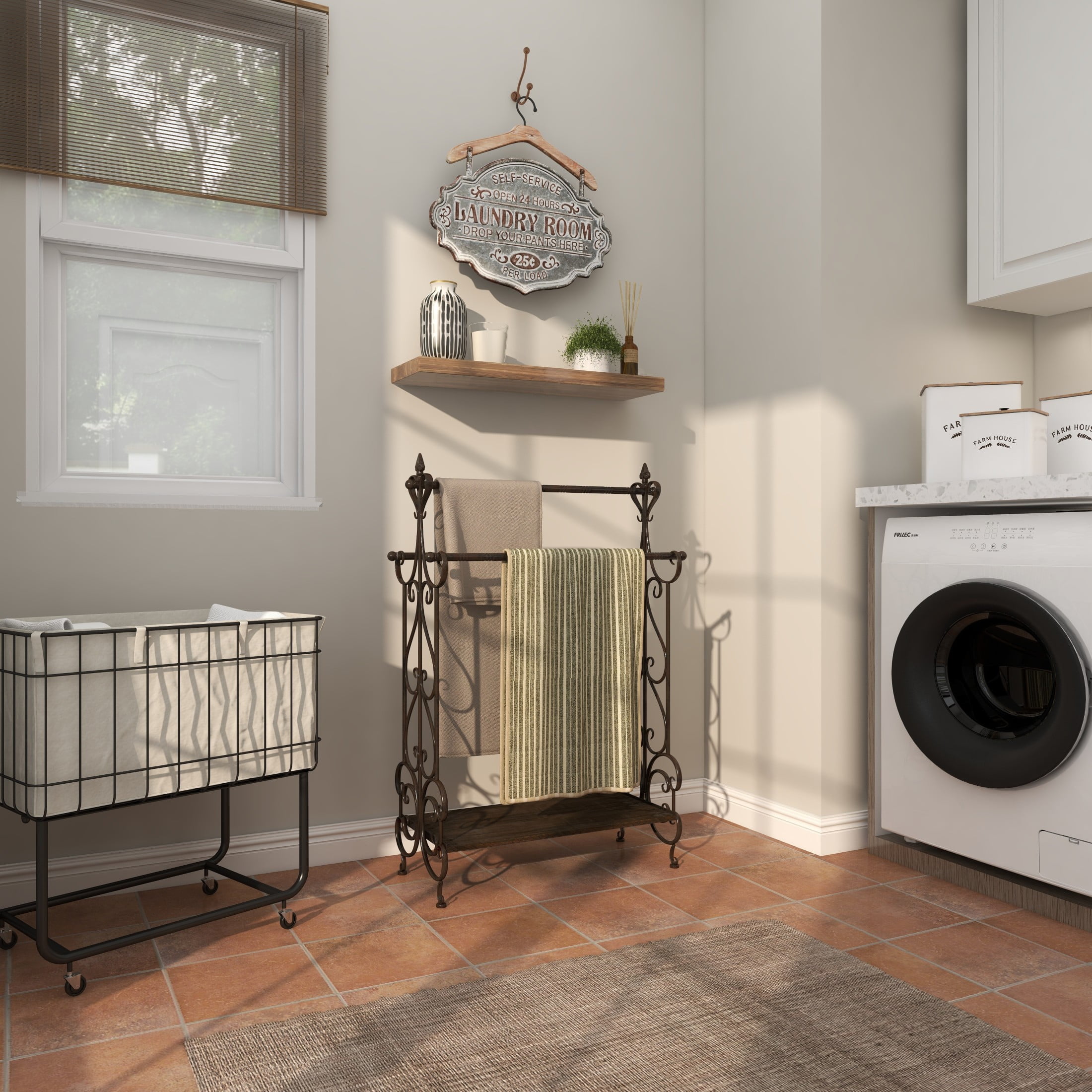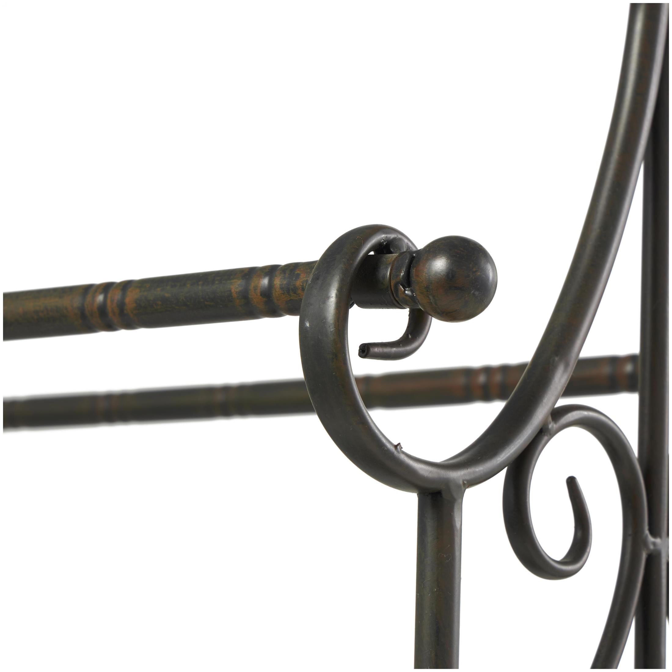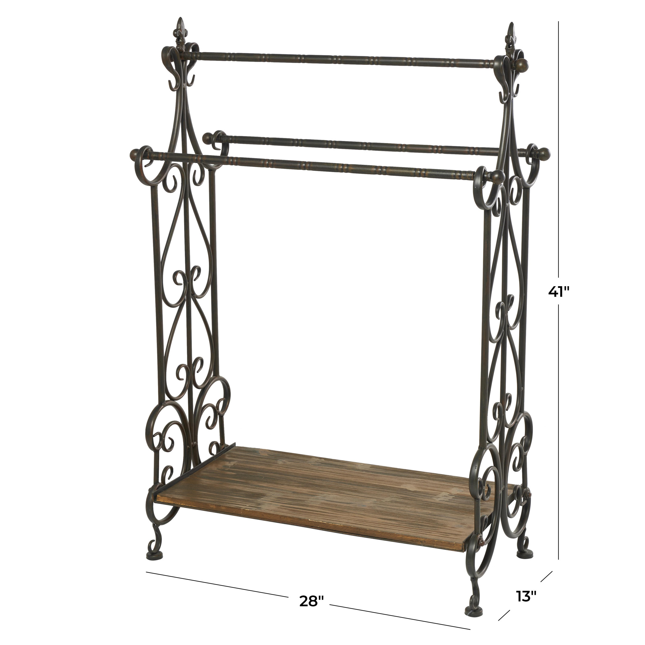Infuse your home with romantic nostalgia and timeless grace, where ornate and antique details create a sanctuary of charm and warmth in the home The black closet quilt rack is crafted from a blend of pine wood and metal materials, ensuring durability This rectangular decorative rack stand highlights a polished black metal frame with a natural brown wood bottom shelf The pine quilt rack features three convenient metal racks at varying heights for optimal display, with ornate scroll designs The black wood quilt rack measures 28L x 13W x 41H inches, and weighs 13.80 lbs The polished black quilt display rack accentuates fleur-de-lis and scroll side patterns with a rectangular bottom shelf Wipe clean with a dry cloth In this vintage quilt blanket rack, the carved wooden shelf and welded metal racks are attached to welded side panels extending to leg stands Vintage style DecMode Black Wood Scroll Quilt Rack makes a perfect addition to any home
