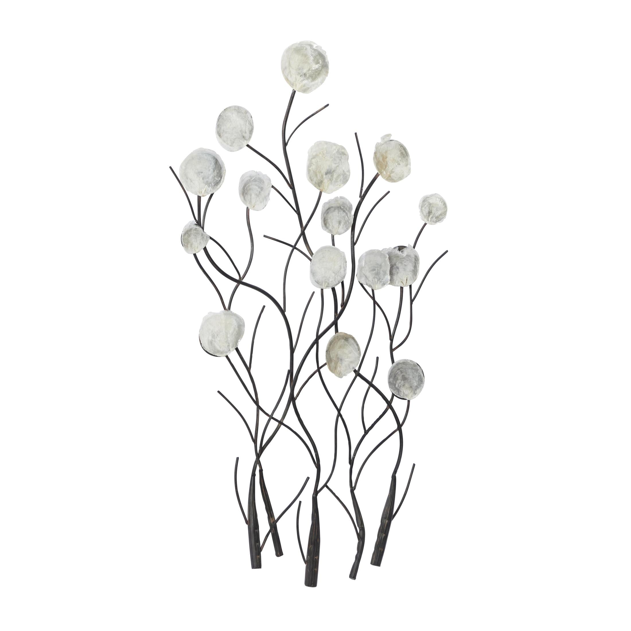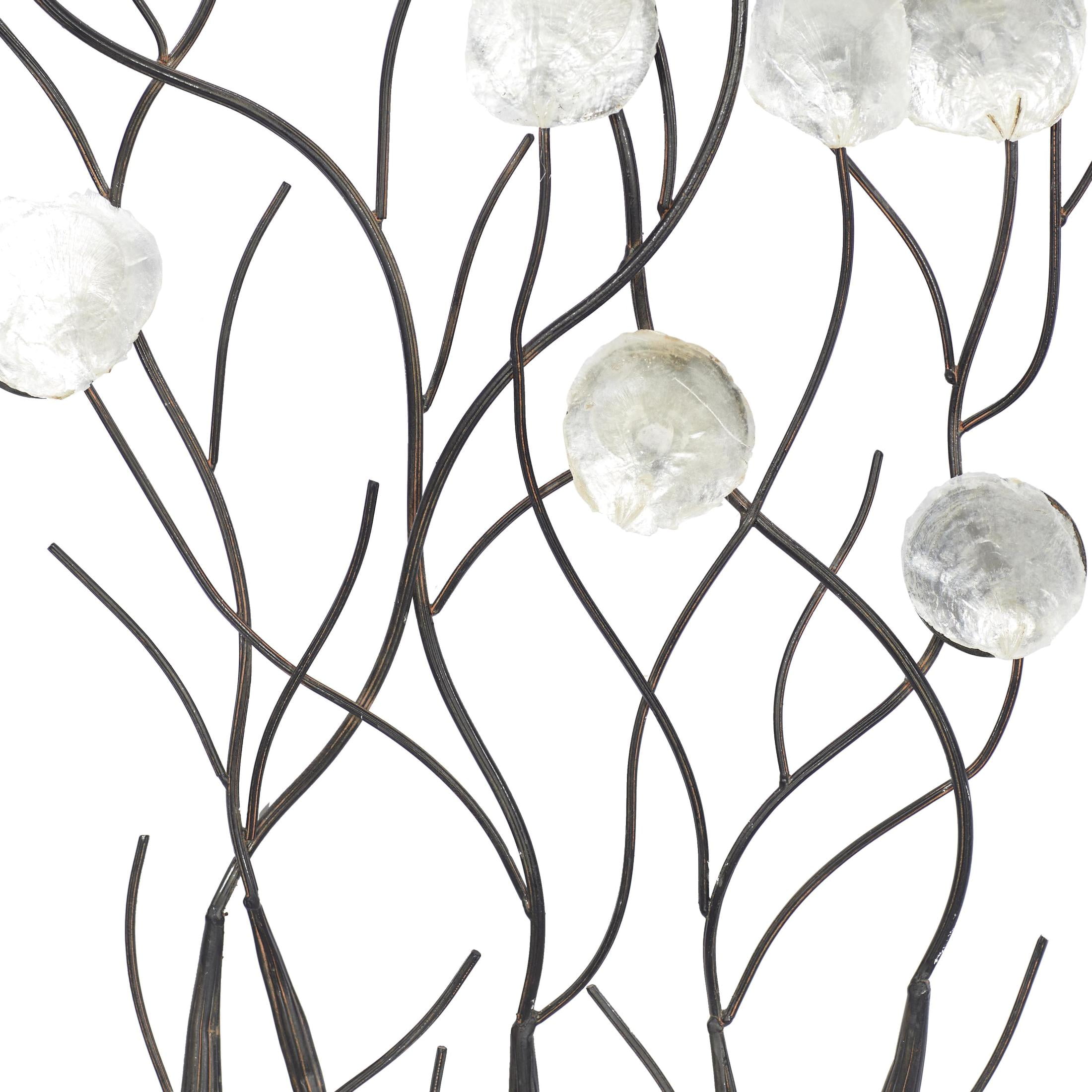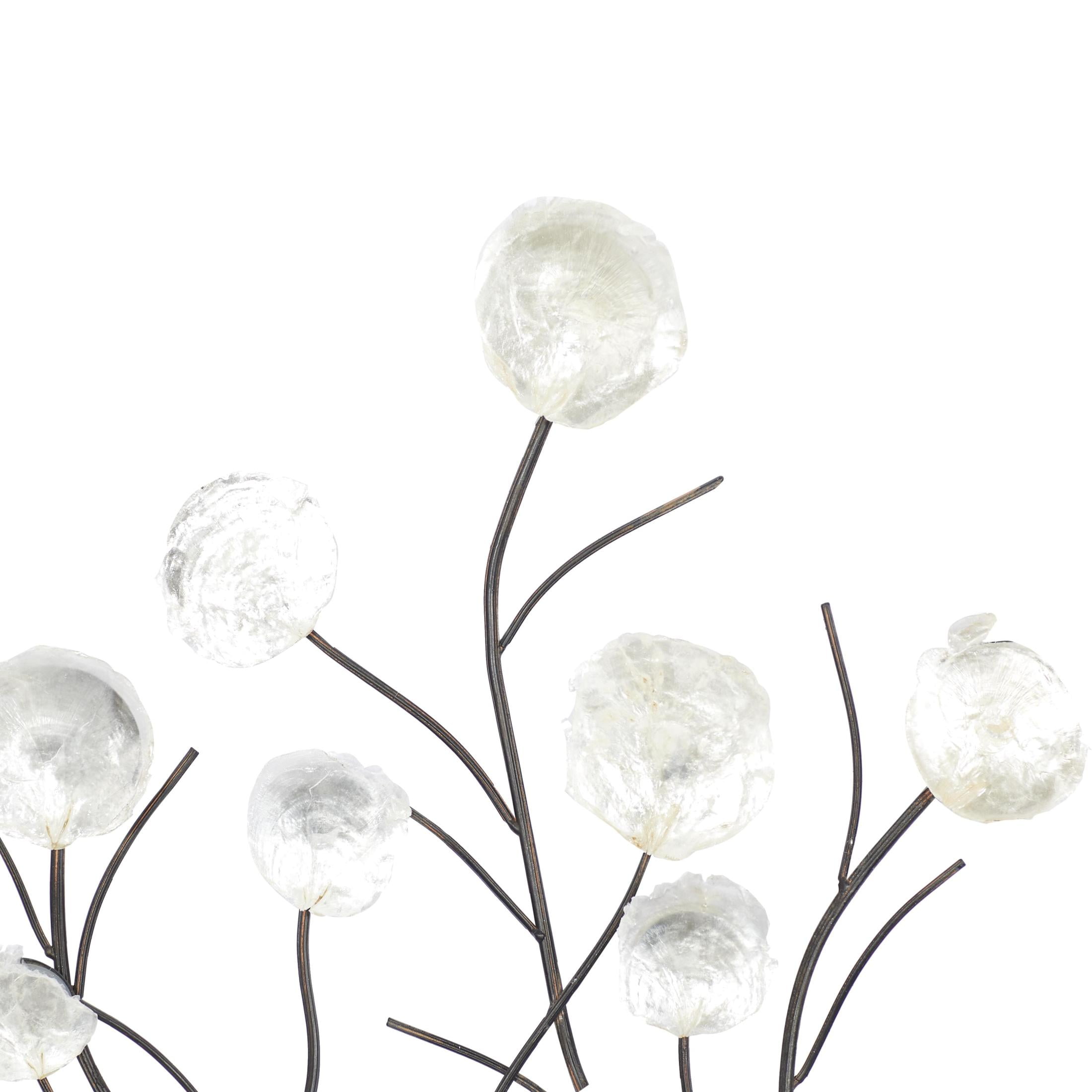 Inspired by blissful serenity and the allure of the sea, where soothing hues and natural textures bring effortless charm to the home Made from natural, opalescent white Capiz shells and iron, each piece of this white home wall decor is unique and distinct Cluster decor for walls showcases a polished pearl white finish on the flowers, complemented by charcoal black stems, exuding an elegant coastal charm This Capiz wall decor features a large metal tree with wavy branches adorned with one-of-a-kind Capiz shells The white capiz shell wall decor measures 24L x 1W x 36H inches, and weighs 5.68 lbs Polished white wall art for living room accentuates a flower bough shape, adding an element of sophistication to your living space Wipe clean with a dry cloth This coastal room wall decor is meticulously crafted with Capiz shells attached to a linear metal frame, reflecting an exquisite fusion of nature and artistry Coastal style DecMode White Capiz Shell Floral Wall Decor with Capiz Accents makes a perfect addition to any home
