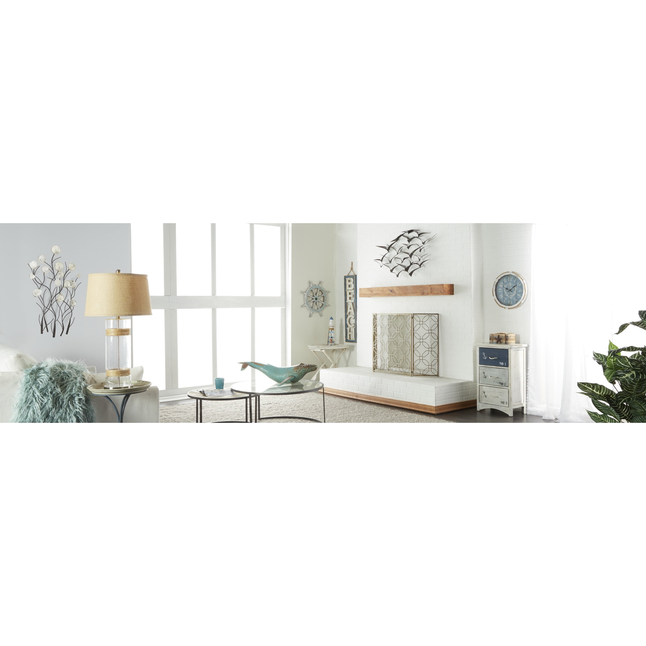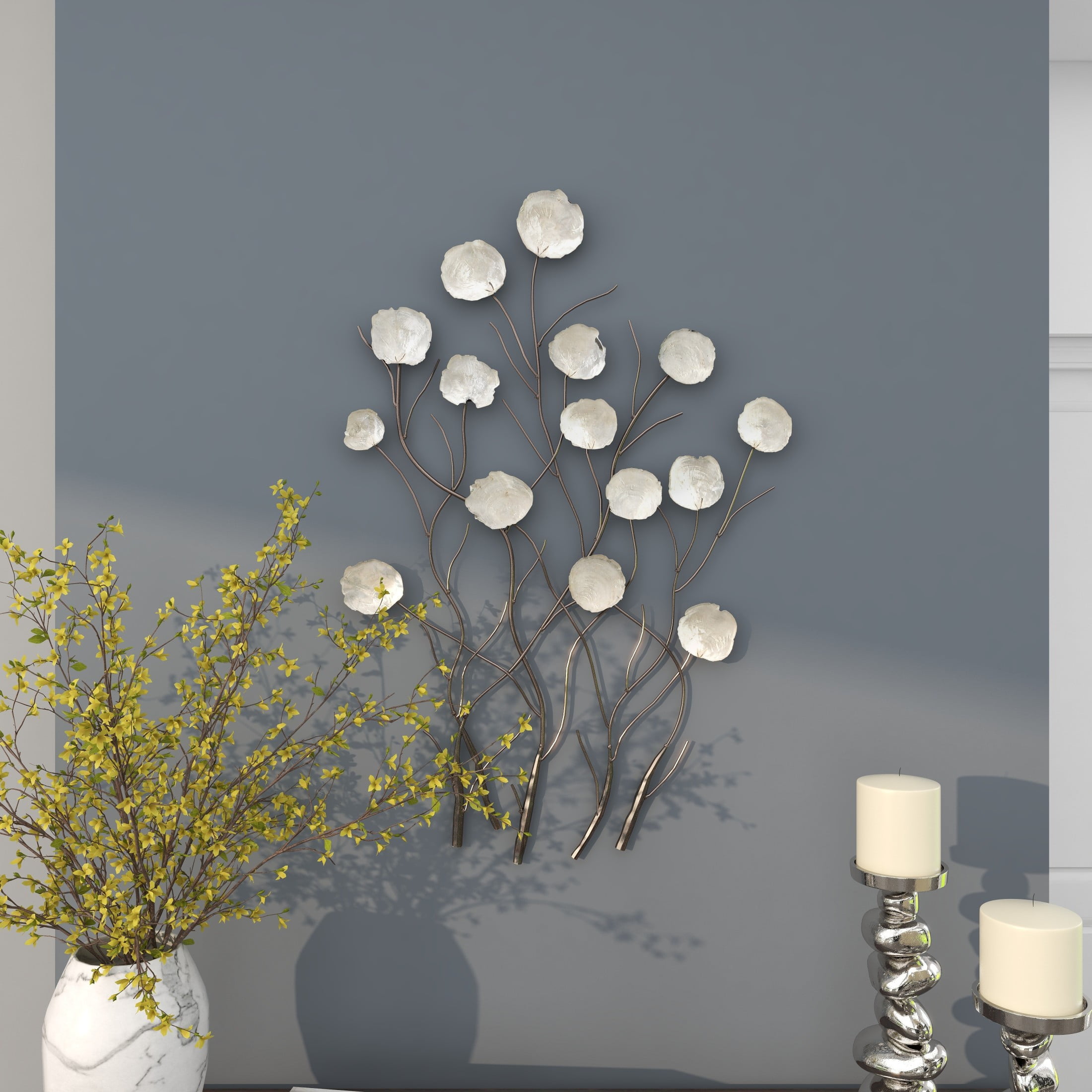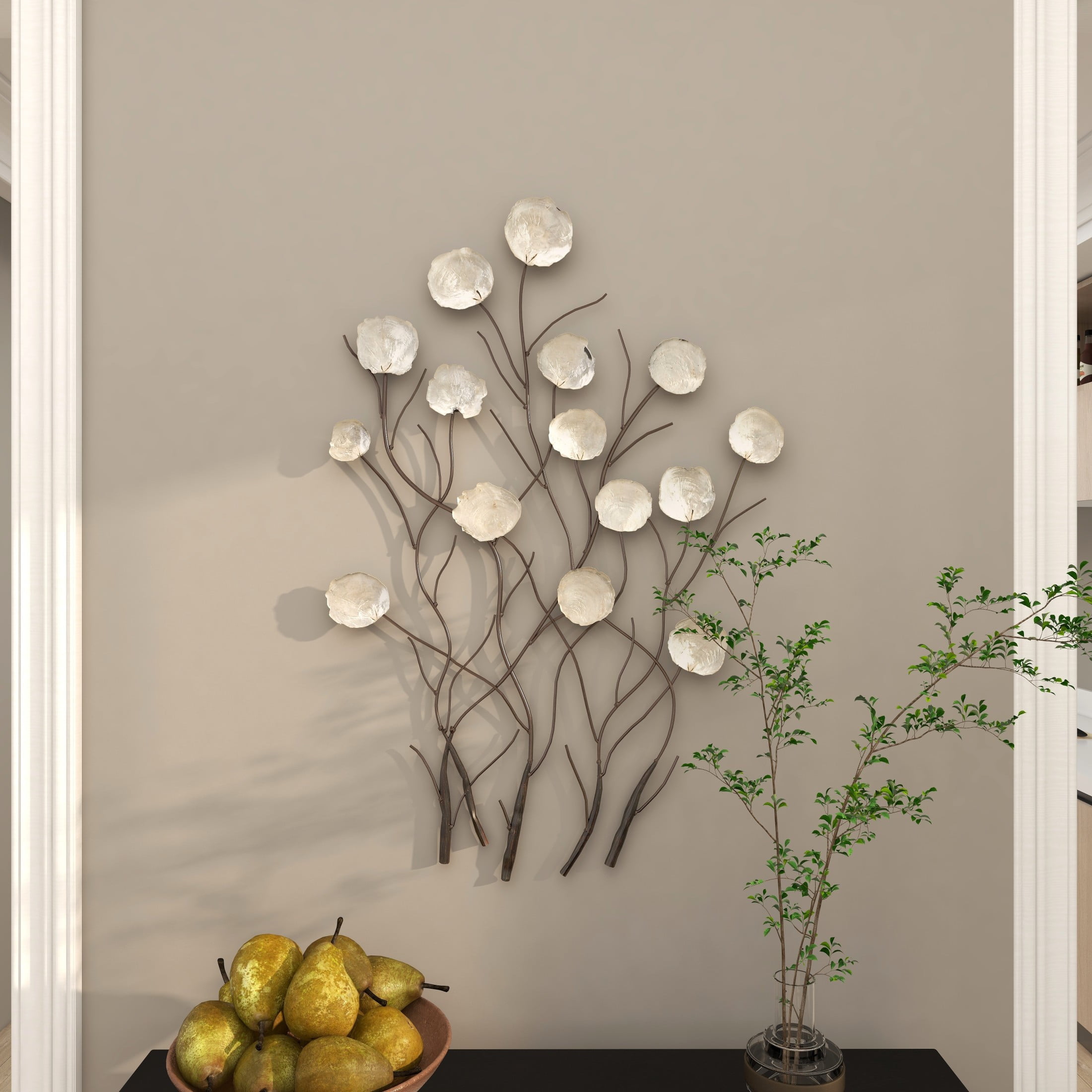Inspired by blissful serenity and the allure of the sea, where soothing hues and natural textures bring effortless charm to the home Made from natural, opalescent white Capiz shells and iron, each piece of this white home wall decor is unique and distinct Cluster decor for walls showcases a polished pearl white finish on the flowers, complemented by charcoal black stems, exuding an elegant coastal charm This Capiz wall decor features a large metal tree with wavy branches adorned with one-of-a-kind Capiz shells The white capiz shell wall decor measures 24L x 1W x 36H inches, and weighs 5.68 lbs Polished white wall art for living room accentuates a flower bough shape, adding an element of sophistication to your living space Wipe clean with a dry cloth This coastal room wall decor is meticulously crafted with Capiz shells attached to a linear metal frame, reflecting an exquisite fusion of nature and artistry Coastal style DecMode White Capiz Shell Floral Wall Decor with Capiz Accents makes a perfect addition to any home