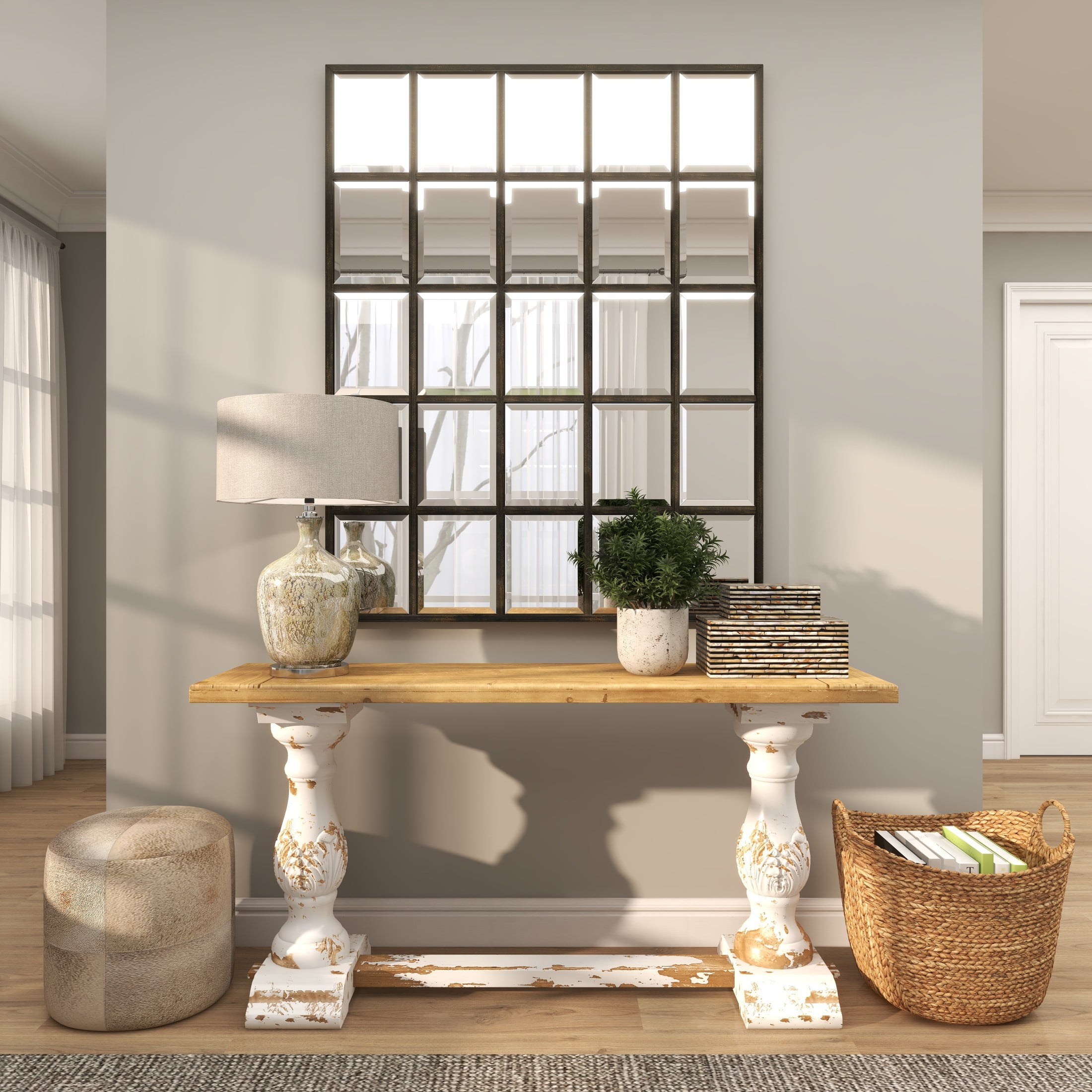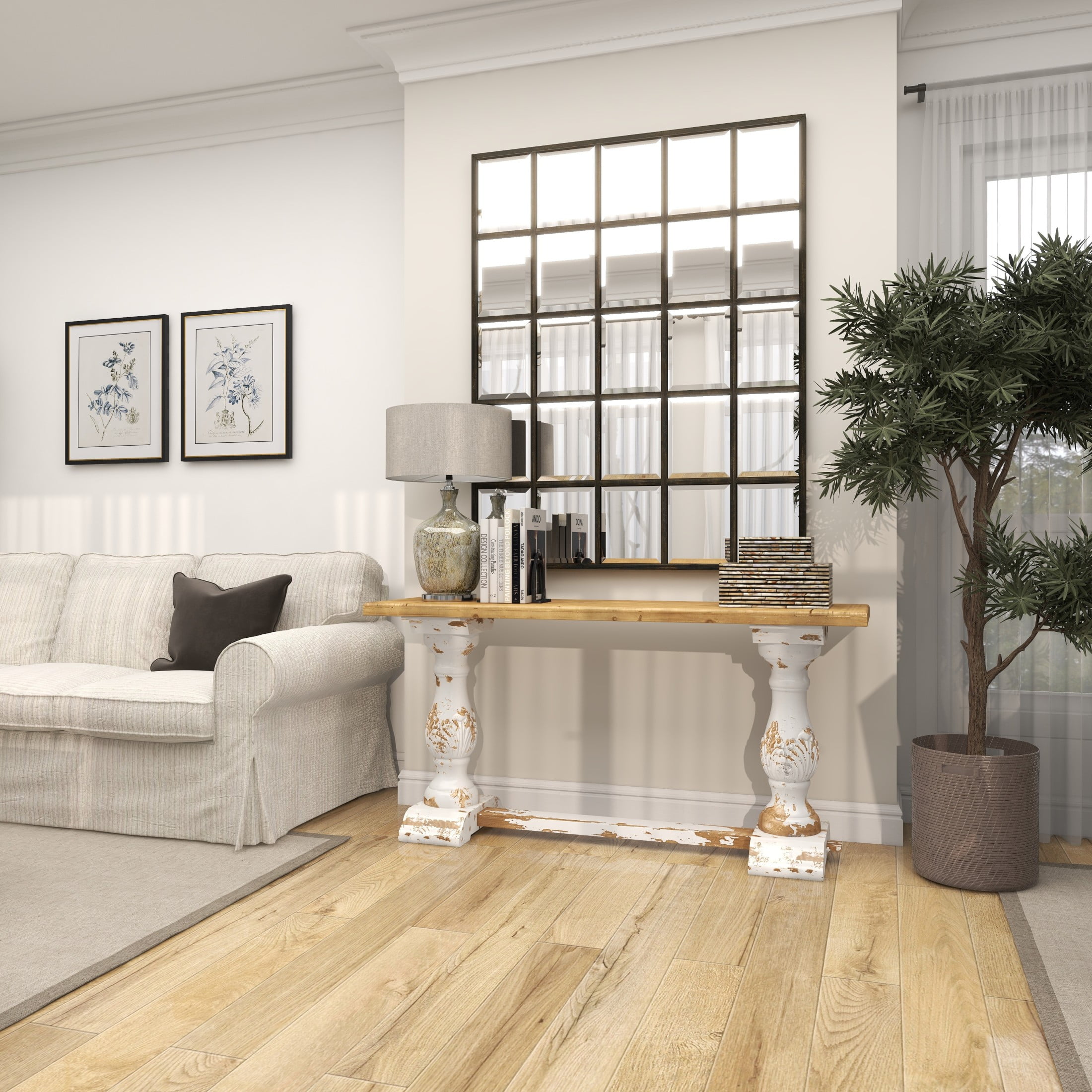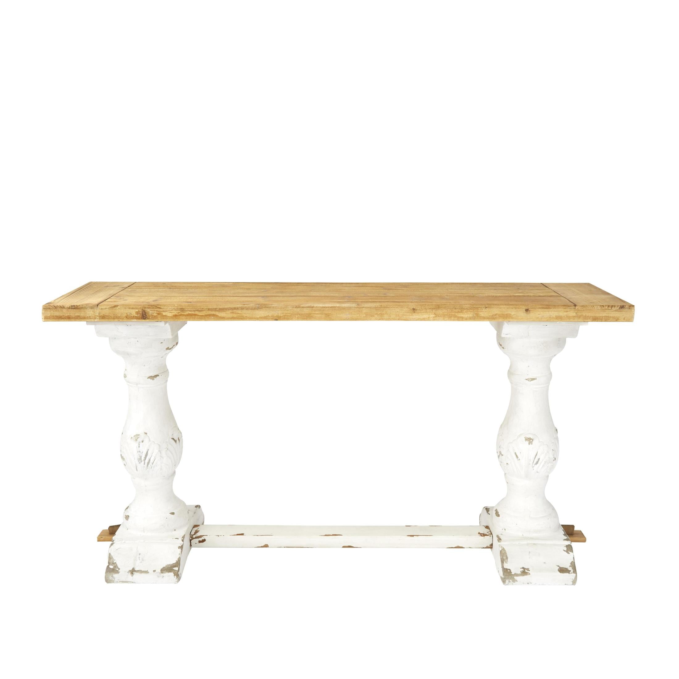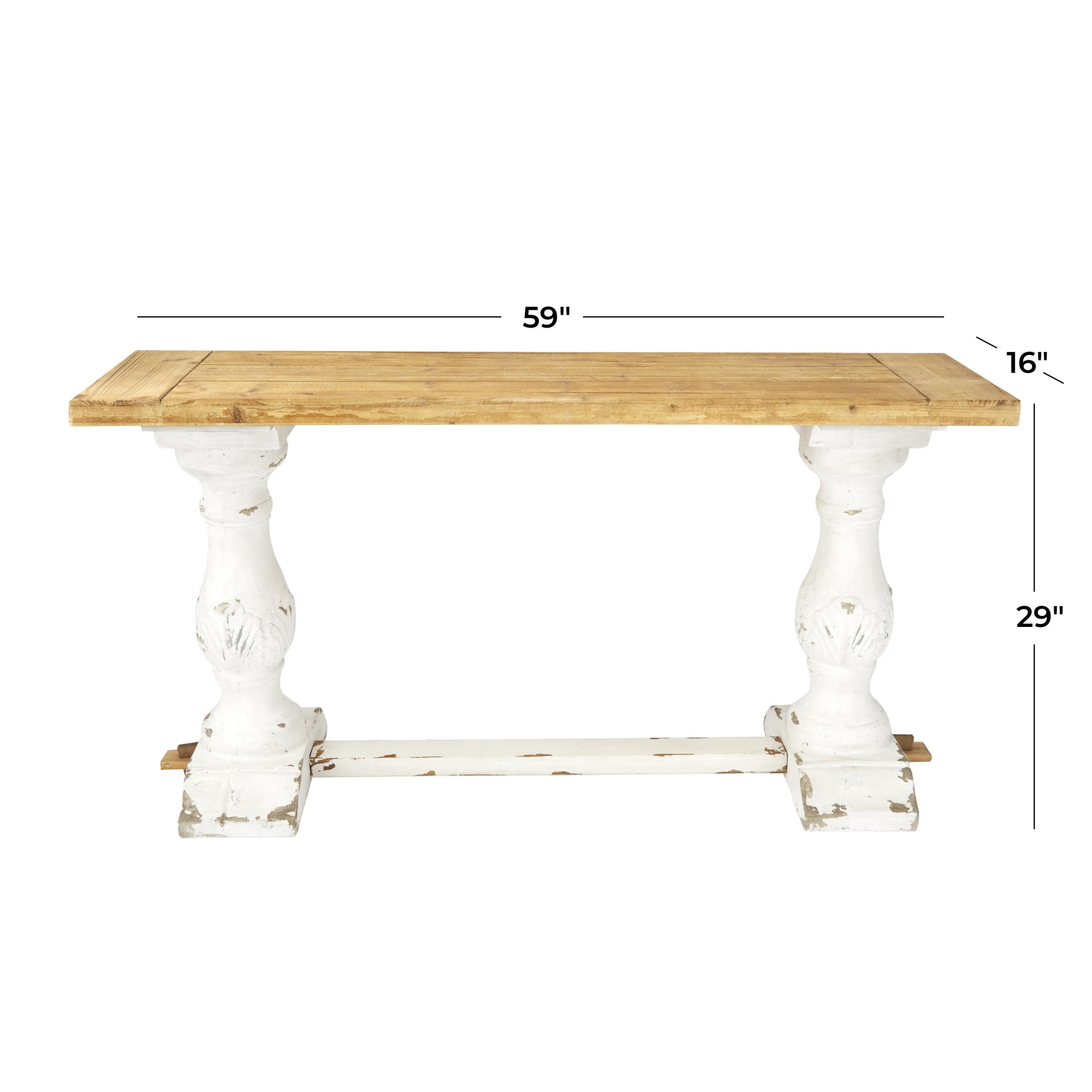 Designed with rugged beauty and an earthy charm, where natural simplicity, warmth, and organic materials create a wholesome atmosphere White living room console table boasts a reliable construction of fiberglass, fir wood and MDF, ensuring durability and style Rectangle living room furniture showcases a distressed white finish accented by brown tabletop for a timeless look This wood console table features a long rectangular top with a carved lip, supported by two turned columns and a horizontal slat base for added stability The white wood console table measures 59L x 16W x 29H inches, and weighs 45 lbs Distressed white home table boasts a classic rectangular shape and elegantly fluted legs, creating a striking and sophisticated design Wipe clean with a dry cloth This rustic home console table is meticulously crafted from carved wood, seamlessly glued together for a durable and timeless piece Rustic style DecMode 59″ x 29″ White Wood Distressed Console Table with Brown Wood Top, 1-Piece makes a perfect addition to any home