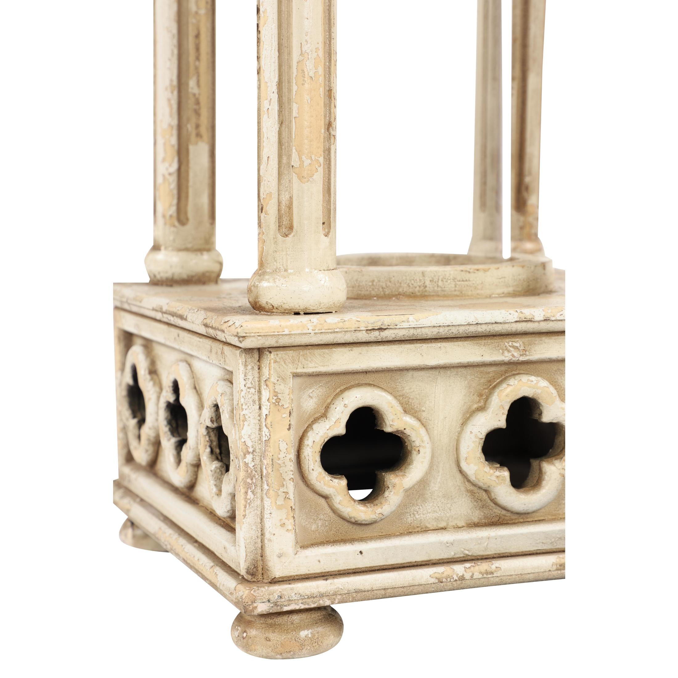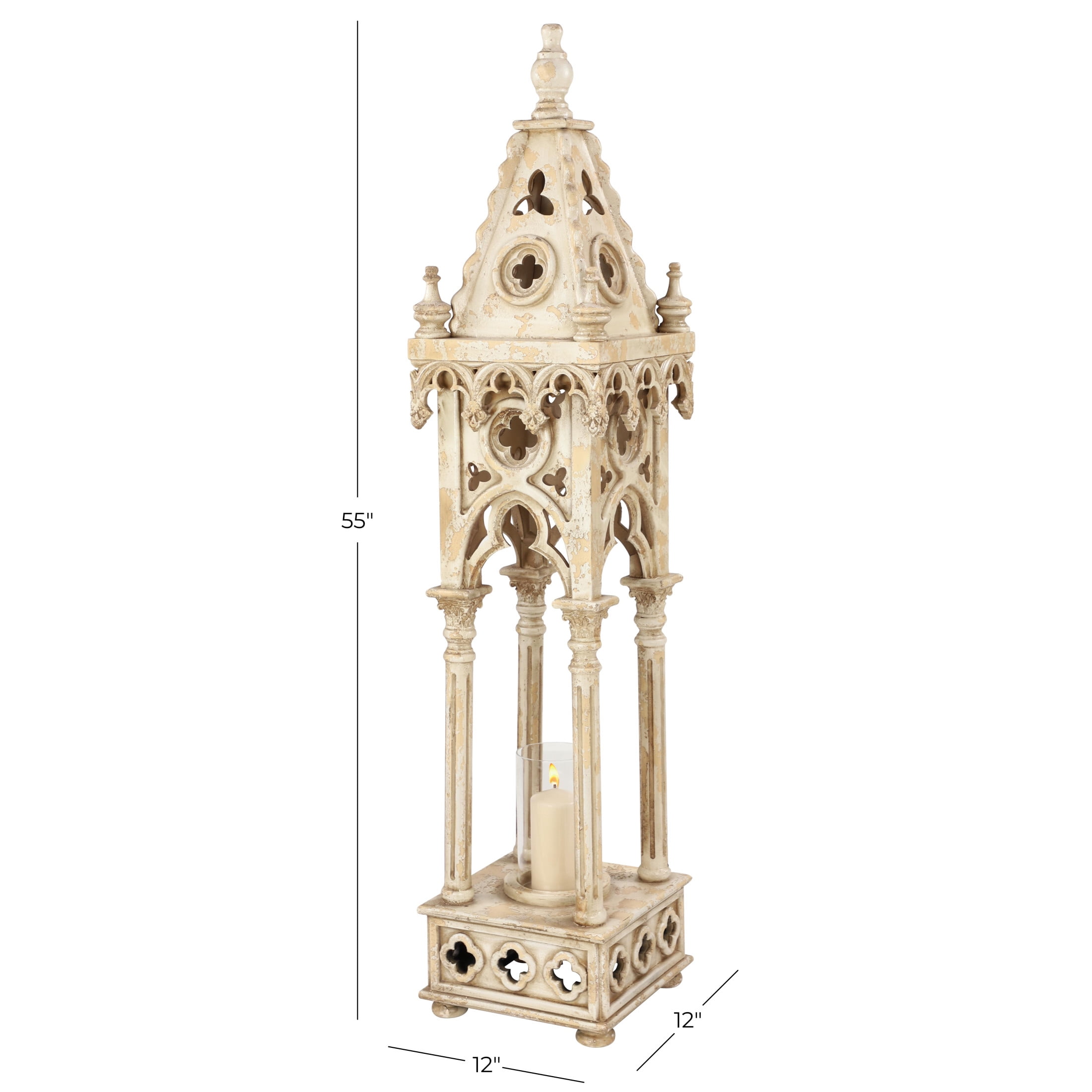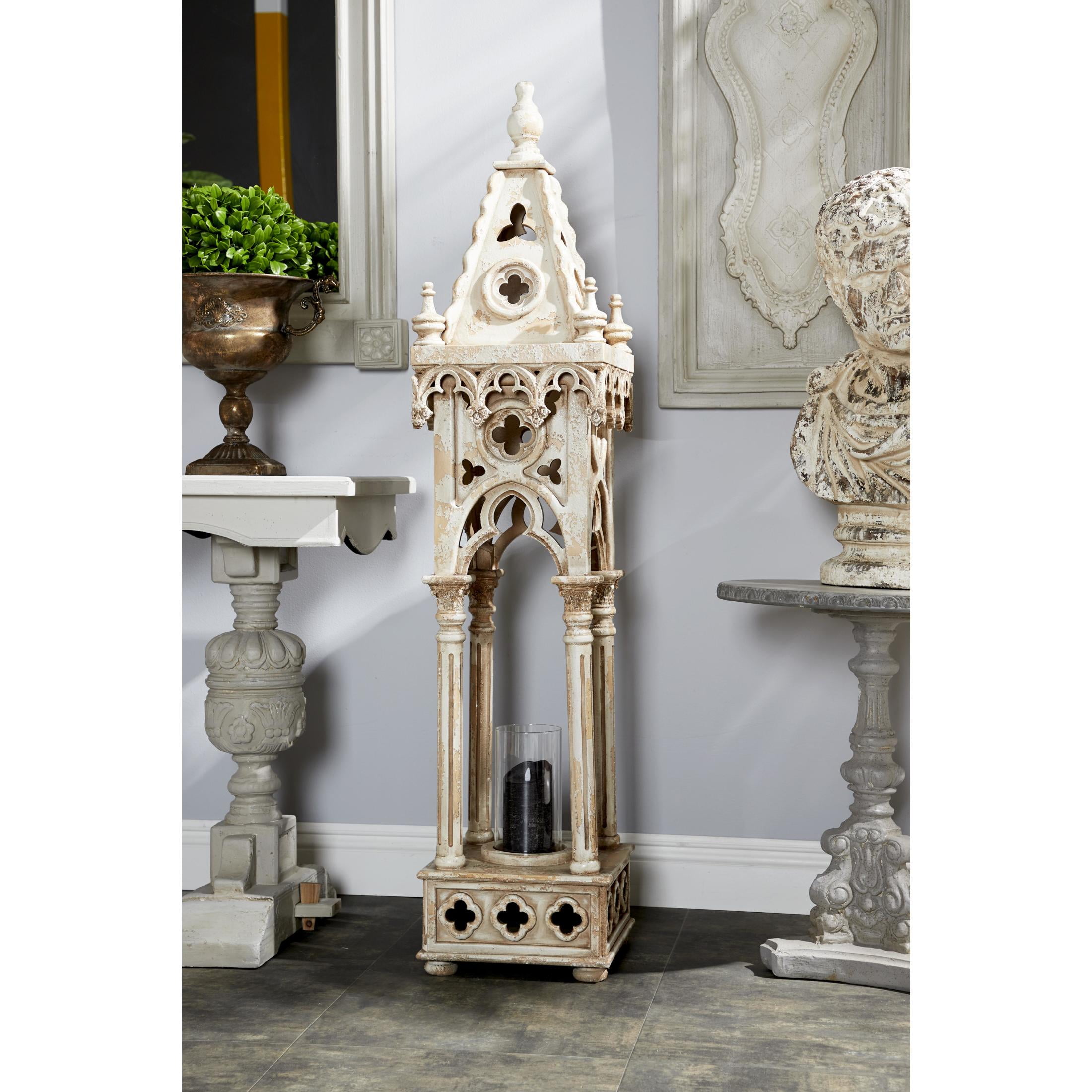 Infuse your home with romantic nostalgia and timeless grace, where ornate and antique details create a sanctuary of charm and warmth in the home The white indoor outdoor candle lantern is crafted from iron, fir wood, MDF, and glass material to ensure durability and elegance This square decorative candle lantern has a distressed white finish with subtle hints of beige and brown for a vintage look This wood candle lantern features intricate cutout designs that mimic cathedral architecture, adding an elegant touch The white wood candle lantern measures 12L x 12W x 55H inches, and weighs 22 lbs The distressed white lantern candle holder decor showcases ornate patterns and four leaf clover-like cutouts on its square frame with pillar details Wipe clean with a dry cloth The vintage candle holder lantern is constructed from meticulously cut and shaped MDF, adorned with a precisely cut-glass candle holder Vintage style DecMode White Wood Standing Decorative Candle Lantern makes a perfect addition to any home