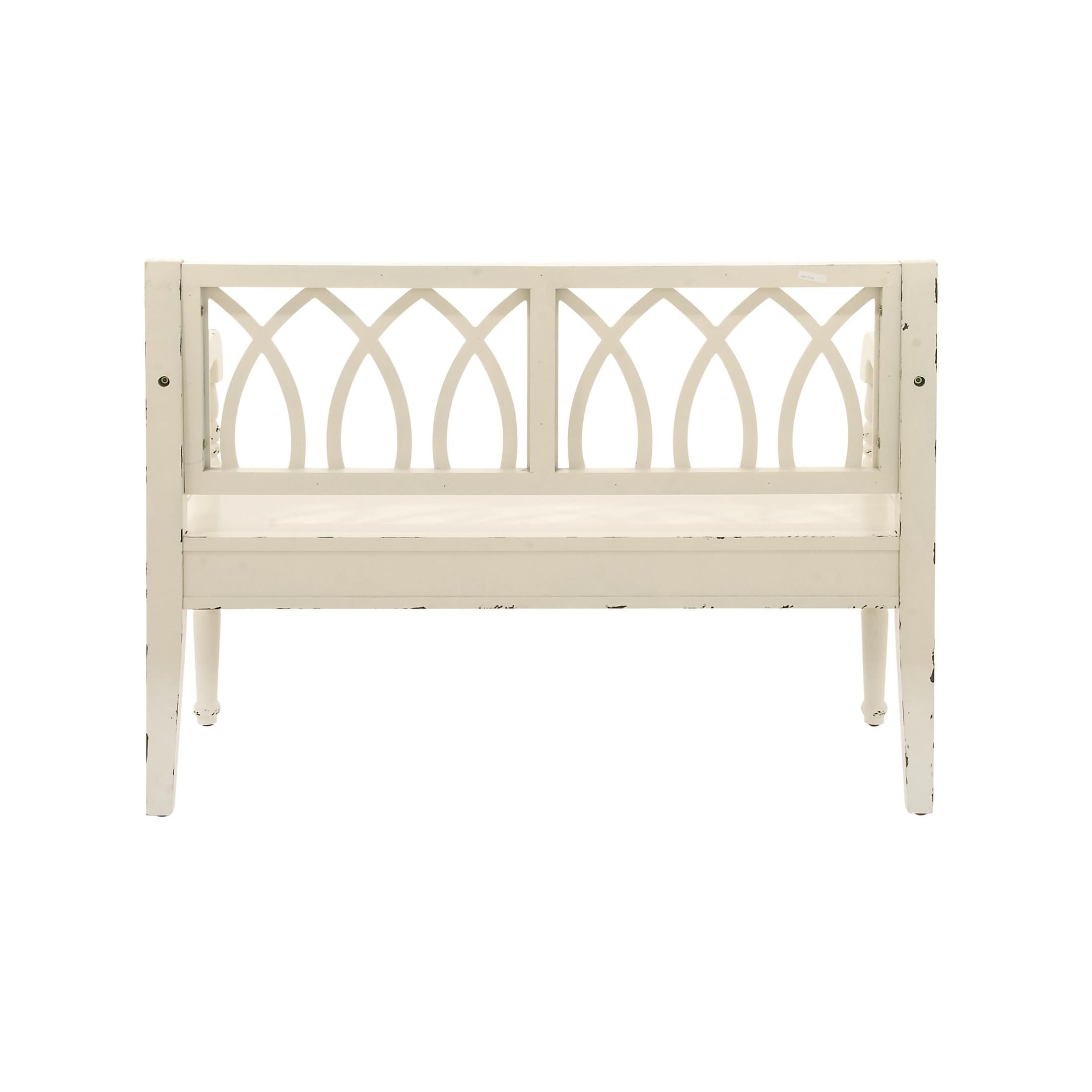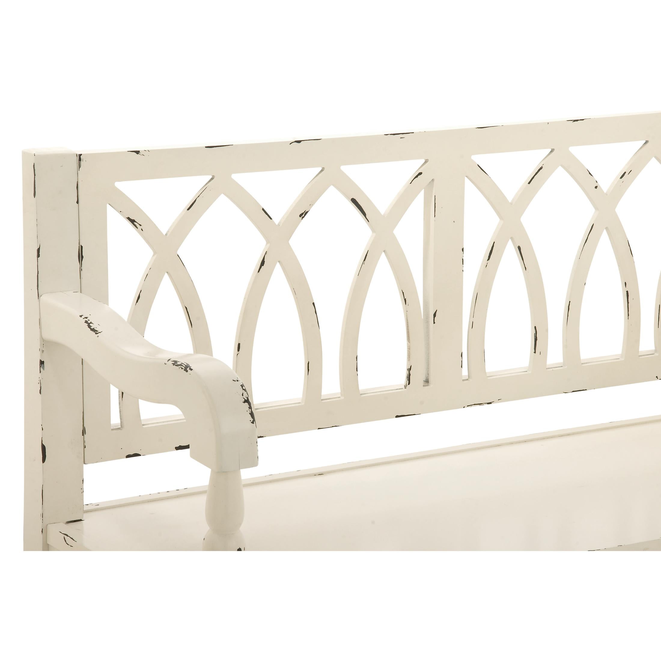 Infuse your home with cozy charm, where weathered textures, rustic finishes, and warm earthy tones create a wholesome atmosphere This white home bench features an appealing traditional design made of long-lasting fir wood and MDF Rectangle entryway room bench has a distressed white finish with black details adding personality to your space This wood bench flaunts an arched back design and turned legs for added elegance The white wood bench measures 48L x 19W x 36H inches, and weighs 51.90 lbs Distressed white entry bench provides a rectangular seat with an open-designed backrest that features teardrop patterns Wipe clean with a dry cloth This farmhouse bench for entryway is carved with fir wood making it durable and sturdy Farmhouse style DecMode Wood Bench with Arched Design Back and Turned Legs, White makes a perfect addition to any home