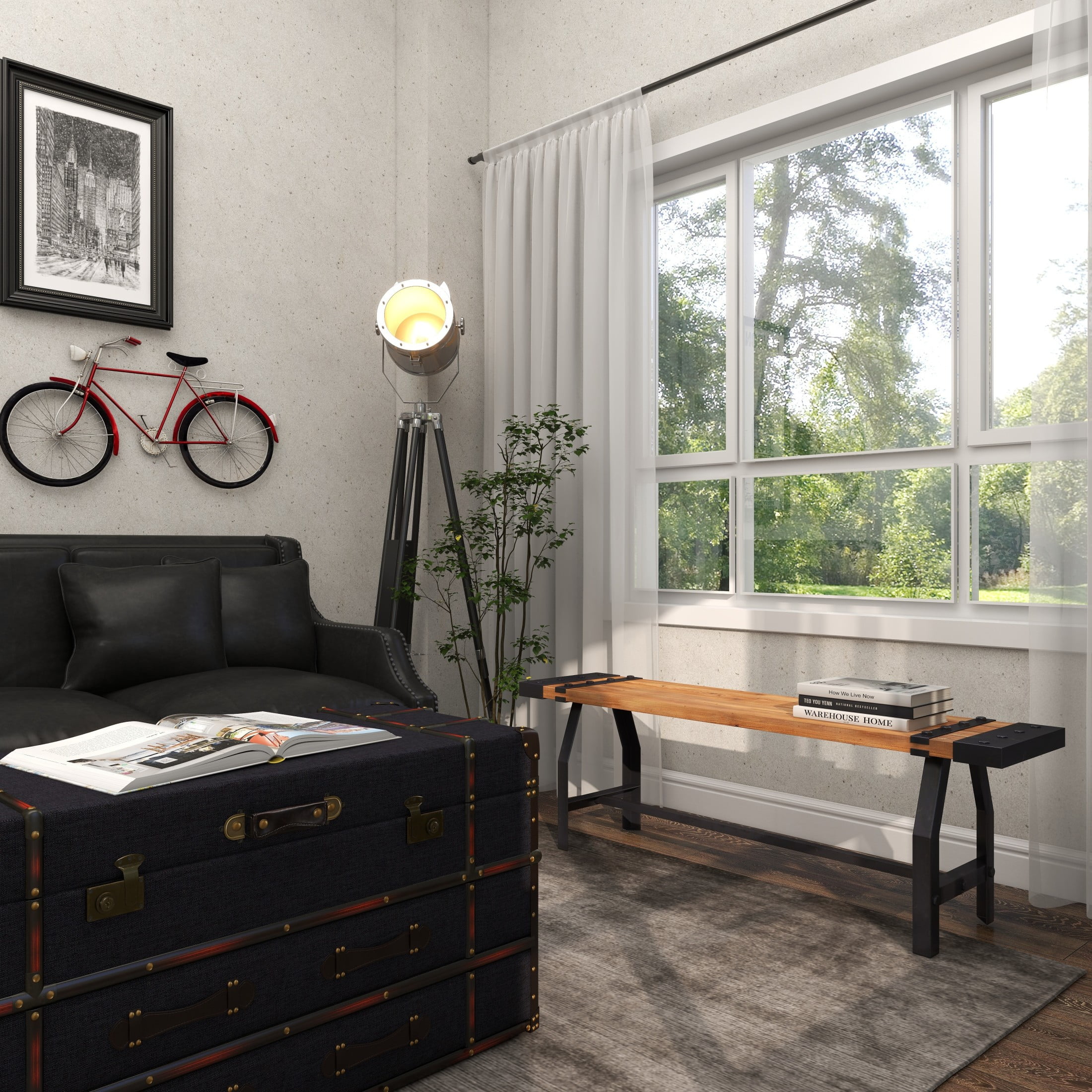 Designed with rugged charm and edgy allure, where metal finishes and raw materials unite to create an urban aesthetic that showcases your artistic expression This brown home bench is made with an MDF seat and an iron frame and legs Rectangle entryway room bench highlights a natural wood brown varnished finish with an obsidian black metal frame This wood bench showcases a raw, slatted wood and metal design with visible bolts at each end, supported by a trestle base for a unique display The brown wood bench measures 55L x 13W x 18H inches, and weighs 29.32 lbs Varnished brown entry bench accentuates a rectangular shape with a trestle-inspired base Wipe clean with a dry cloth This industrial bench for entryway is carved by wood with a metal frame and rivets attached all supported by sturdy metal leg stands Industrial style DecMode Wood Slatted Bench with Black Metal Base and Studs, Brown makes a perfect addition to any home