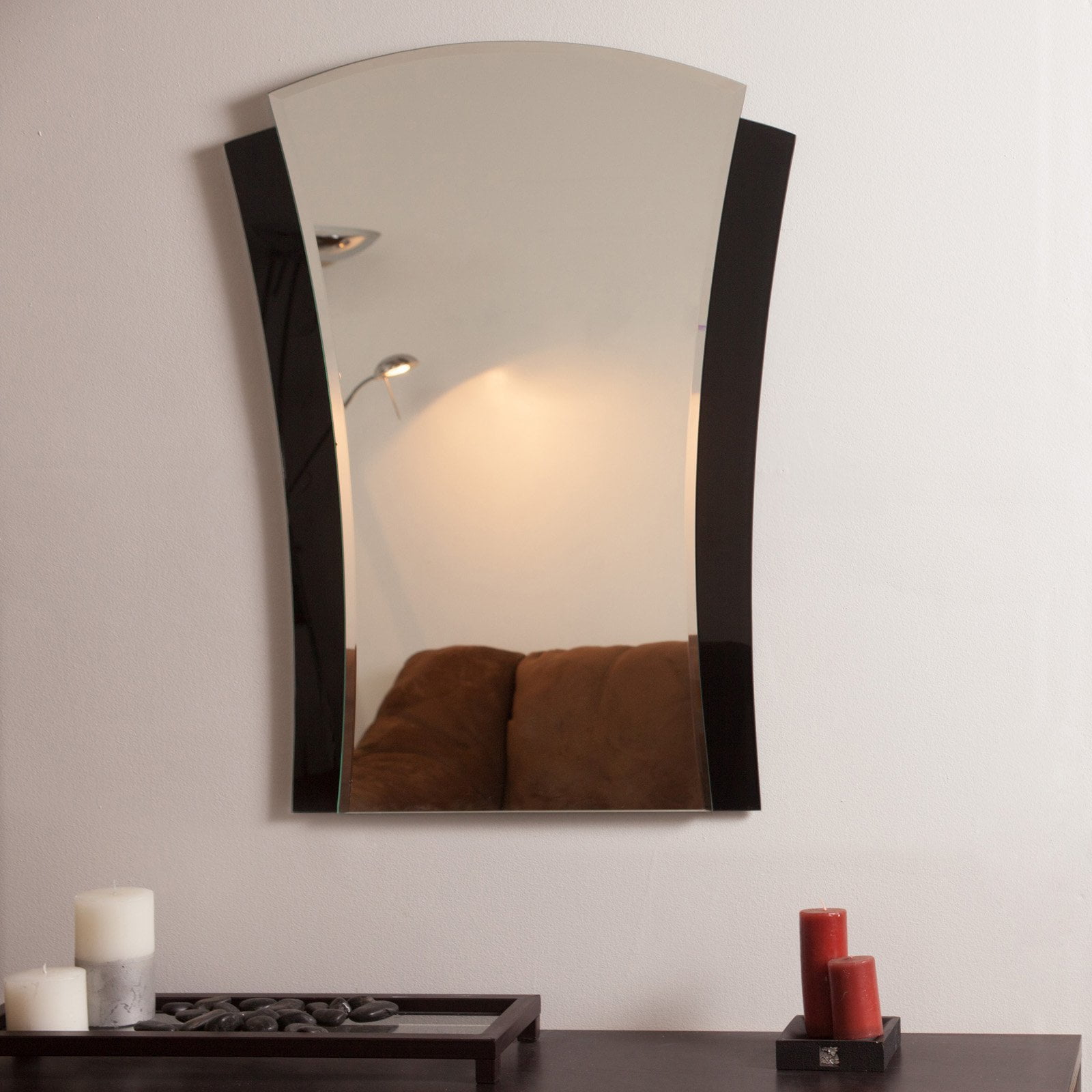 This mirror is made using real silver, not aluminum. Silver mirrors last longer and provide a warmer reflection. Distortion free. We use high quality glass so you wont get that funhouse effect that is common in inferrior cheap mirrors The invisible mounting hardware is designed to keep your mirror secure and keeps the hardware out of sight Mounting hardware included, comes ready to hang. Hangs vertically only. Crafted from 2 layers of thick, strong 3/16 float glass Top mirror measures approximately 19.5″ across at the top. The bottom of the top mirror measures 15.75″ wide, and measures 31.5″ high with a bevel of .4″. The bottom smoke colored mirror measures approximately 23.6″ at the widest point on top and 19.7″ at the widest point on the bottom. The back smoke colored mirror also measures about 29.3″ in height from top to bottom. Great for Bathroom mirror, Vanity mirror, Living Room mirror or Bedroom mirror