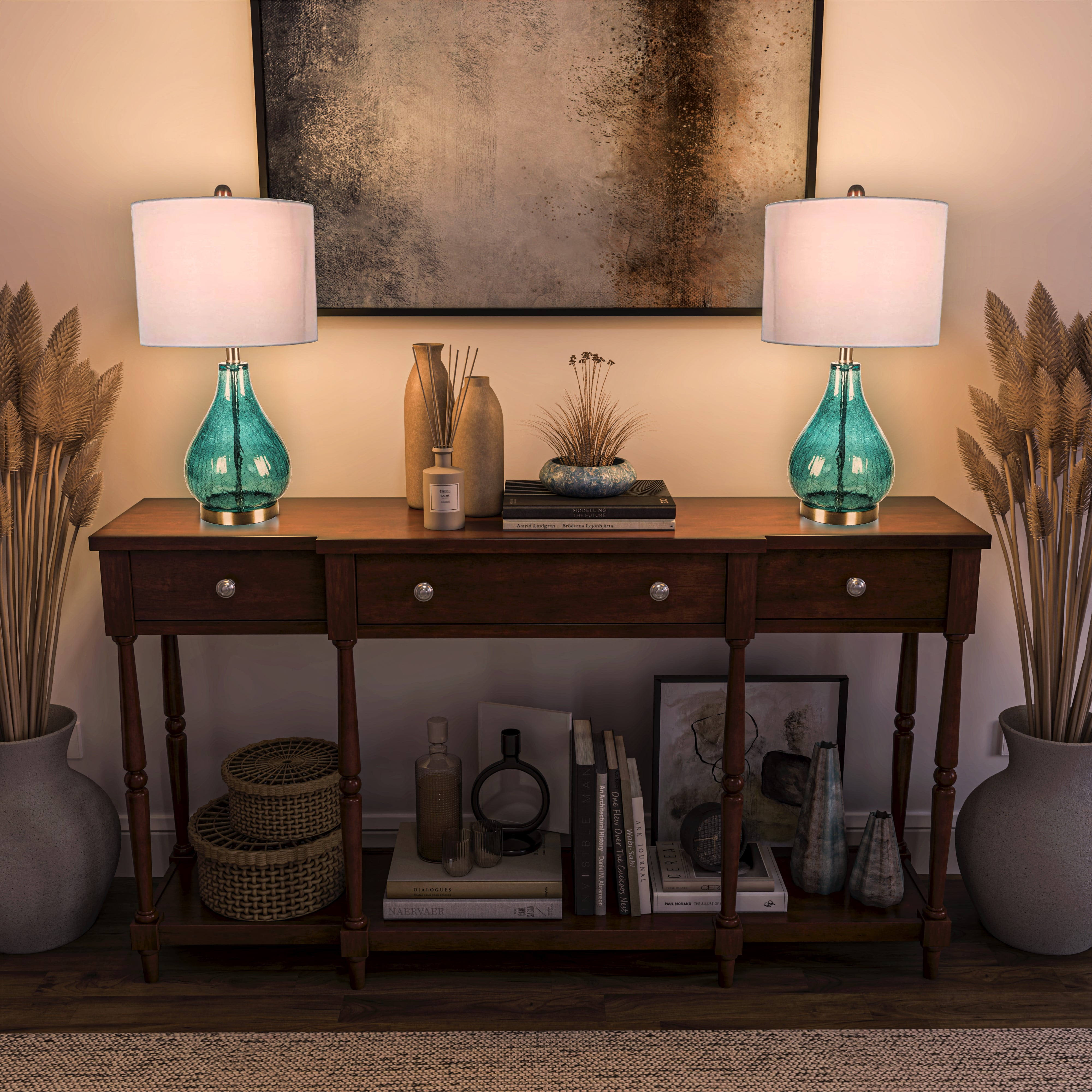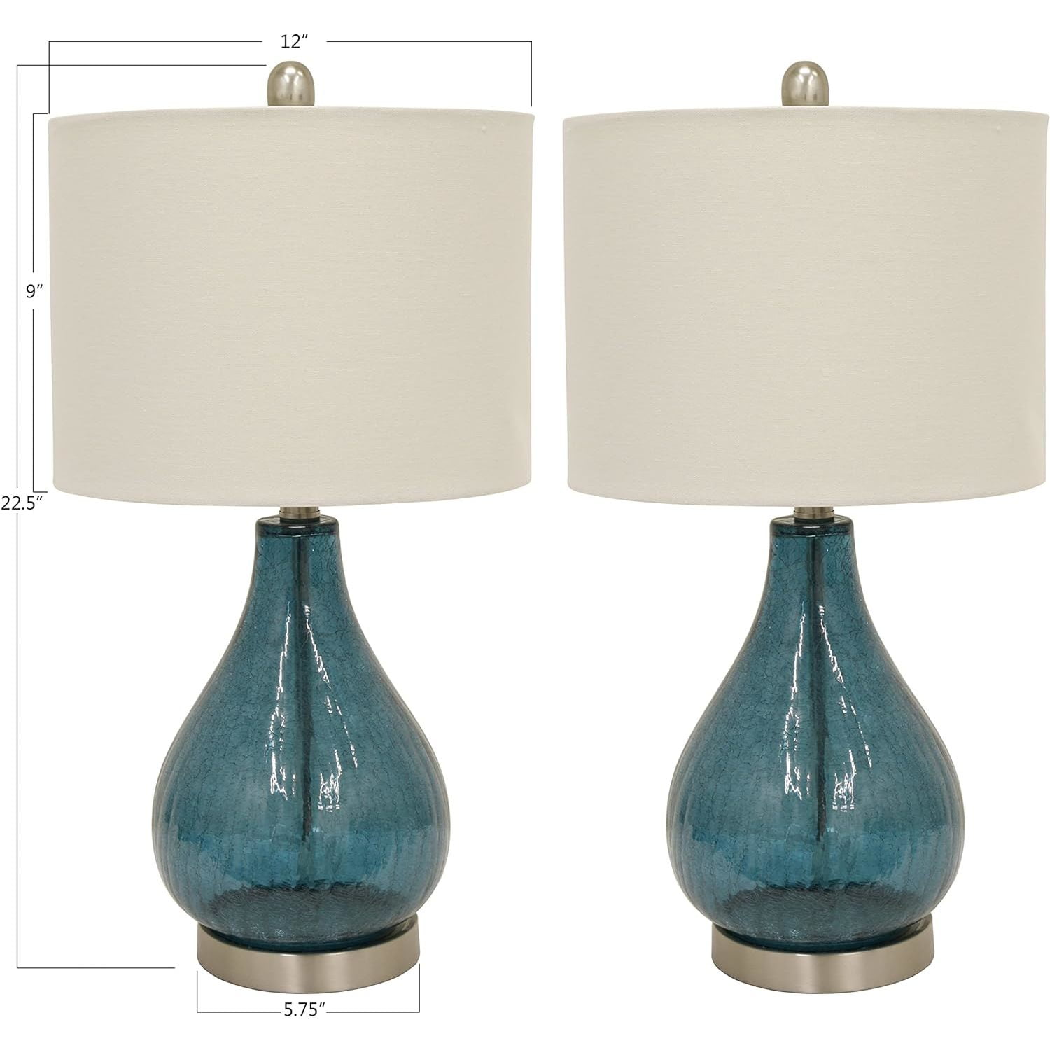 Mesmerizing Design: Set of 2 table lamps featuring exquisite emerald crackle glass bases with a blue-green finish, adding a touch of elegance and charm to any room. Durable Construction: Crafted with a combination of glass and steel, these lamps boast durability and style, ensuring longevity in your home decor. Warm Glow: White-colored shades complement the vibrant bases, emitting a warm and inviting glow that enhances the ambiance of your living room or bedroom. Versatile Size: With dimensions of 12″D x 12″W x 22.5″H, these table lamps are the perfect size for bedside tables, accent tables, or desks, offering flexibility in placement throughout your home. Timeless Beauty: Experience the perfect blend of style and functionality with the Decor Therapy Emerald Crackle Glass Table Lamps, adding a timeless and sophisticated touch to your home lighting.