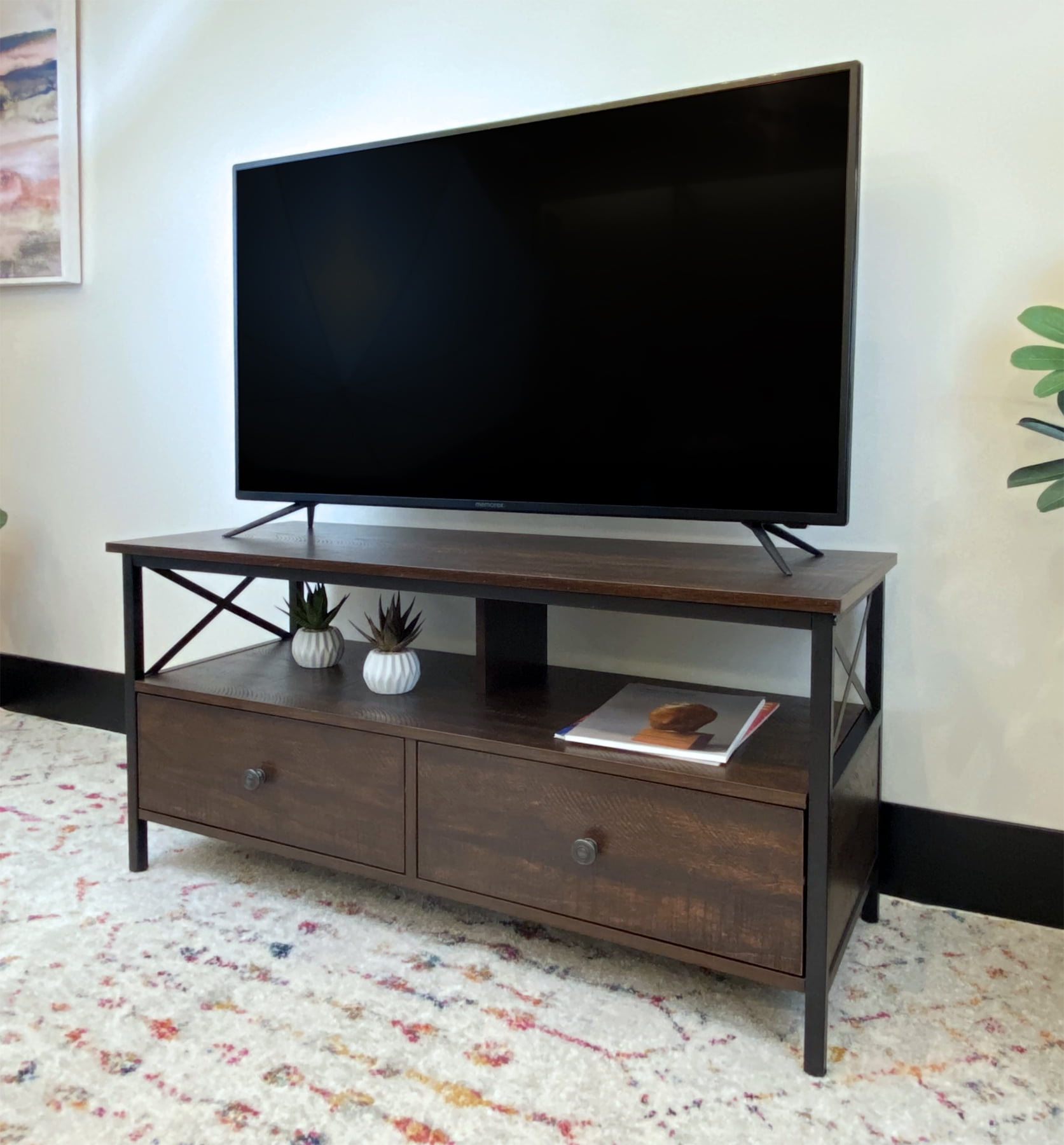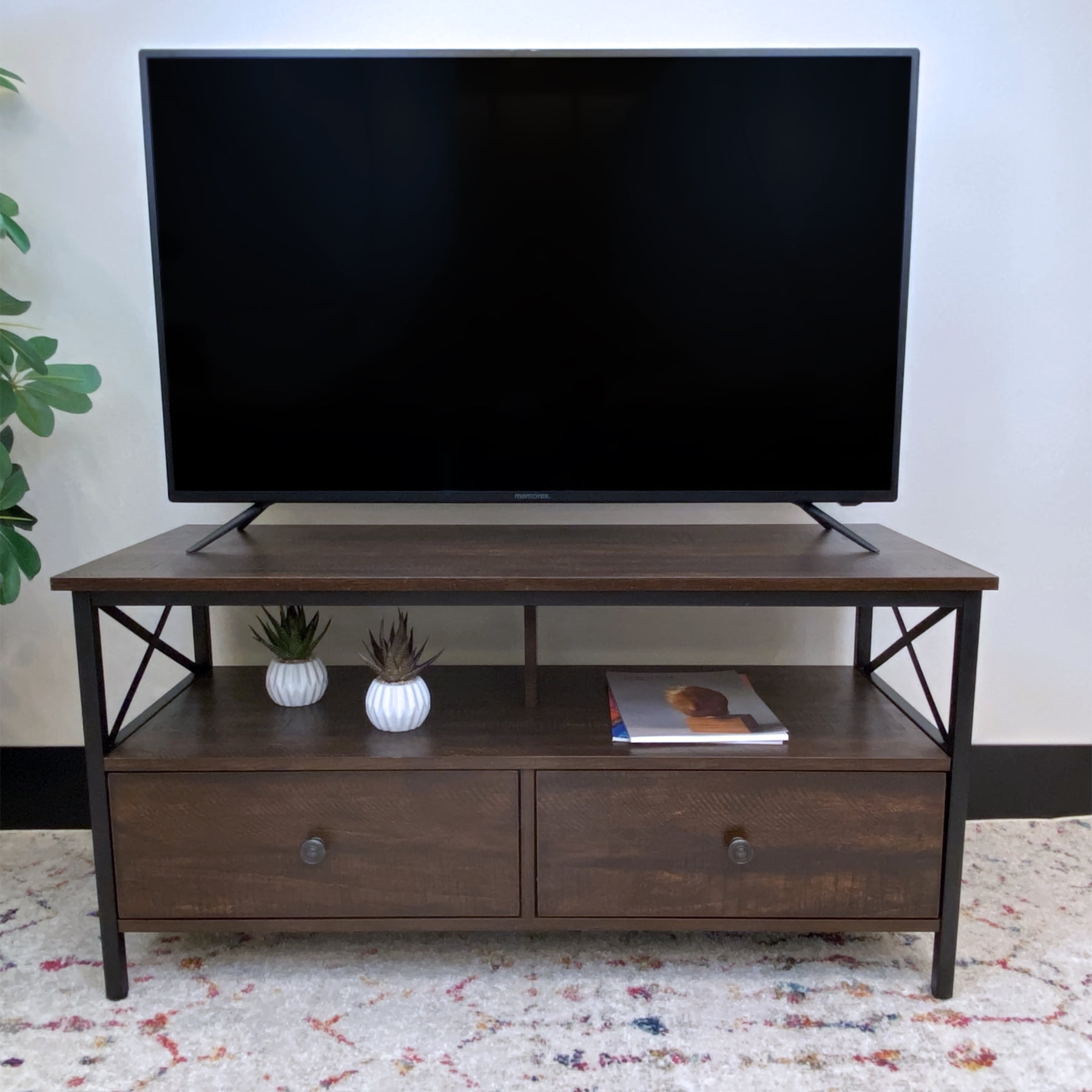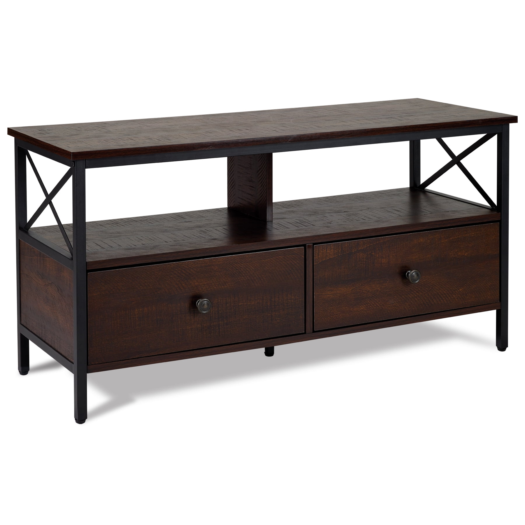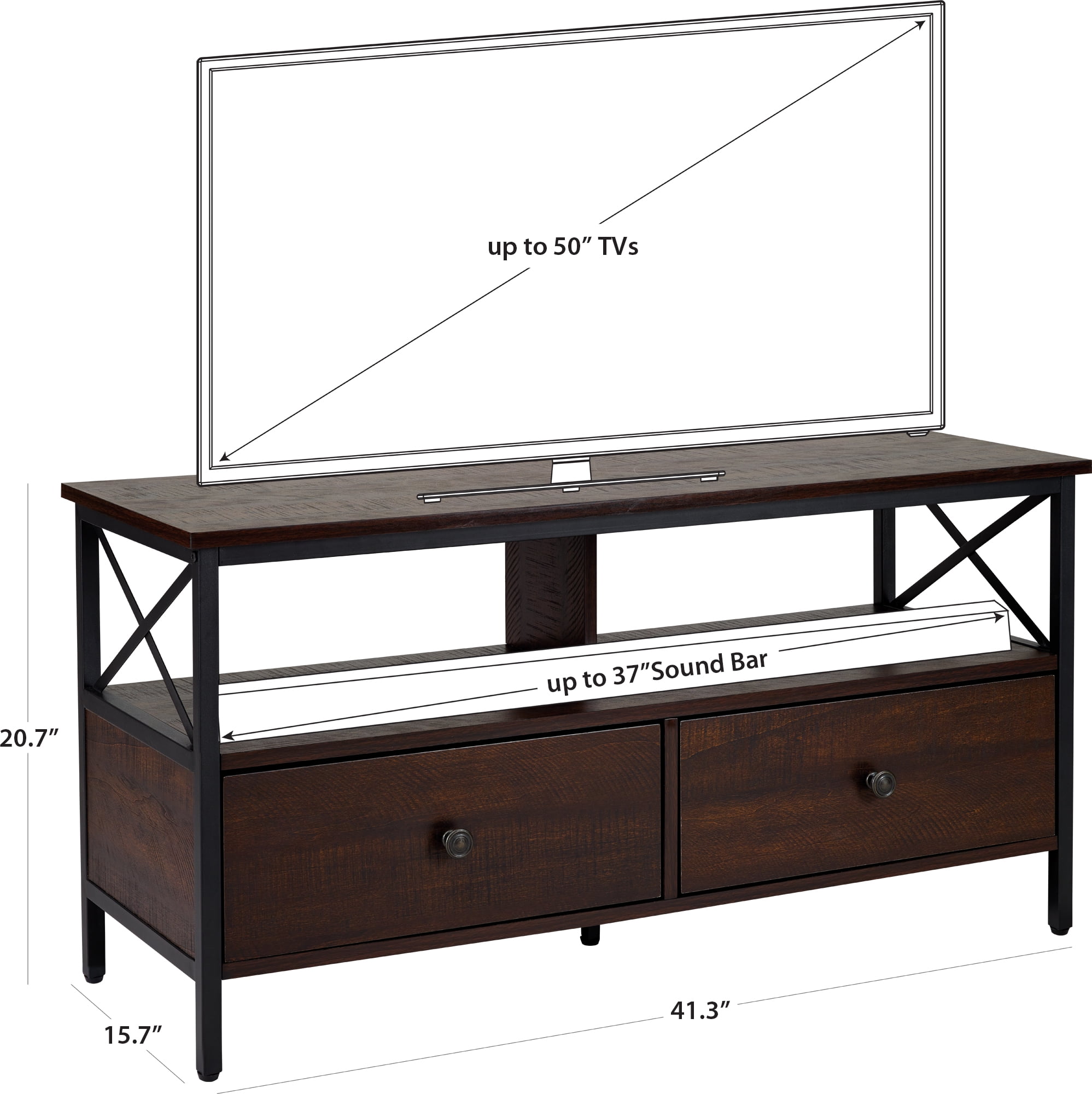 Dimensions: 41.3″ W x 15.7″ D x 20.7″ H inches Sleek walnut finish Black metal frame and hardware Industrial design style Wood and metal construction 2 Storage drawers Assembly required, hardware and instructions included For TVs up to 50″ Maximum weight limit: Top Shelf-132 lbs, Middle Shelf-77 lbs, Drawer-22 lbs 1 Year Limited Warranty User’s Guide and Assembly Instructions