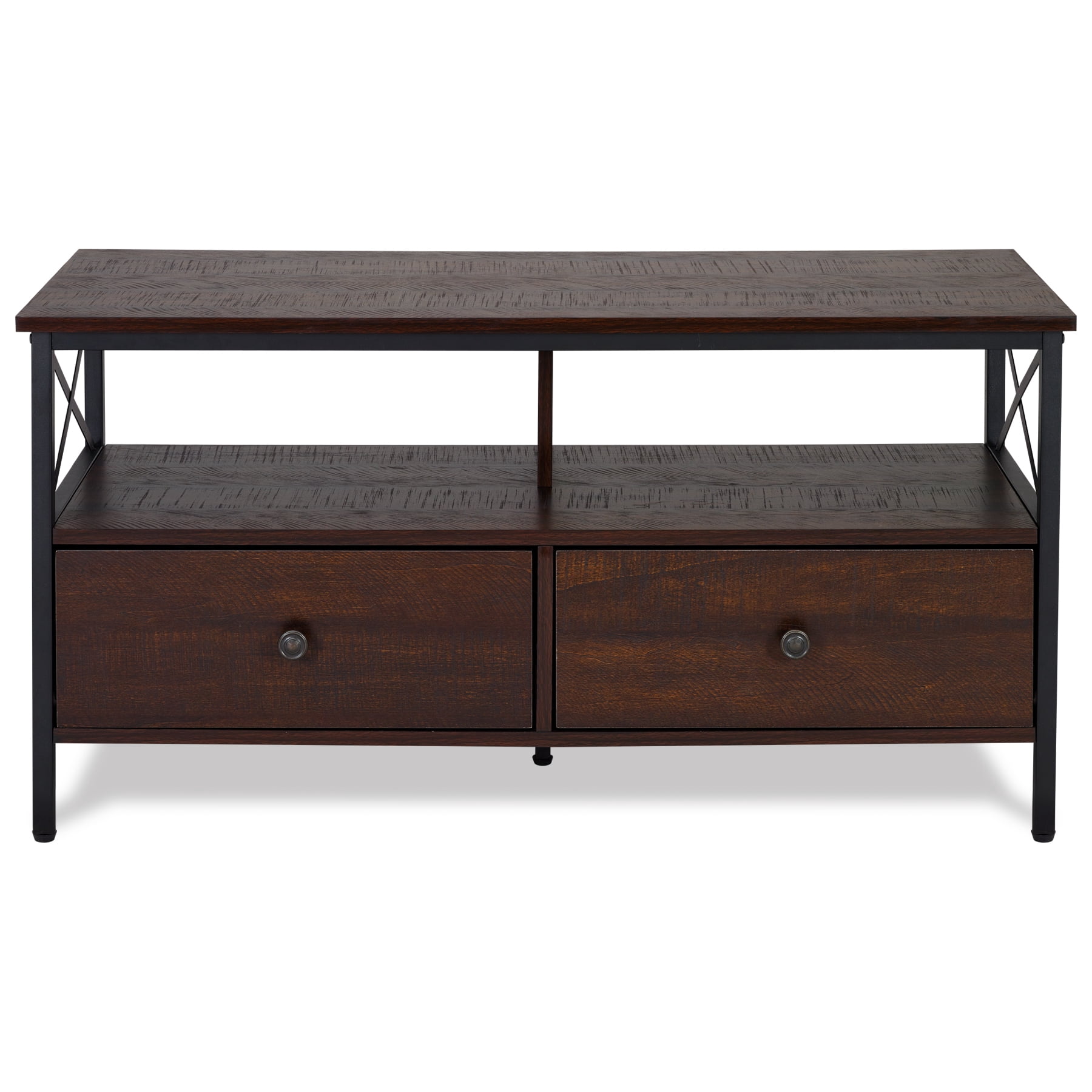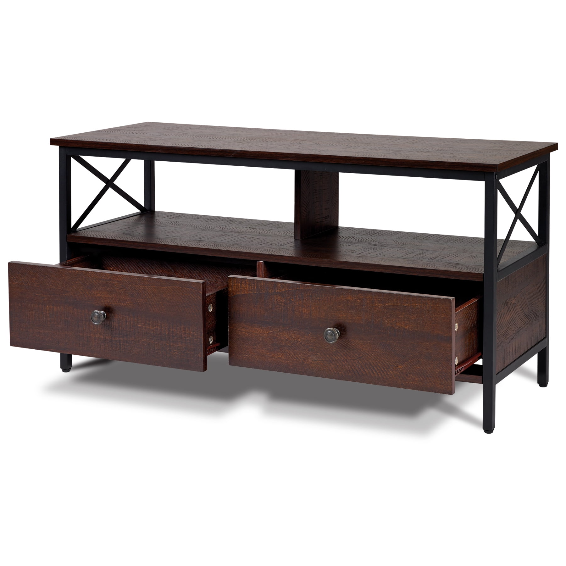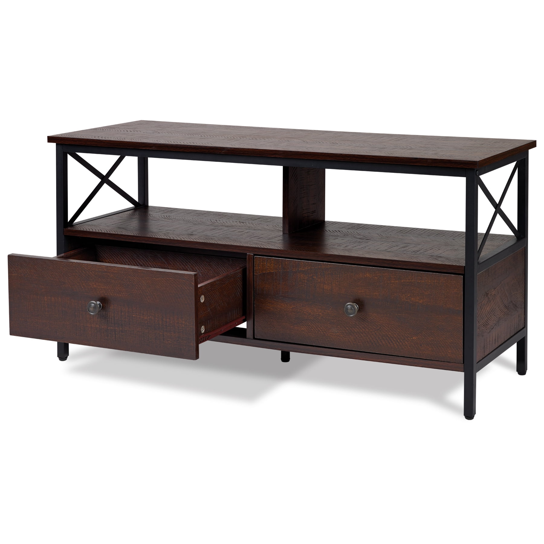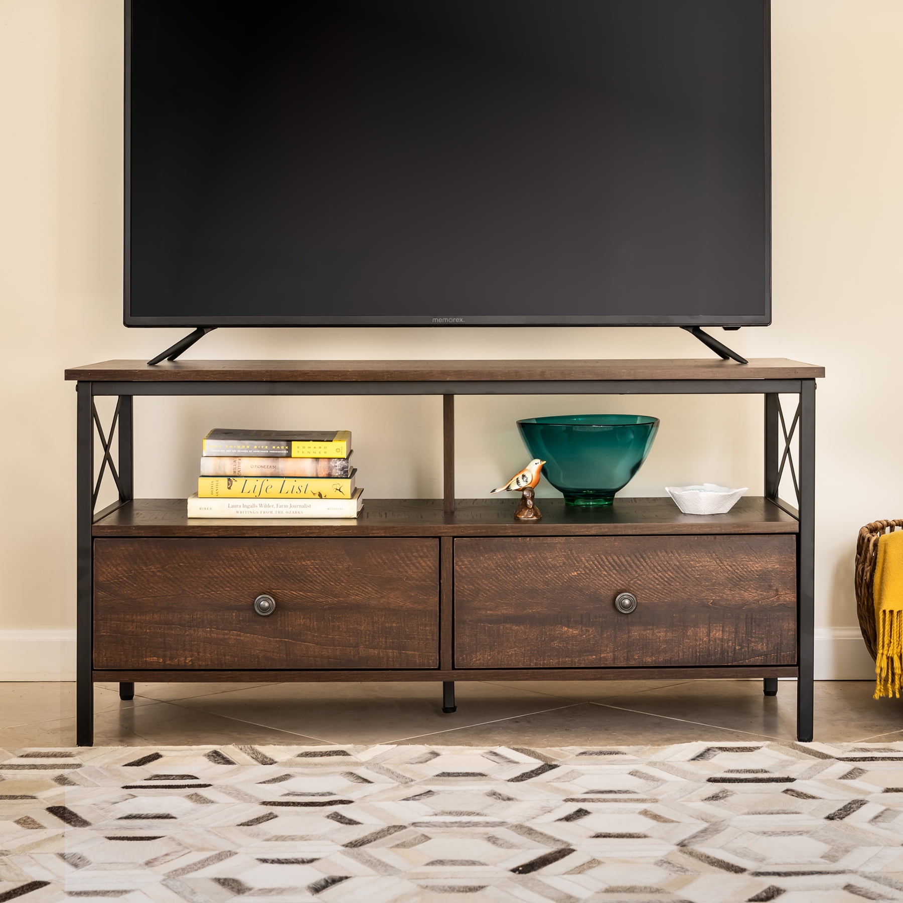 Dimensions: 41.3″ W x 15.7″ D x 20.7″ H inches Sleek walnut finish Black metal frame and hardware Industrial design style Wood and metal construction 2 Storage drawers Assembly required, hardware and instructions included For TVs up to 50″ Maximum weight limit: Top Shelf-132 lbs, Middle Shelf-77 lbs, Drawer-22 lbs 1 Year Limited Warranty User’s Guide and Assembly Instructions
