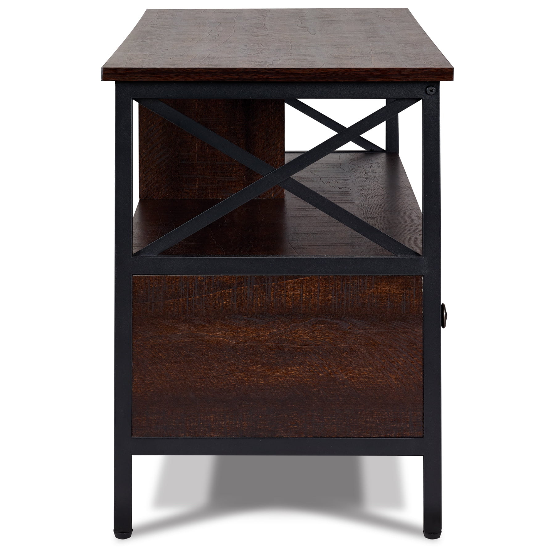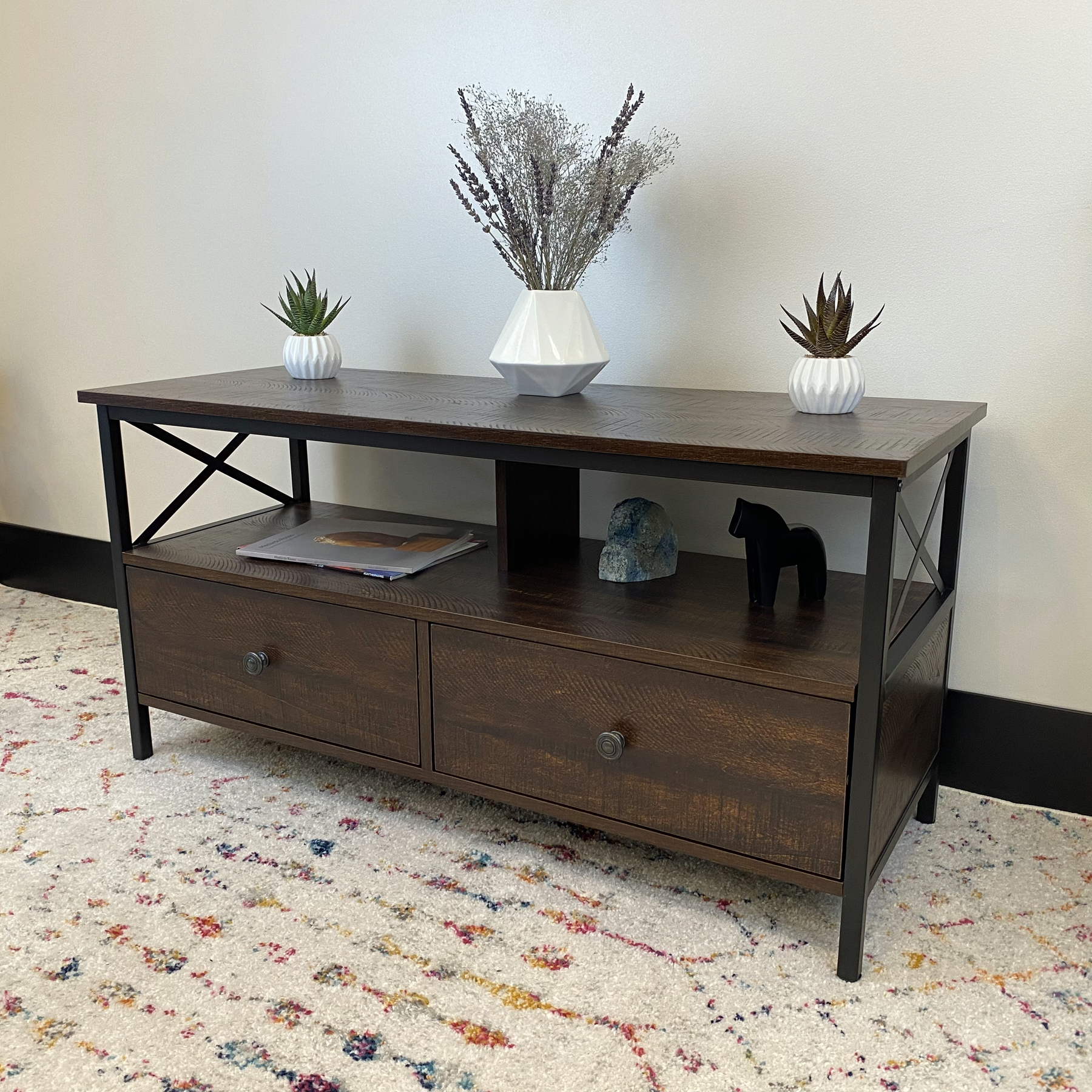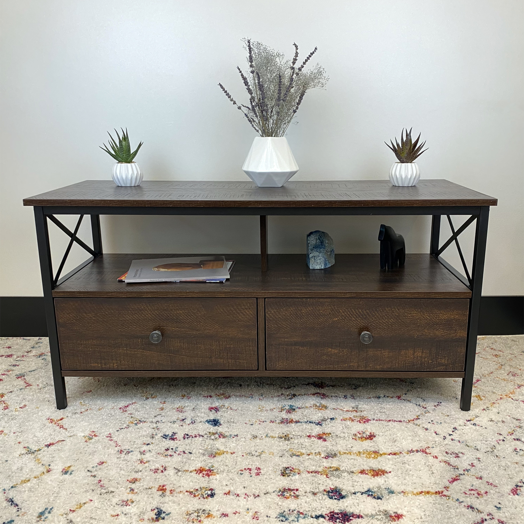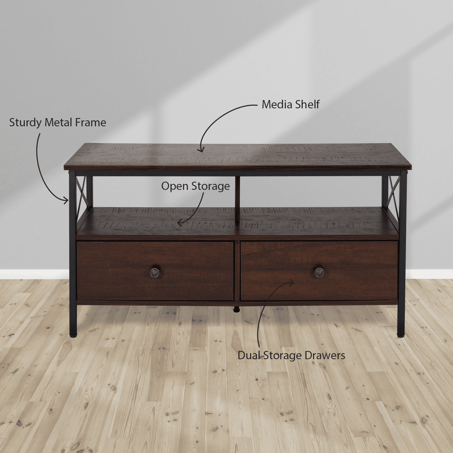 Dimensions: 41.3″ W x 15.7″ D x 20.7″ H inches Sleek walnut finish Black metal frame and hardware Industrial design style Wood and metal construction 2 Storage drawers Assembly required, hardware and instructions included For TVs up to 50″ Maximum weight limit: Top Shelf-132 lbs, Middle Shelf-77 lbs, Drawer-22 lbs 1 Year Limited Warranty User’s Guide and Assembly Instructions