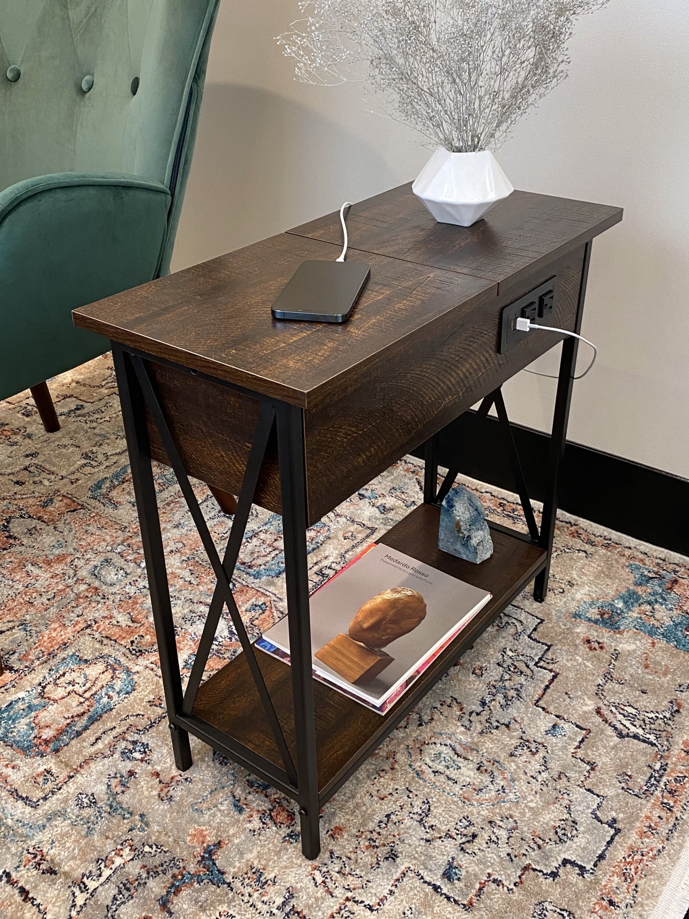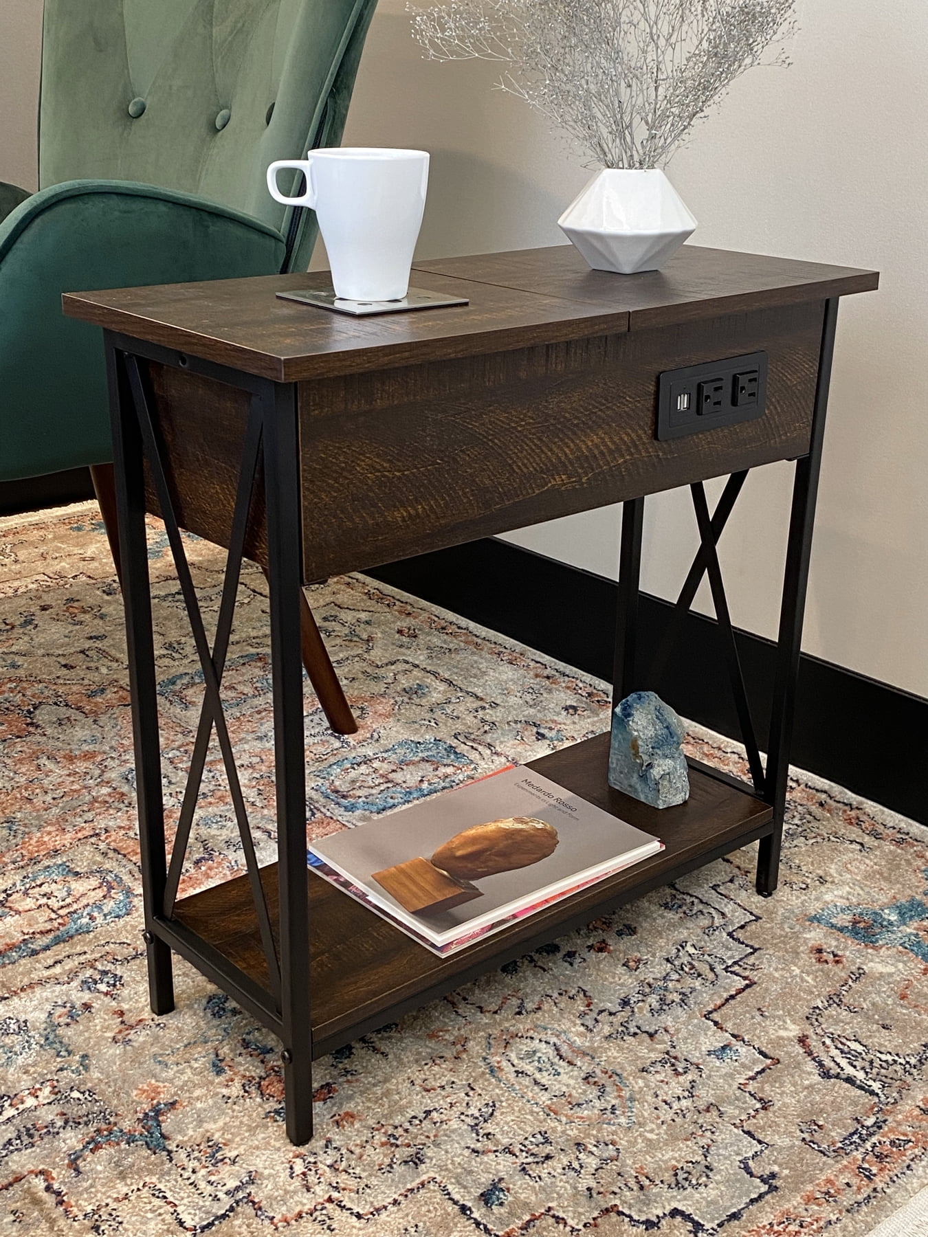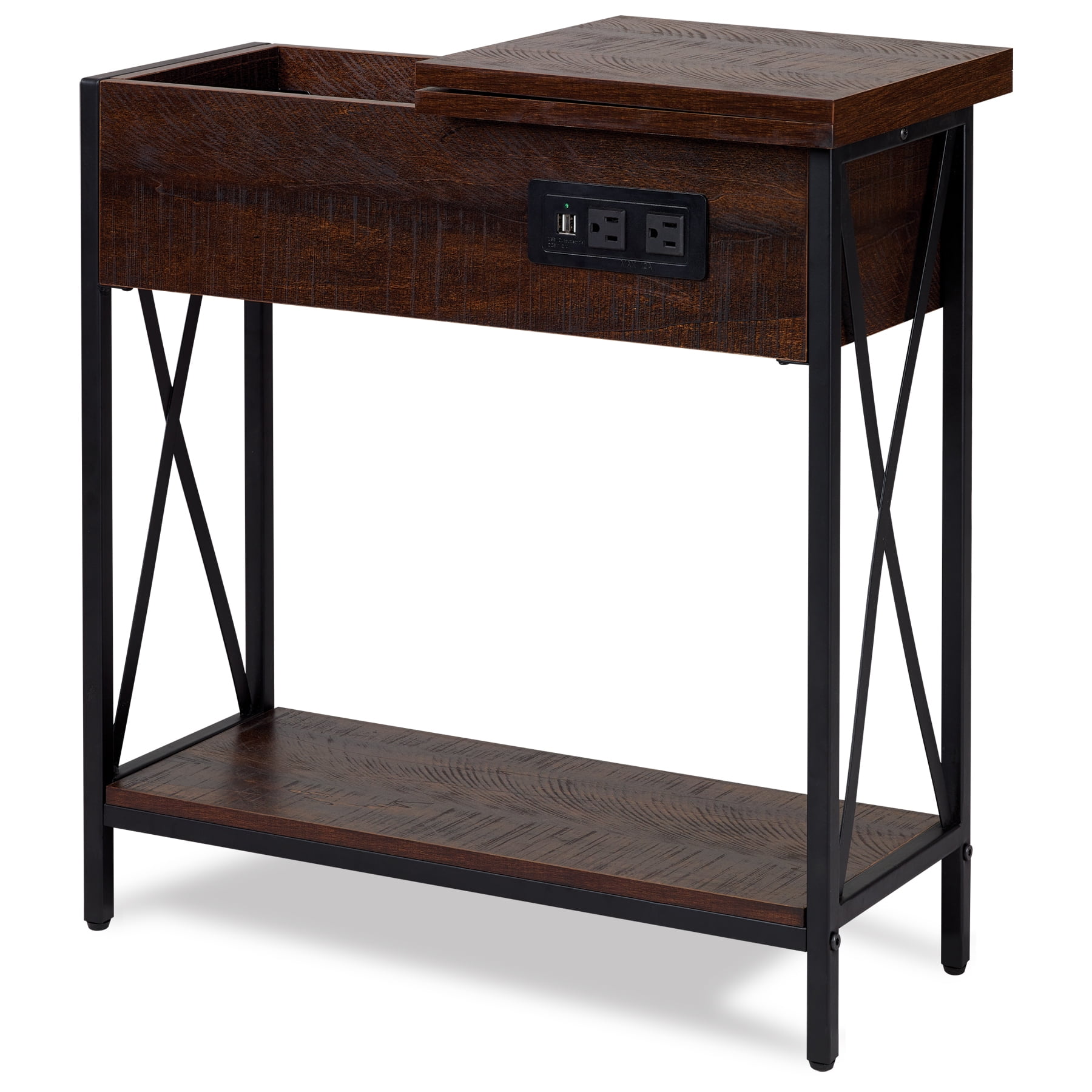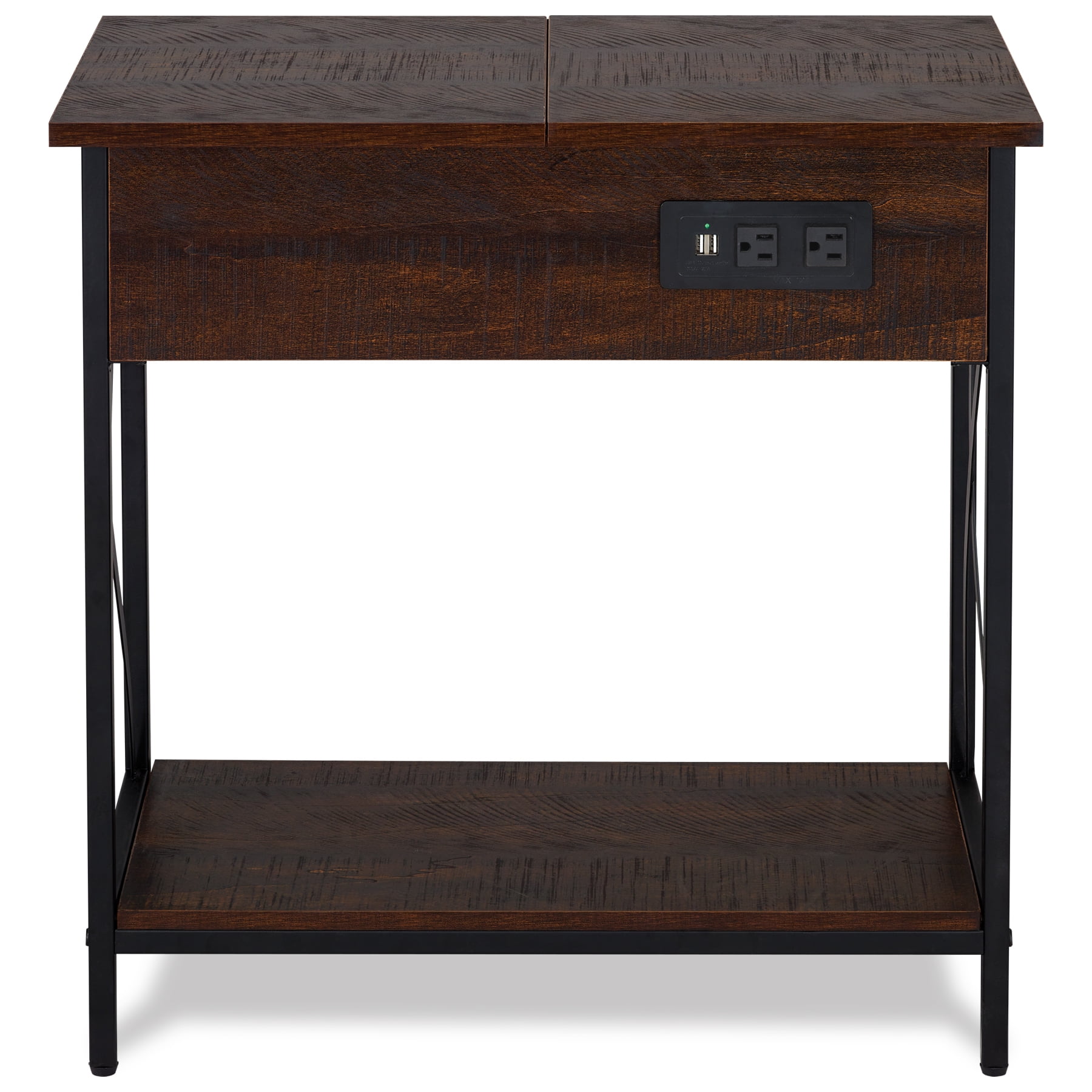 DecorTech Metal and Wood Flip Top End Table with AC Power and USB Charging Ports, Walnut