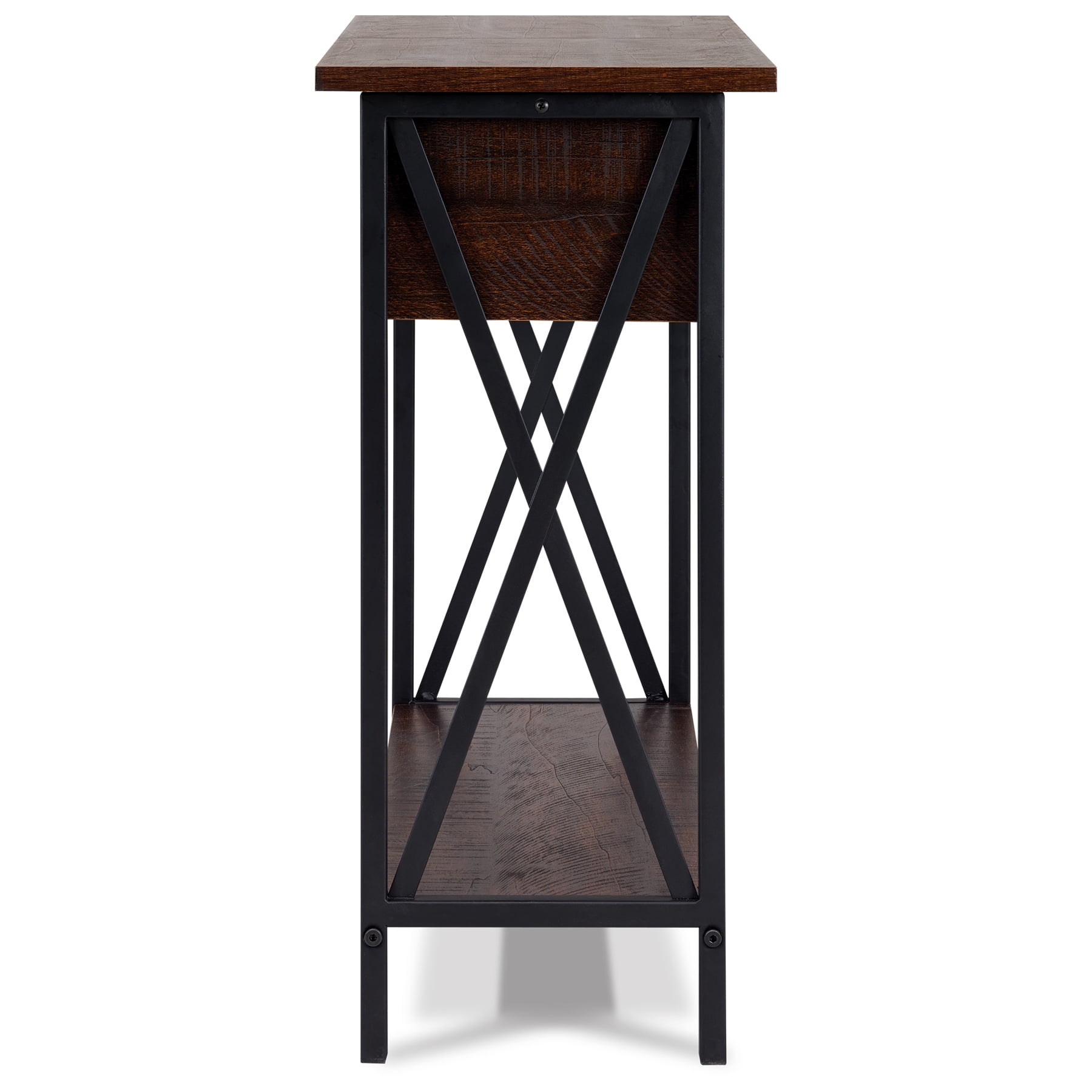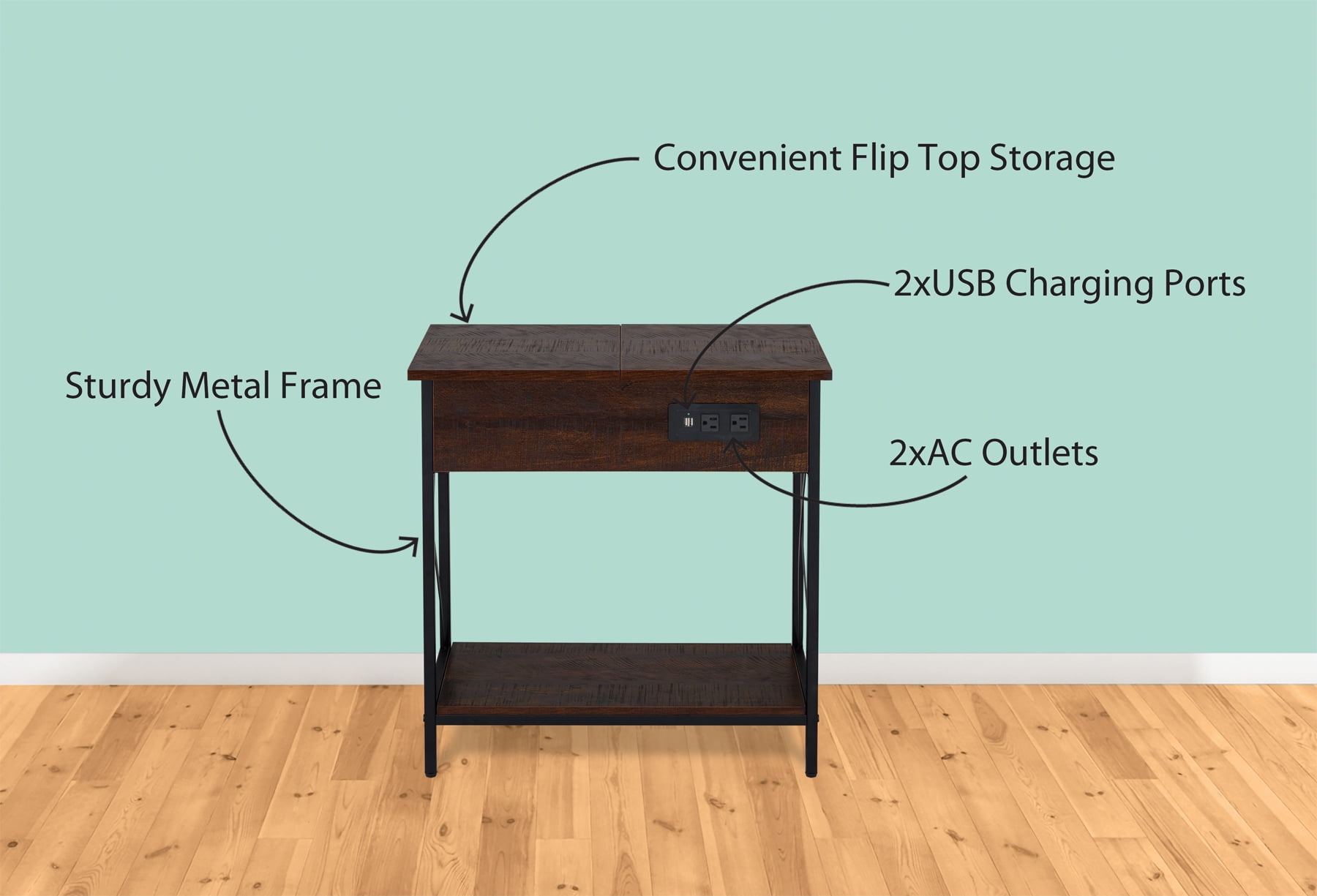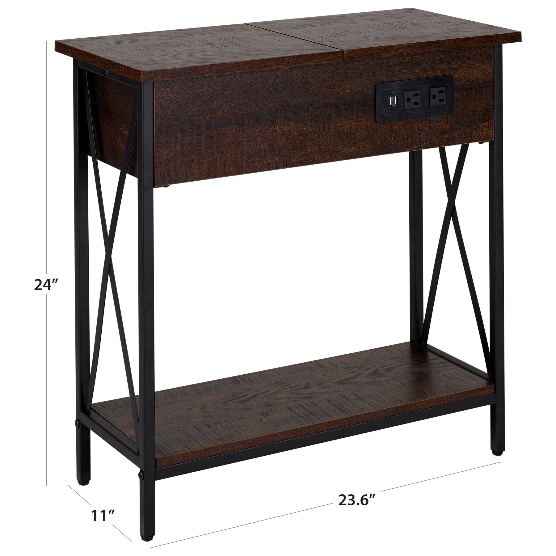 Dimensions: 11″ W x 23.6″ D x 24″ H inches Sleek walnut finish 2 AC receptacles (120V/12A 60Hz total) 2 USB ports (5V/2.1A total) Table with flip top storage and an underneath shelf Black metal frame Adjustable feet for leveling Maximum weight limit: Top Shelf-22 lbs, Bottom Shelf-44 lbs Includes: AC cord set with AC sockets and USB ports Assembly required, hardware and instructions included 1 Year Limited Warranty User’s guide