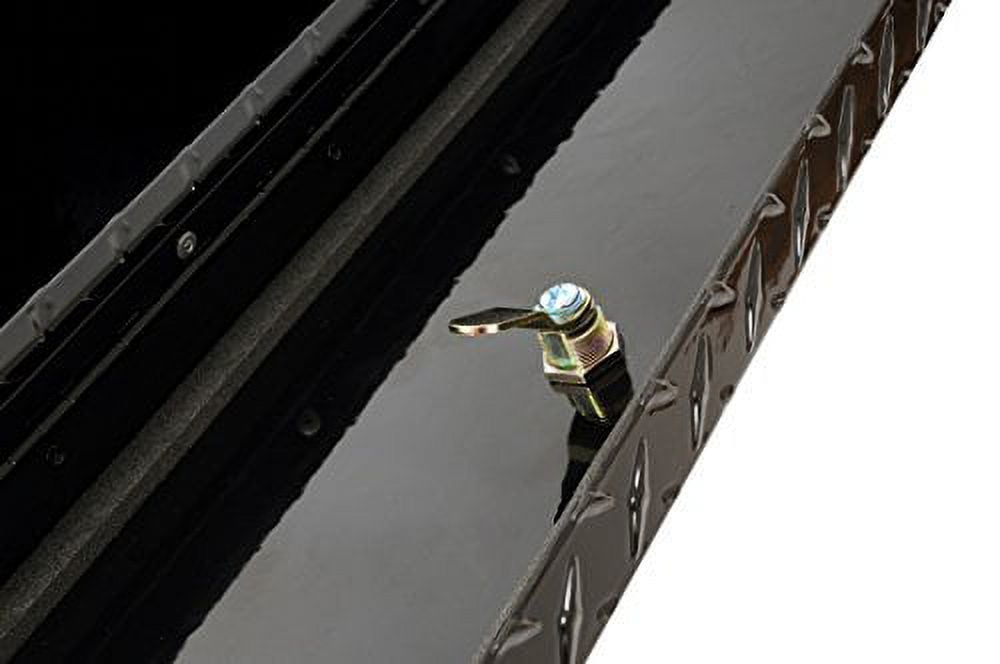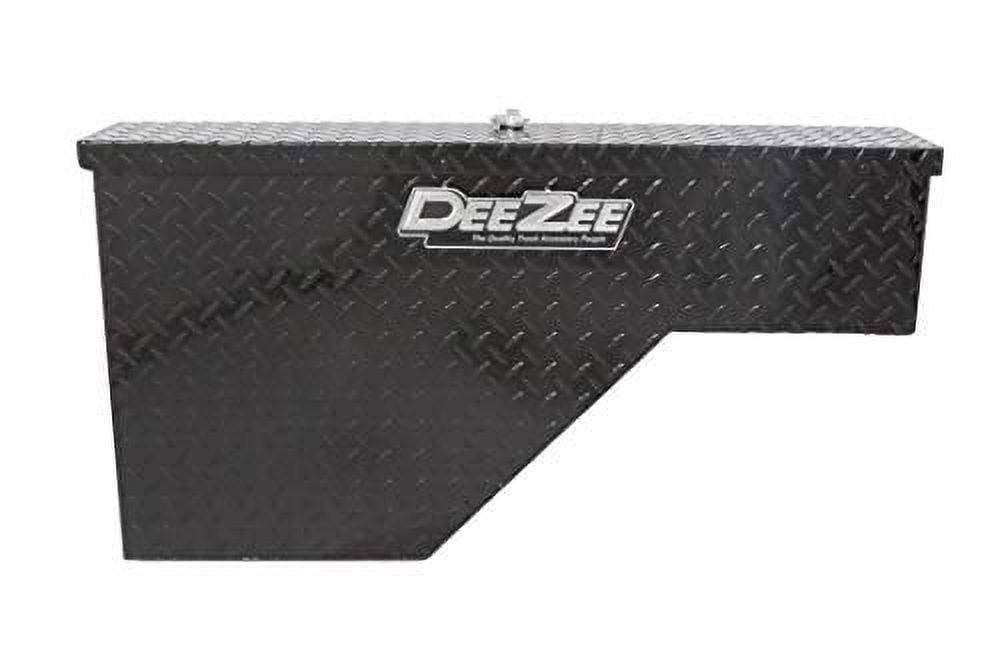 Dee Zee Specialty Series Wheel Well Tool Box; .056 Black Tread Aluminum; Gloss Black; Volume 2.2 cu. ft.; L 37 in. x W 7.75 in. x H 19.5 in.; L-1 14 in./ H-2 8.5 in.; Driver Side;