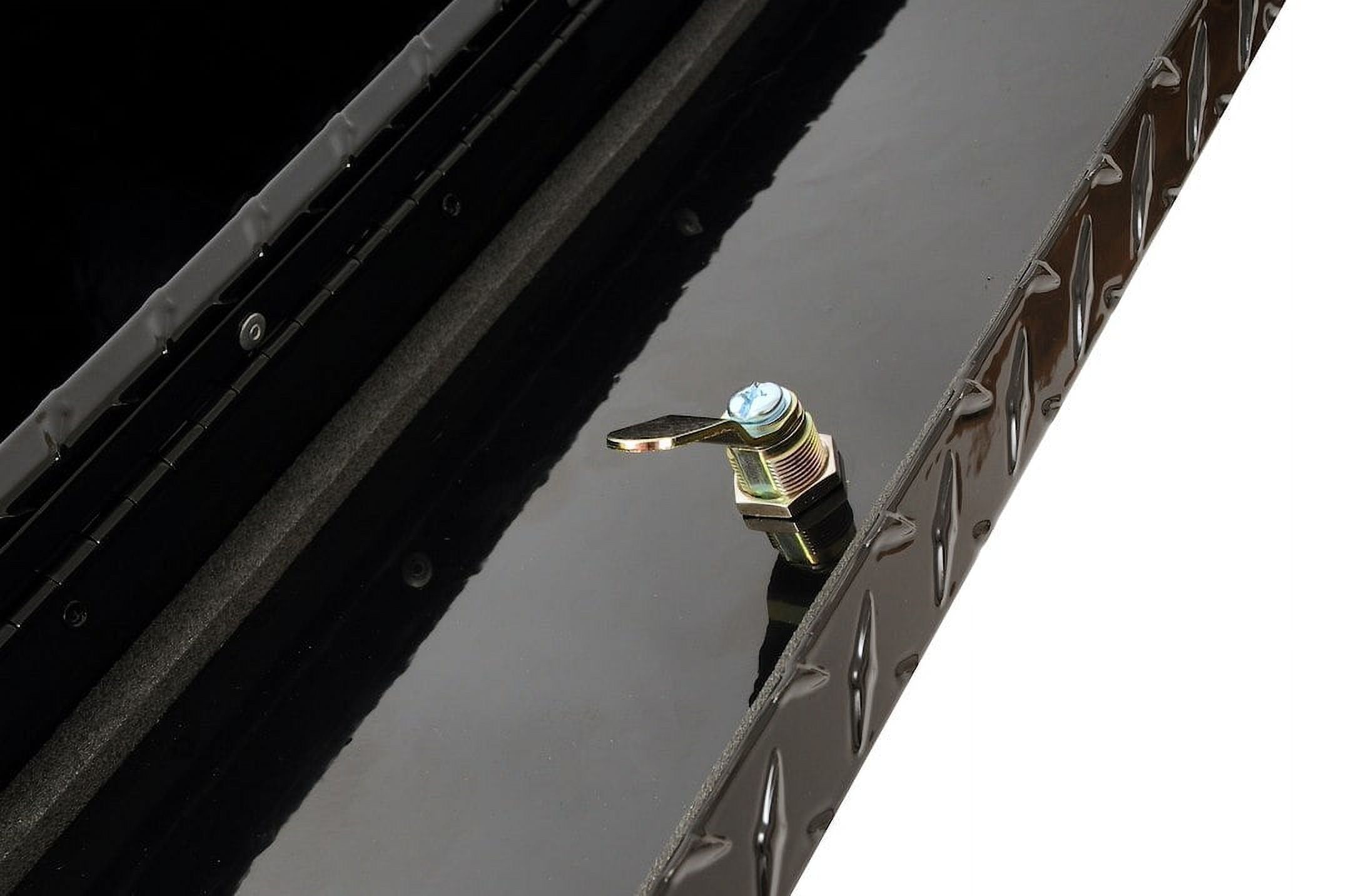 Non-Rusting 0.056 Brite-Tread Aluminum w/ Protective Gloss Black Powder Coat Fits Behind The Truck Wheel Well Passenger Side Application Sturdy Piano Hinge Lid w/ Lockable Lift-Up Lid Limited-Lifetime Warranty