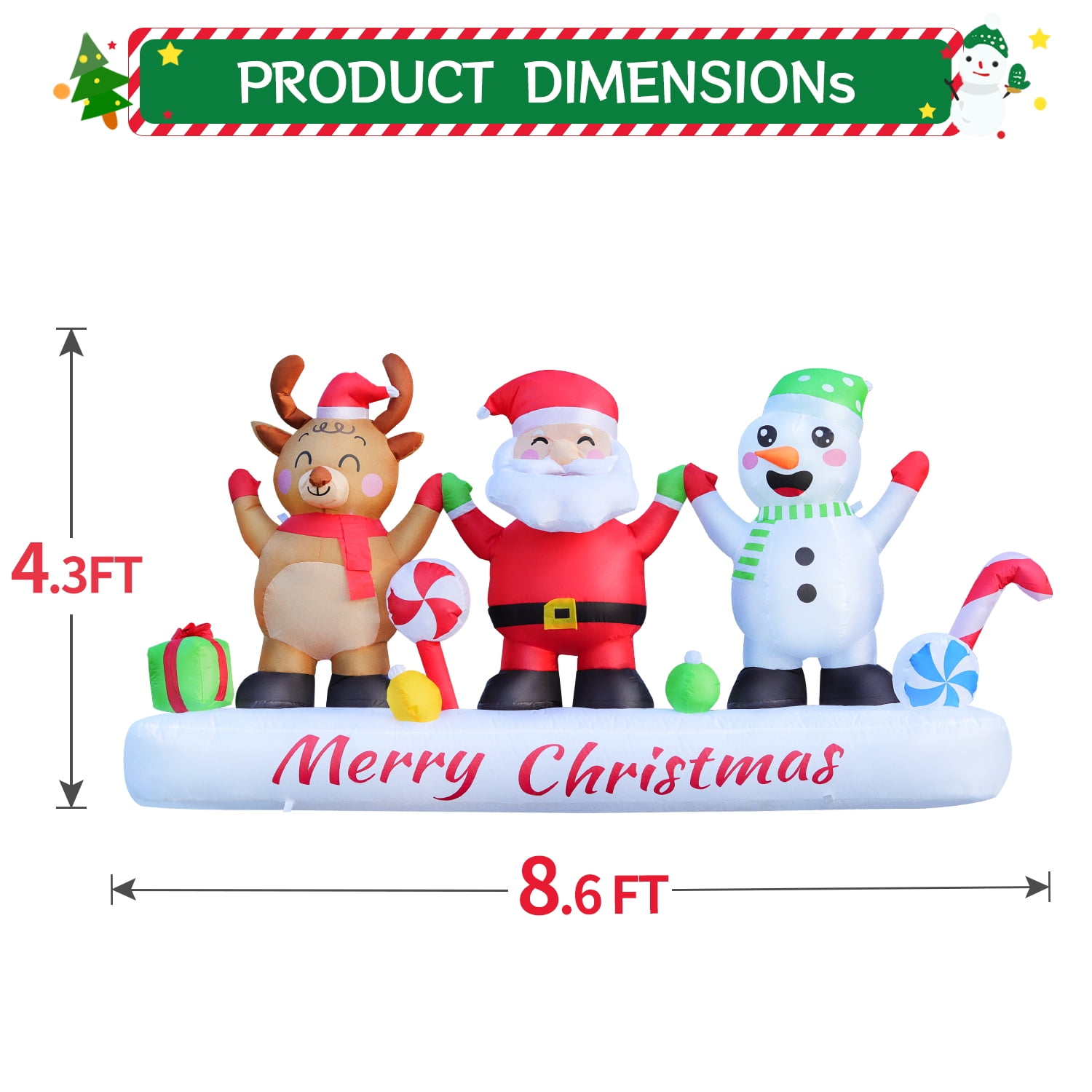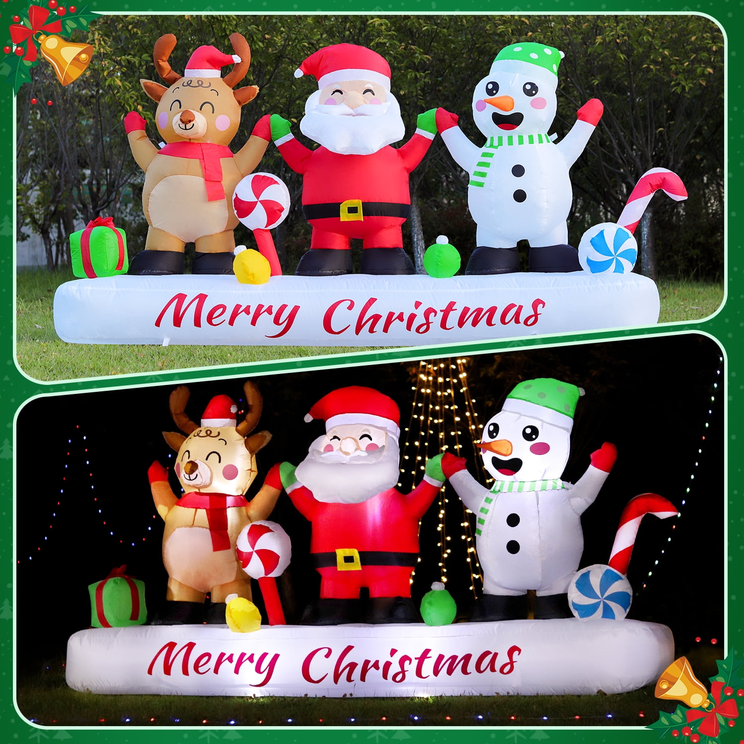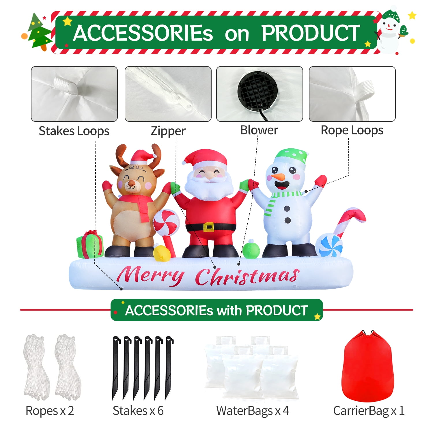 [8′ Christmas Inflatable Banner] This Christmas inflatable decoration is an exclusive original design. Blow up Banner with Santa Claus, reindder and snowman. This Christmas blow up decor adds a festive atmosphere to your holiday season. It can be used to decorate your yard or placed indoors, and can even be placed on the roof to spread holiday cheer from afar. [ Bright LED Lights ] This CHRISTMAS blow-up decor features built-in bright LED lights that illuminate during holiday nights, creating a festive atmosphere and captivating your neighbors and guests. [ Simply to Use ] Plug in the plug, zip up the zipper, stake it securely into the ground (outdoor use), and pull the ropes. In just a few minutes, it will inflate automatically. The packaging box contains the necessary accessories. [ Size and Package] 8ft ; 4 water bags, 2 ropes, 6 stakes