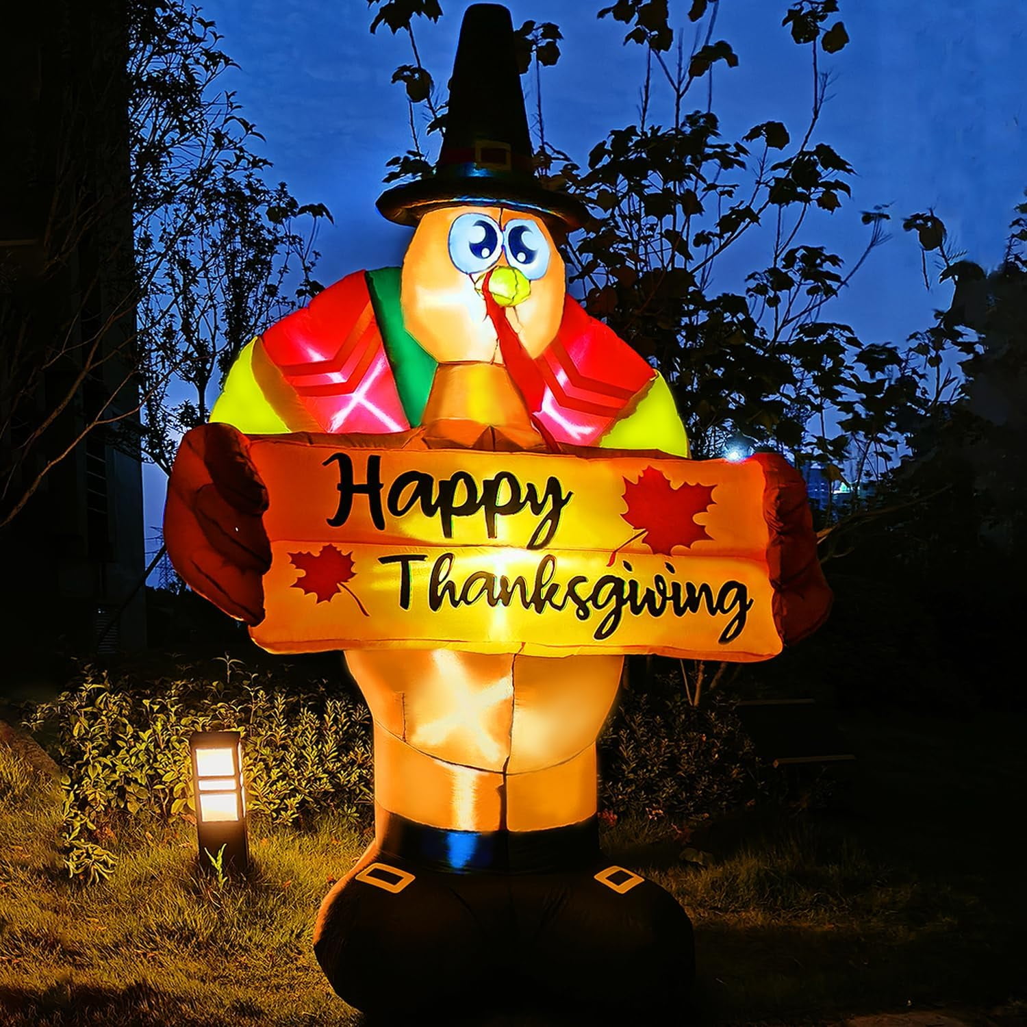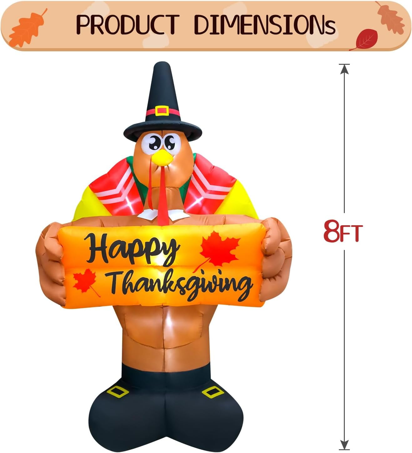 [8′ Thanksgiving Inflatable Turkey] This thanksgiving inflatable decoration is an exclusive original design. This blowup turkey decor holds a banner with best wishes. This harvest blow up decor adds a festive atmosphere to your holiday season. It can be used to decorate your yard or placed indoors to spread holiday cheer from afar. [ Bright LED Lights ] This THANKSGIVING blow-up decor features built-in bright LED lights that illuminate during holiday nights, creating a festive atmosphere and captivating your neighbors and guests. [ Simply to Use ] Plug in the plug, zip up the zipper, stake it securely into the ground (outdoor use), and pull the ropes. In just a few minutes, it will inflate automatically. The packaging box contains the necessary accessories. [ Size and Package] 8ft ; 4 water bags, 2 ropes, 4 stakes