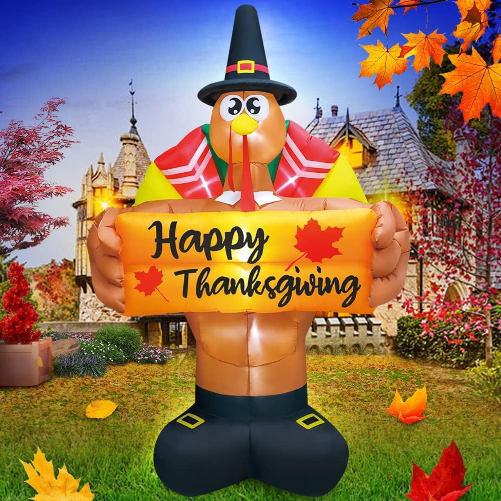 DeeKom 8′ Thanksgiving Inflatable Outdoor Decorations, Giant Blow up Turkey with Banner, Built-in LEDs for Lawn Yard Garden Party Festival Celebration
