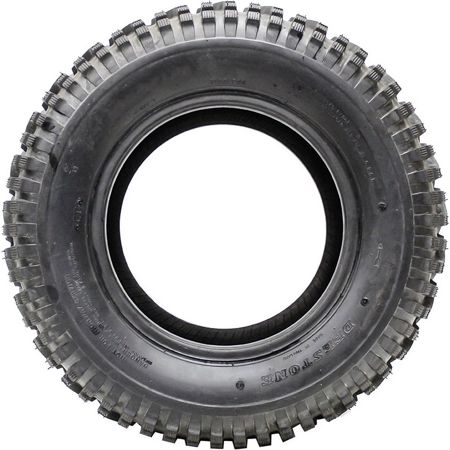 Deestone D930 FEATURES AND BENEFITS Mud terrain traction Self-cleaning tread design Improved durability OVERVIEW The Deestone D930 is a mud terrain, all season tire manufactured for ATVs and UTVs. The tire offers excellent off-road traction. The tread’s directional lug placement and the shoulder and sidewall lugs upgrade the soft and loose terrain gripping capability. The better traction enables the tire’s performing ability on various off-road conditions as they improve the grip on the terrain surface. These tread elements ensure the tire’s forward motion in deep mud and loose dirt, as they provide side biting edges that grip the surface significantly. The upgraded terrain grip guarantees a secure driving experience. The tread pattern also keeps a clean footprint at all times. The directional lug placement and the high void ratio boost the model’s mud and snow elimination and rock ejecting capability. The tread, in this manner, ensures a clean footprint by preventing snow and mud from packing between the tread elements and blocking the tire’s contact with the terrain surface. It also resists stone retention from harming the casing by drilling rocks into it. The tread’s self-cleaning capability ensures high driving safety levels. The D930 features a reinforced nylon structure. This construction maintains the ideal tire shape under the driving and load pressure affecting the model. It actively resists the deformation of the tire shape during the tire’s performance. The stronger internal structure also strengthens the tire against off-road damage. Punctures, bruises and impact damage cannot harm the tire’s casing and they cannot shorten the tire’s service life. This tire has a BIASED ply structure. When it comes to ATV tires, there might be slight visual differences between brands and models even if the tires are of the same size. NOT FOR HIGHWAY USE: This tire model is not DOT-approved for highway use. Manufacturers recommend changing tires every 10 years. As long as tires are properly stored before they are sold, the year of their manufacture will not shorten their service life.