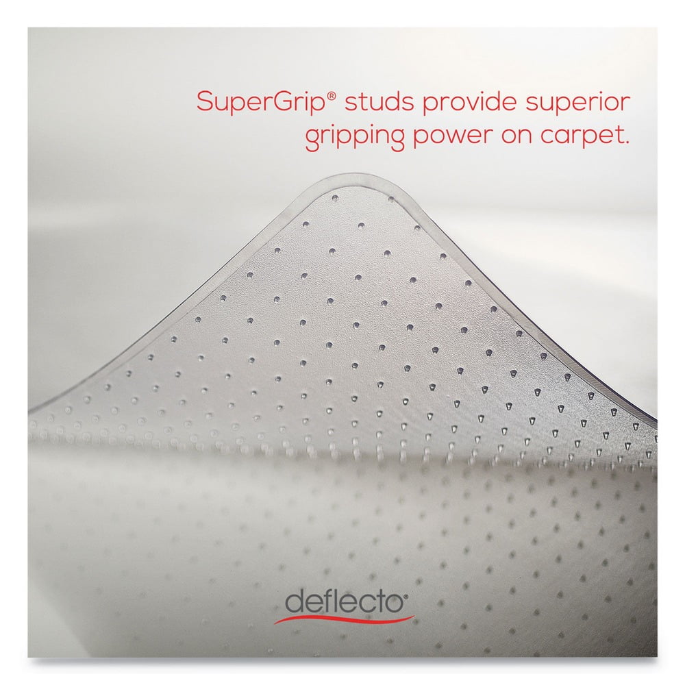 Thinner, lightweight Deflecto EconoMat® delivers a great value to anyone looking for an occasional-use office chair mat to protect low pile and commercial carpets up to 1/4″ thick. Easy-glide rolling surface provides smooth office chair movement to help minimize stress and strain on users back, legs and feet. Studded design grips carpet and keeps the chair mat from moving while protecting floors from caster wear, spills and heavy traffic. Free and Clear® non-orthophthalate, non-cadmium formula promotes a healthy work environment while offering exceptional clarity without harsh chemicals.