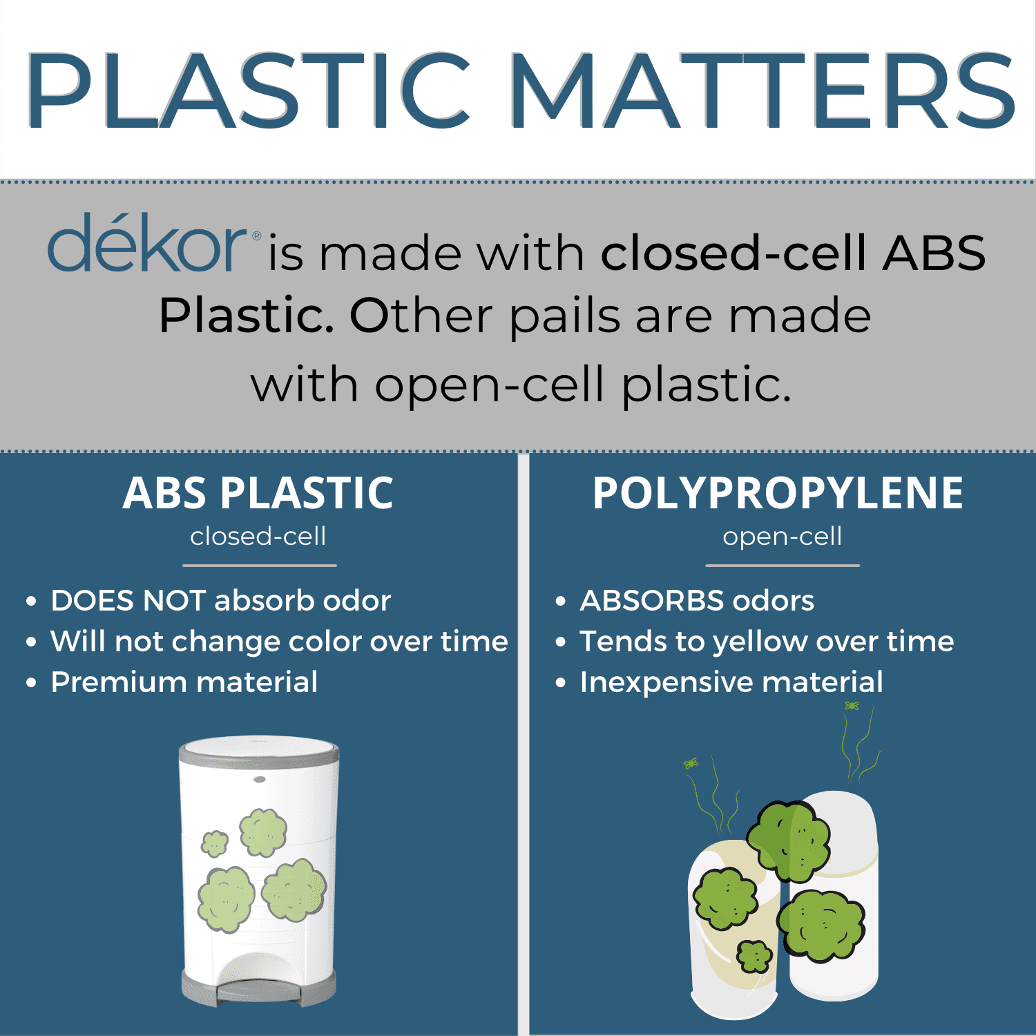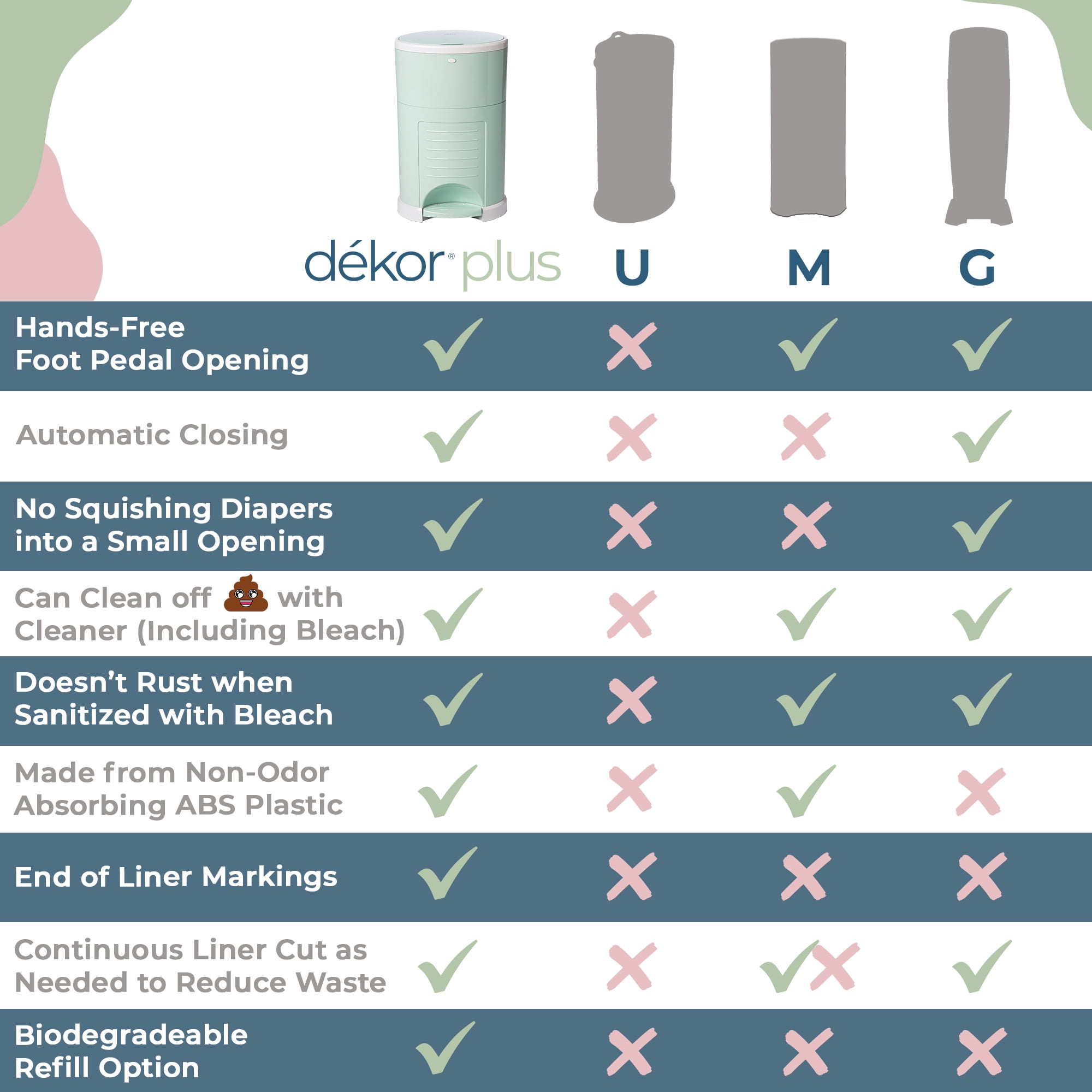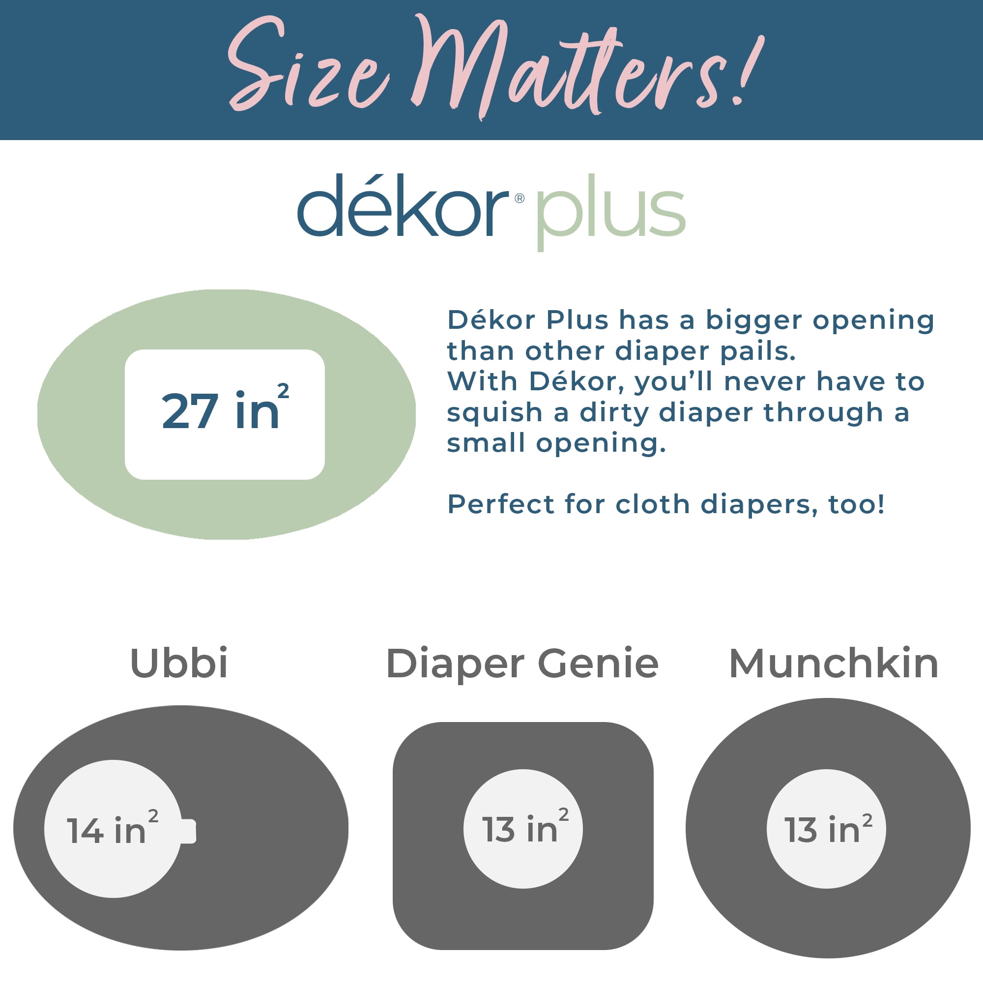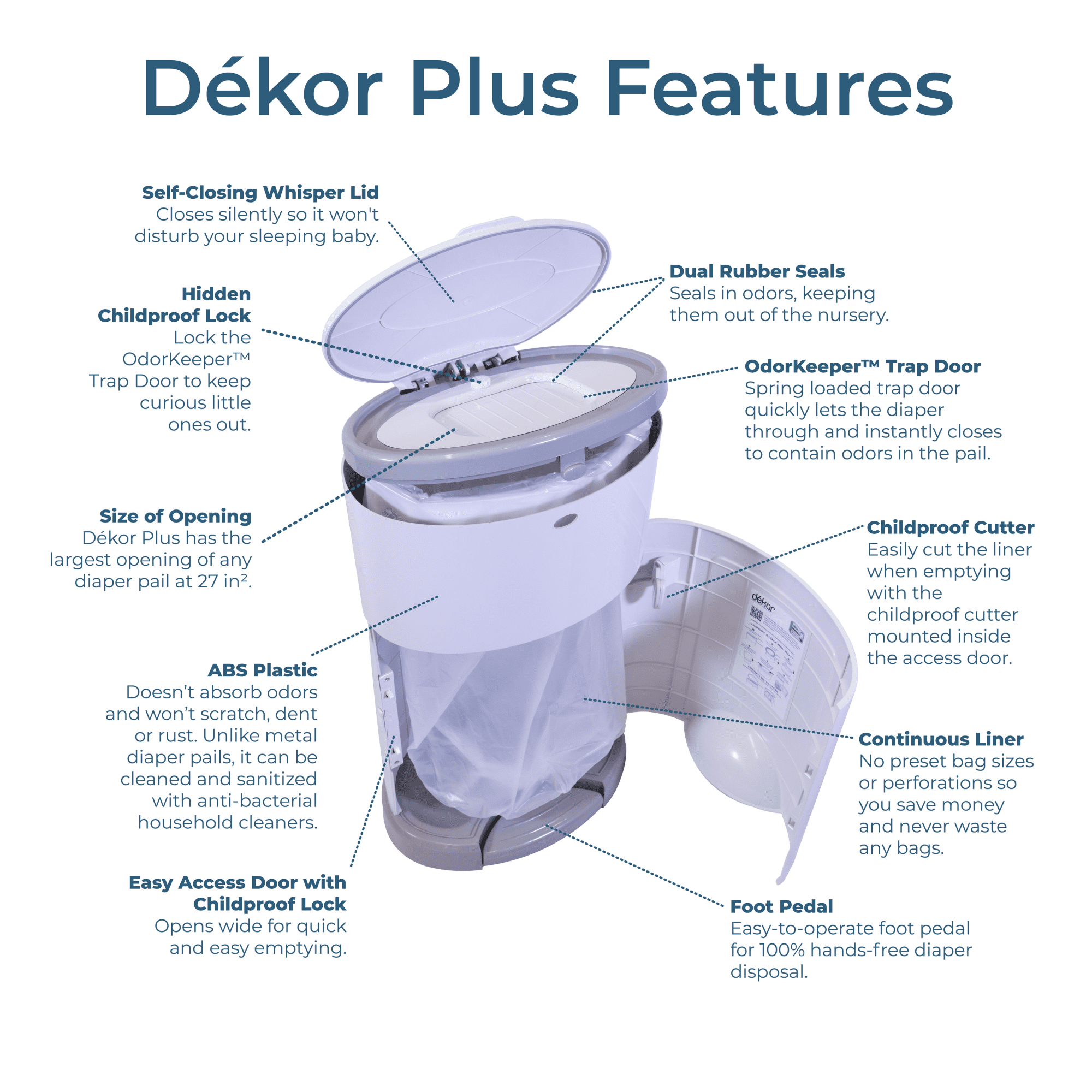 You will change 6,000-9,000 diapers before your child is potty trained! We found a much simpler way to dispose of them! Dekor Hands-Free Diaper Pails are designed to make this unpleasant chore as easy as possible for parents.Unlike other disposal systems where you have to bend over, operate a lid, or even shove a soiled diaper inside the diaper pail, Dekor Diaper Pails are 100% hands-free. After a diaper change, you are likely to have baby in one arm and the soiled diaper in the other. No one has a third hand to operate the diaper pail. Just STEP on the foot pedal, DROP the soiled diaper through the trap door, and you’re DONE!Unlike the competition, Dekor is made with ABS closed-cell plastic that doesn’t absorb odors over time, and it’s safe to clean with bleach or other household cleaners, unlike metal pails that can only be cleaned with a dry cloth, and can rust.Dekor refills are one continuous liner so you can empty as often as you want and they hold more diapers per refill than the competition!Dekor Diaper Pails come in 3 sizes: Plus, Classic and Mini. Dekor Plus has the largest opening and can accommodate 60 Newborn Diapers at full capacity. It is great for cloth diapers with the addition of our Cloth Diaper Liner, which can be thrown right in the washer.