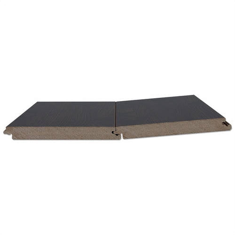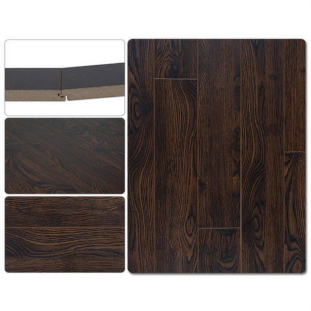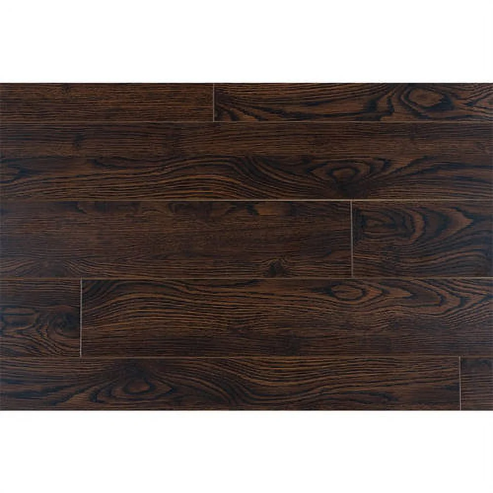 Crystal surface laminate flooring features a roasted espresso color.