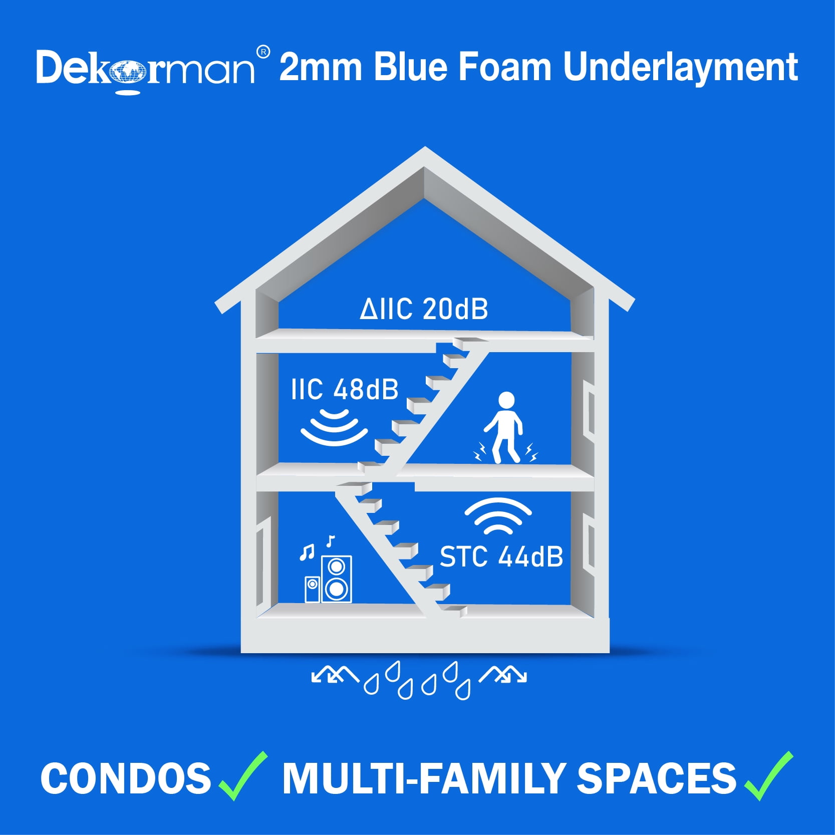 Cover area 500 sq. ft. (100 sq. ft x 5 rolls) 2-N-1 Dekorman Moisture Barrier 2 mm T x 27.9 ft. L x 3.6. W per roll Lightweight, flexible, lays flat Easy installation with attached overlapping lip an tape Features cushioning and reduction in sound transference For use under floated laminate, bamboo and engineered wood floors Dense, closed cell structure offers moisture, mold and mildew resistance IIC (Impact Sound Transmission Test) rating is 48 dB STC (Sound Transmission Class) is 44 dB Sound transmission loss test is 20