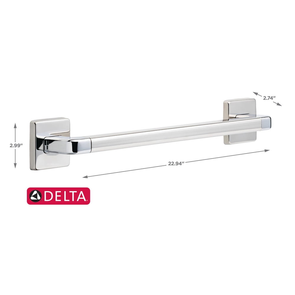 Grab bars provide leverage and support for those moments in your bathroom where you need a little assistance. Grab bars are the perfect addition to any bathroom, for anyone, any age and any ability. They add confidence and independence and most importantly, safety. The modern style provides an uncomplicated, sleek and modern feel that’s bold and geometric for a clean and simple design. The Delta 18″ Angular Modern Decorative ADA Grab Bar in Polished Chrome features a smooth surface for a simple clean look. When installed properly, it will support up to 500 pounds. With only 2-3 screws required for a secure mount, the five screw flange provides installation flexibility to accommodate individual grab bar mounting needs. Delta is committed to the highest standards in quality and safety, and our grab bars are manufactured and tested to exceed many current industry standards.